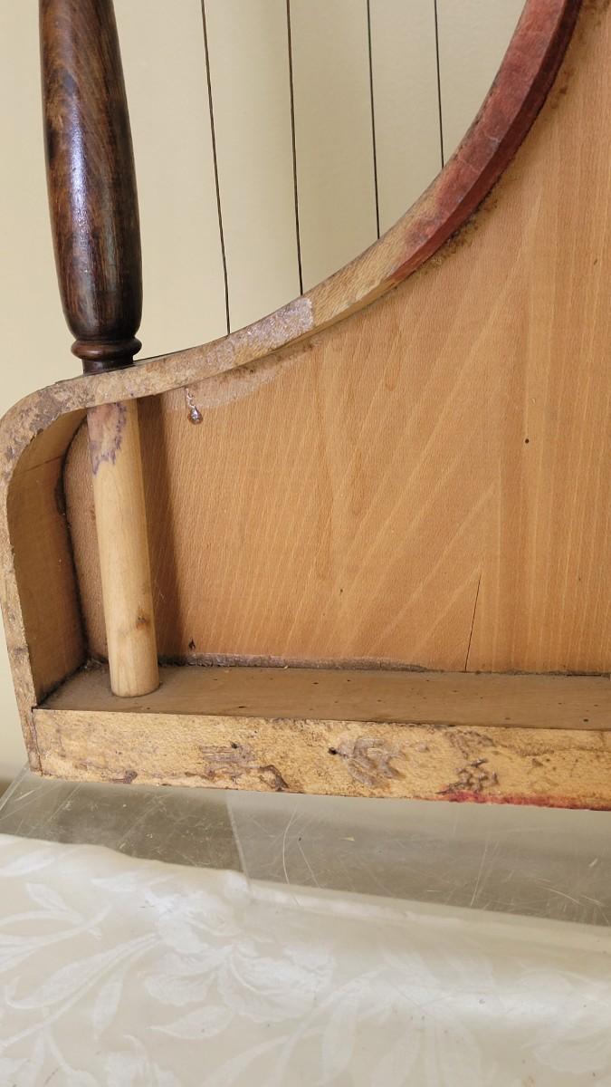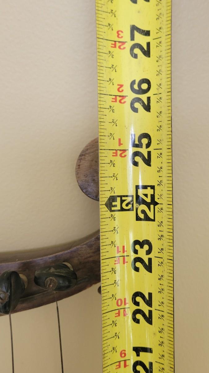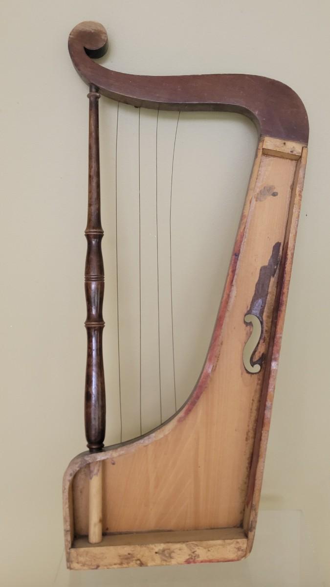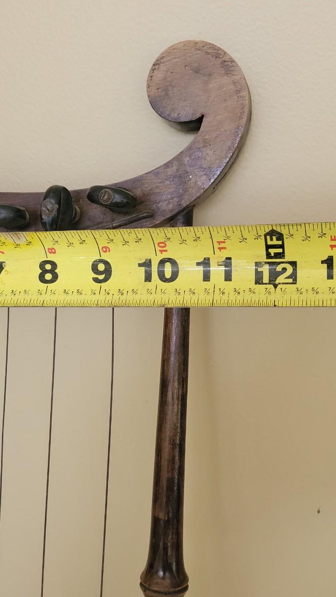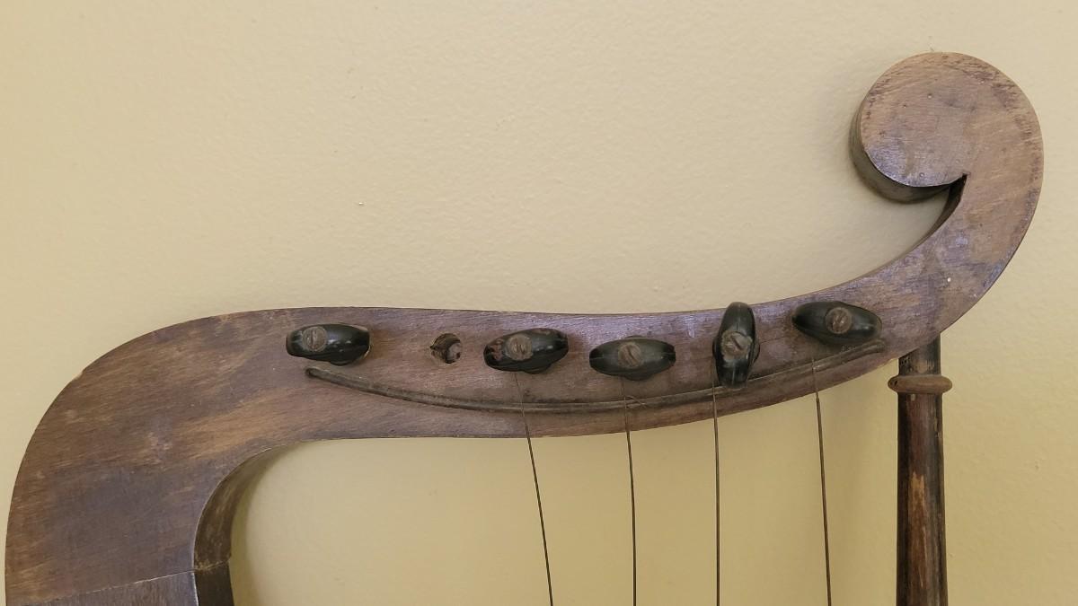 Gold leaf design. Missing 2 stings and one tuning pegs.
