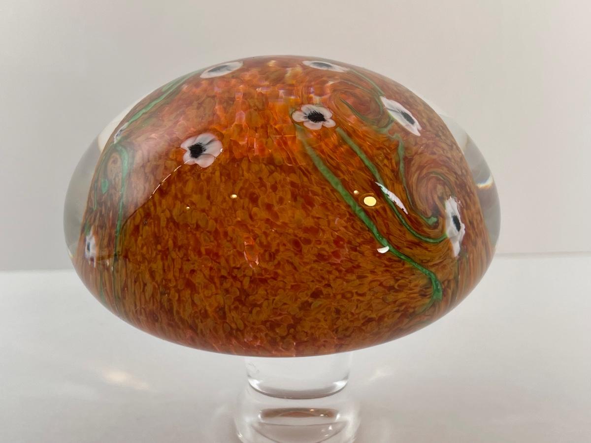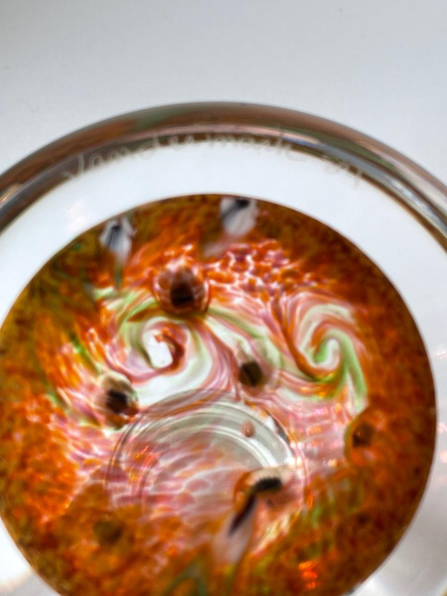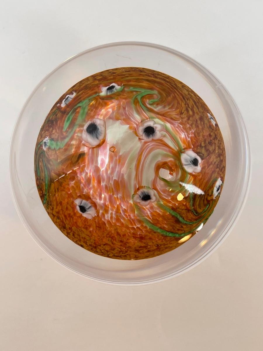 1984 Vandermark Merritt orange speckles/swirls with small white cane blossoms, 3" x 2".