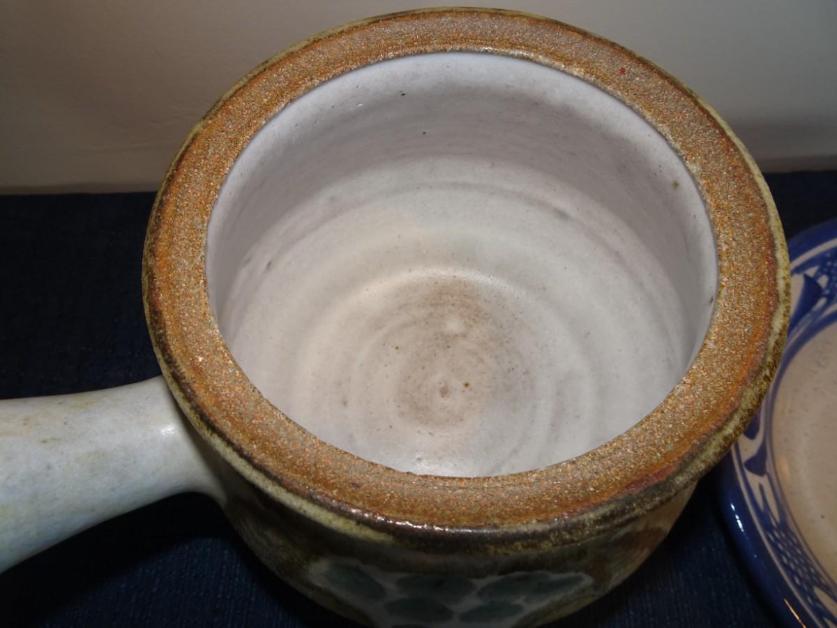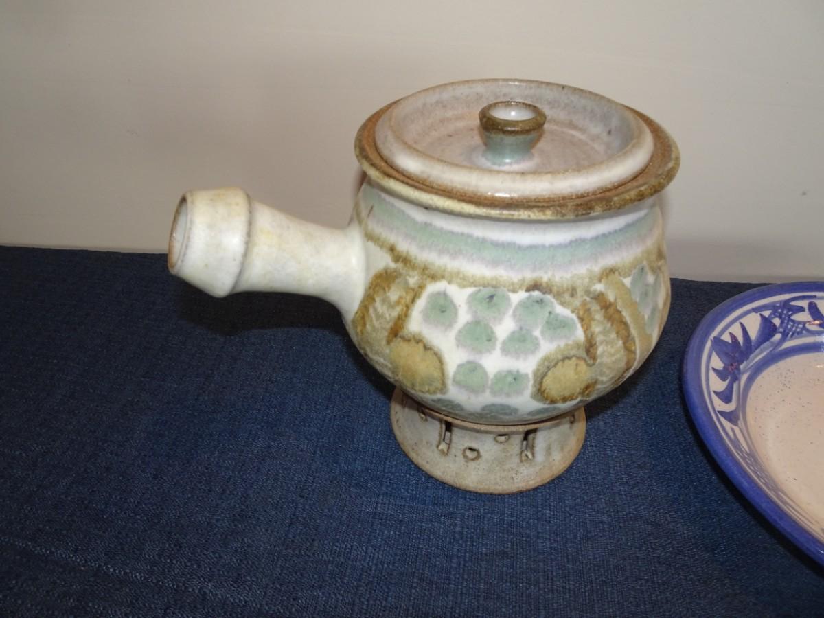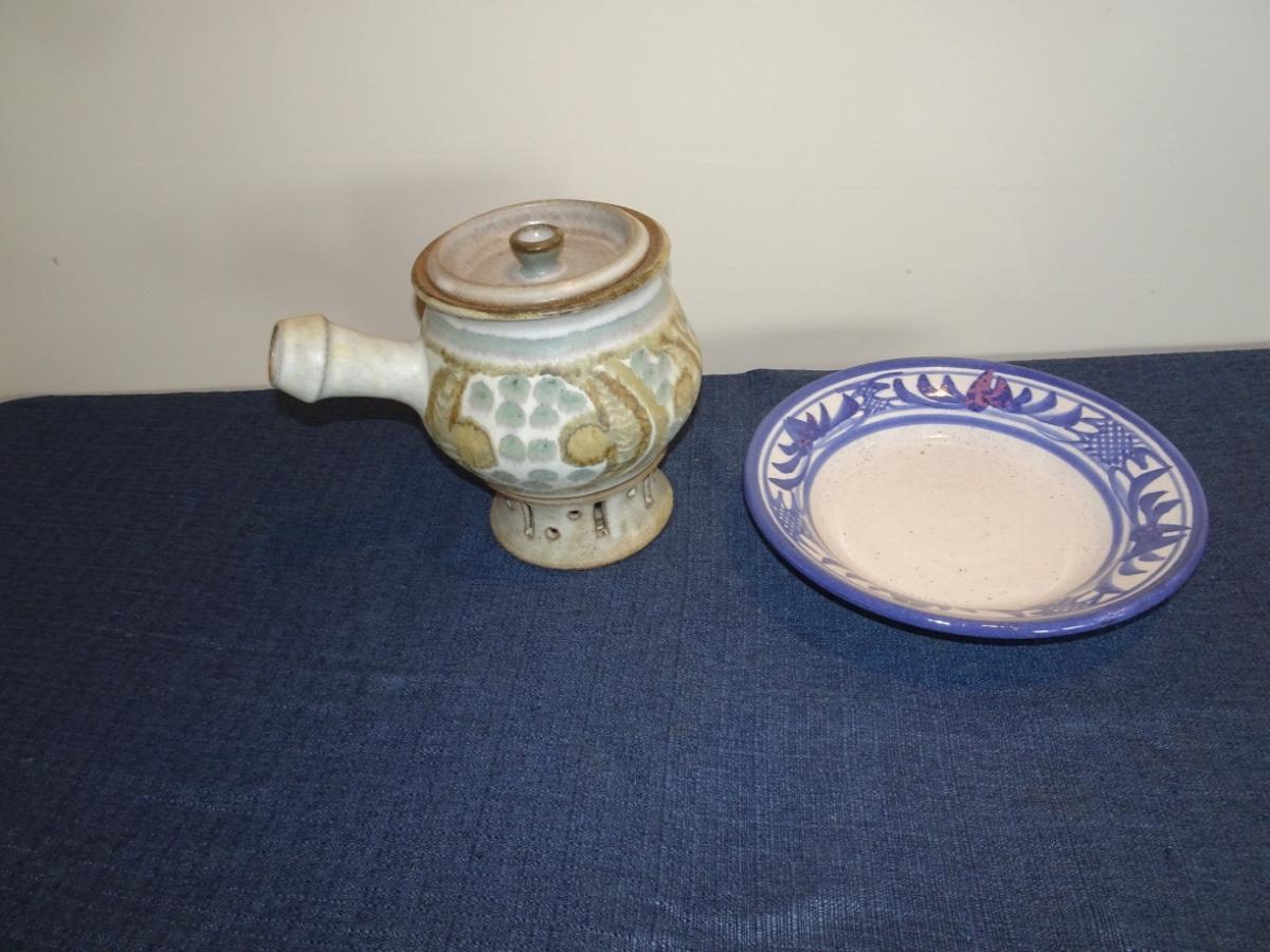 LOT 26. VINTAGE STONEWARE FONDUE POT AND PLATE