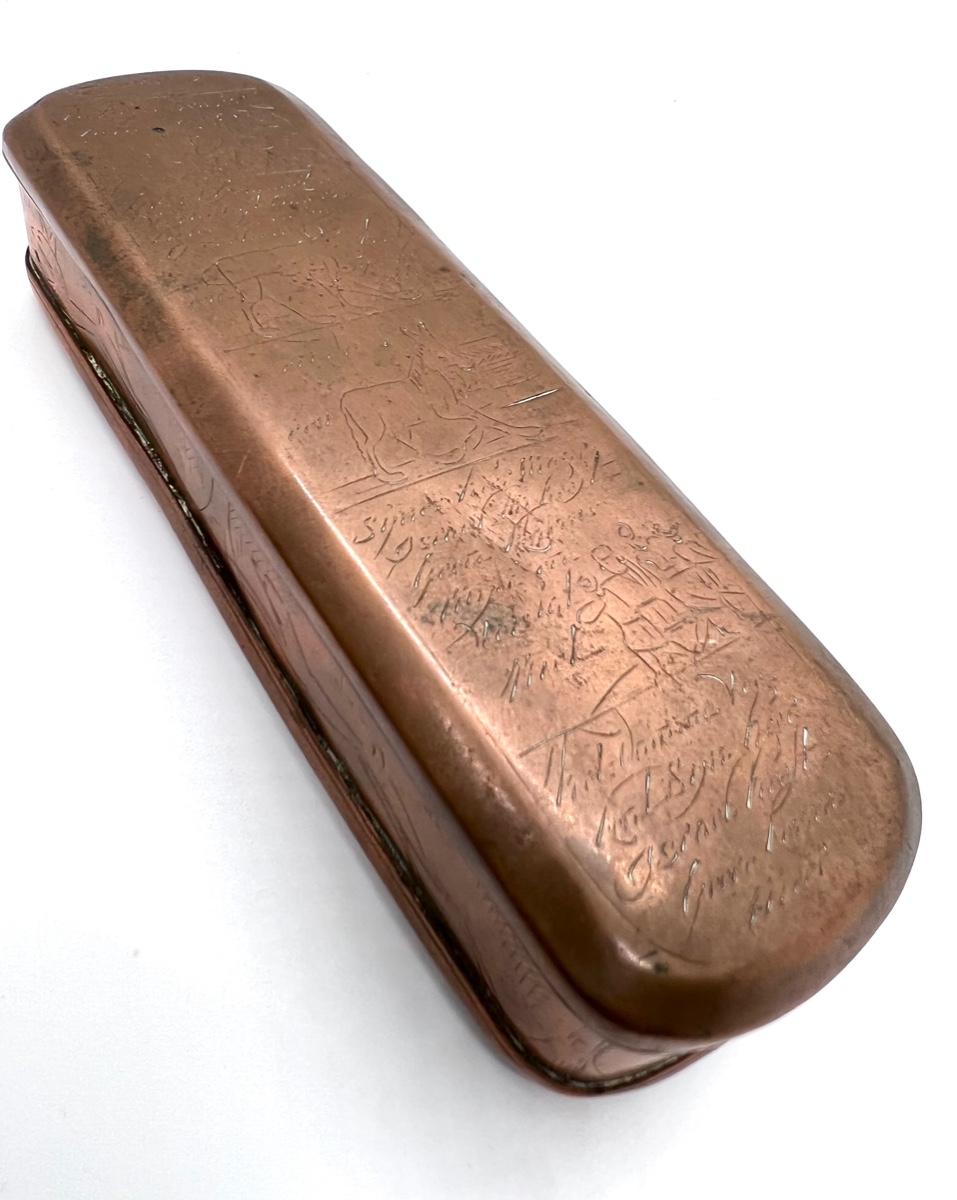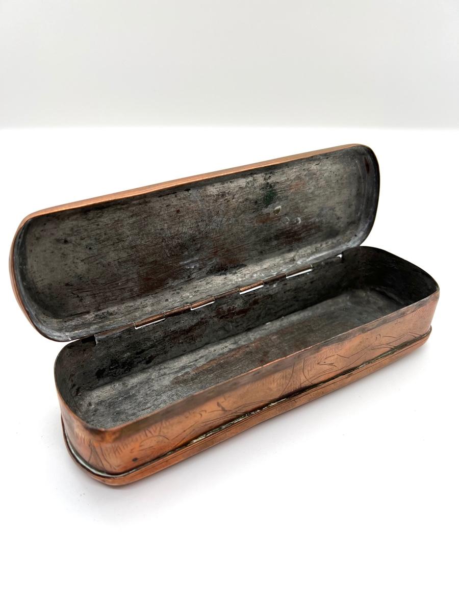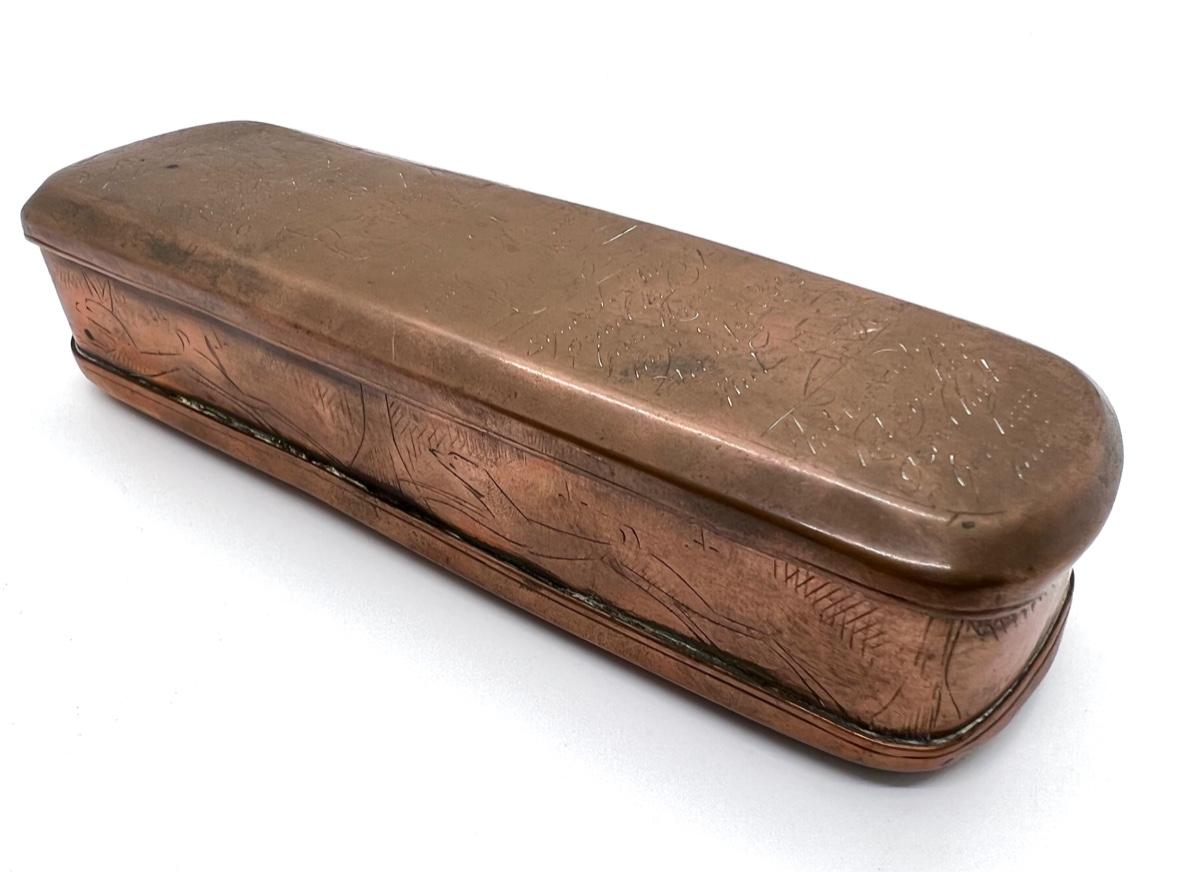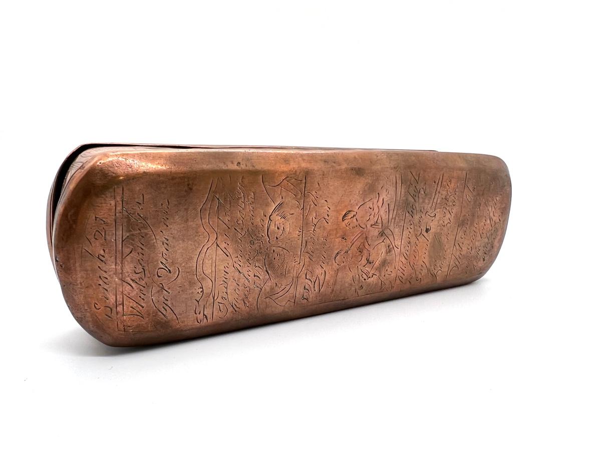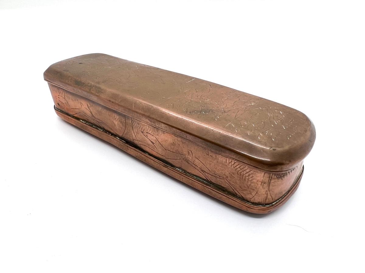LOT 26 - Antique Dutch Copper Tobacco Snuff Box. This box measures 6 inches long, 2 inches wide and 1 1/4 inches tall. This item is part of the David-Pleydell-Bouverie Estate at Bouverie Ranch in Glen Ellen. This item can be viewed at our Green + Cate Showroom in Sebastopol from December 2nd -December 5th between the hours of 9am-5pm. For the benefit of the Bouverie Preserve of Audubon Canyon Ranch.