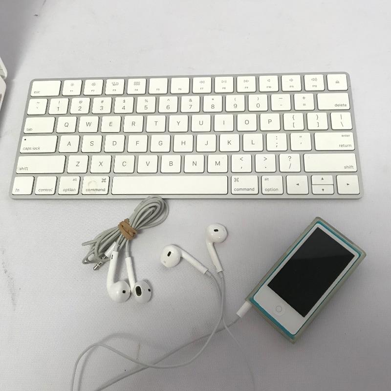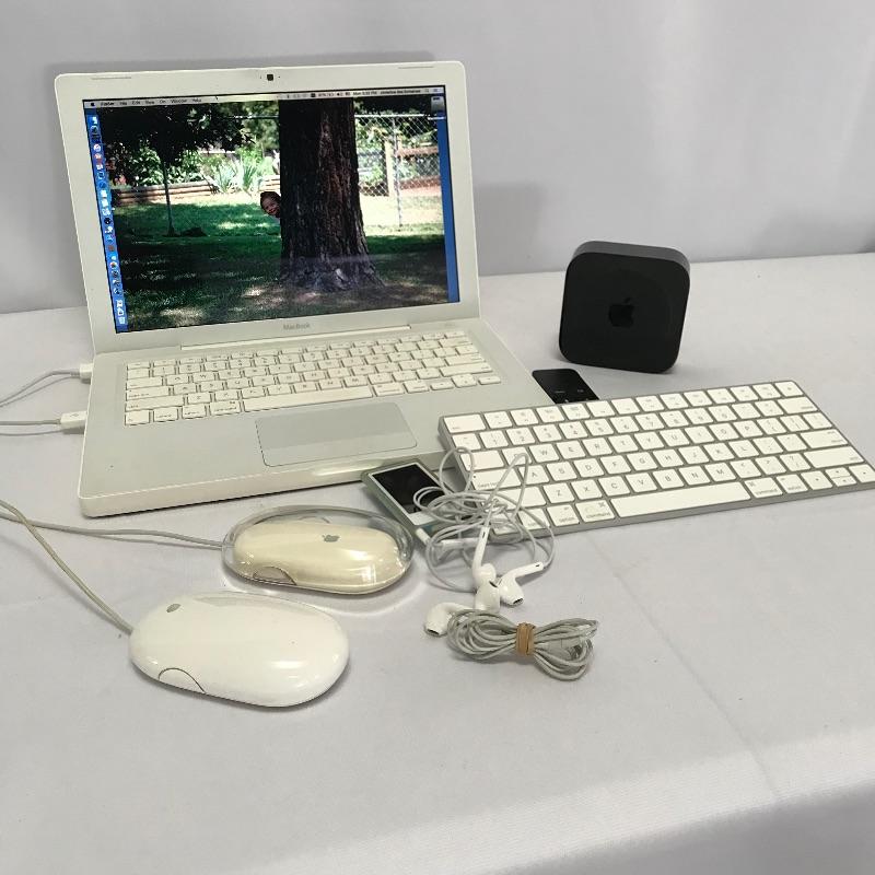 Great lot for the Apple fan! This lot has a MacBook model A1181, that turns on when tested. MacBook is complete with its power cord and has been cleared of software. It includes a wireless auxiliary keyboard model A1644 and a Pro Mouse model M5769 and another mouse model A1152. This lot also has a newer Apple TV with remote model A1513 (cords not included and Box model number unknown). For your music, we have an iPod A1446 (missing charger, but had enough battery power to test.) All items except Apple TV was tested and worked well. Shipping available.