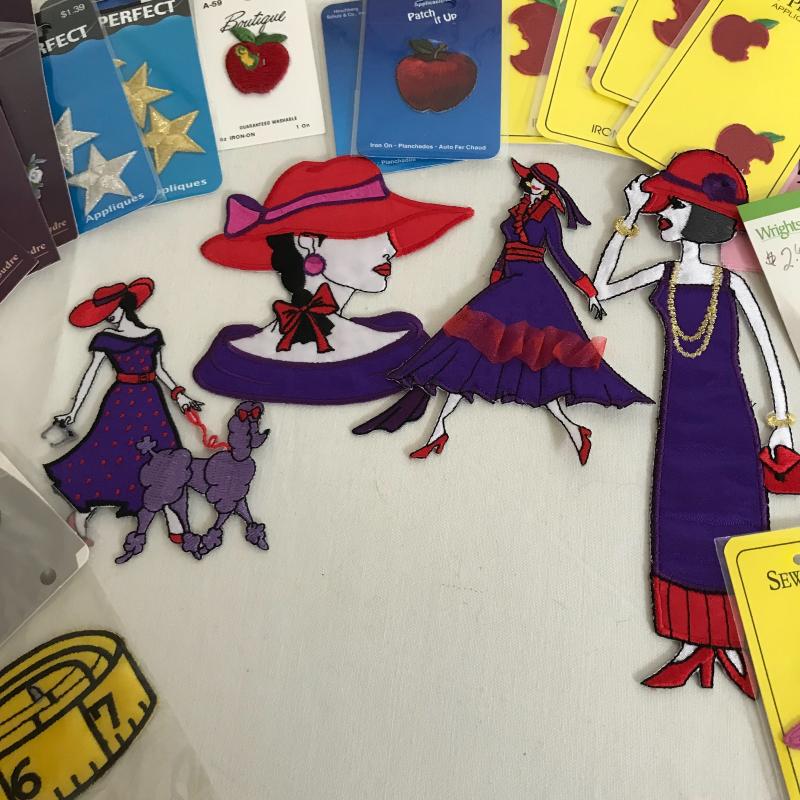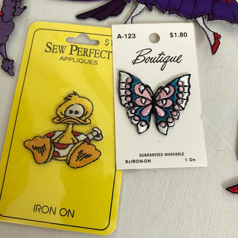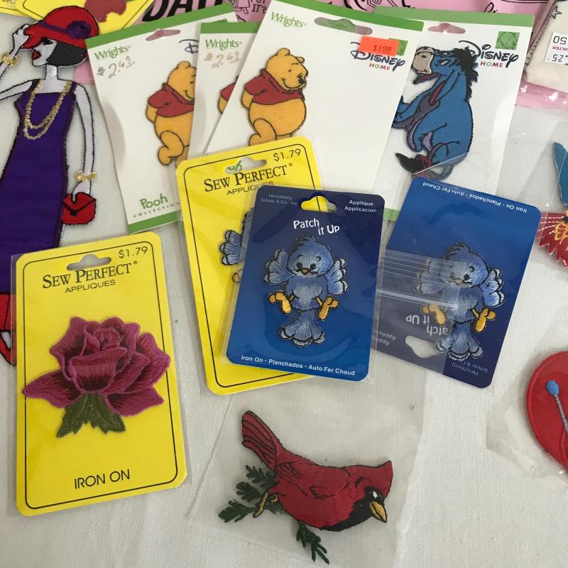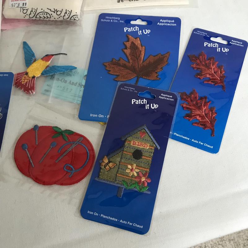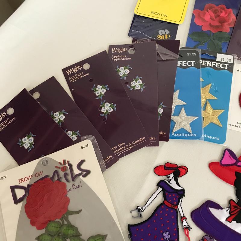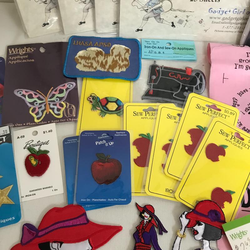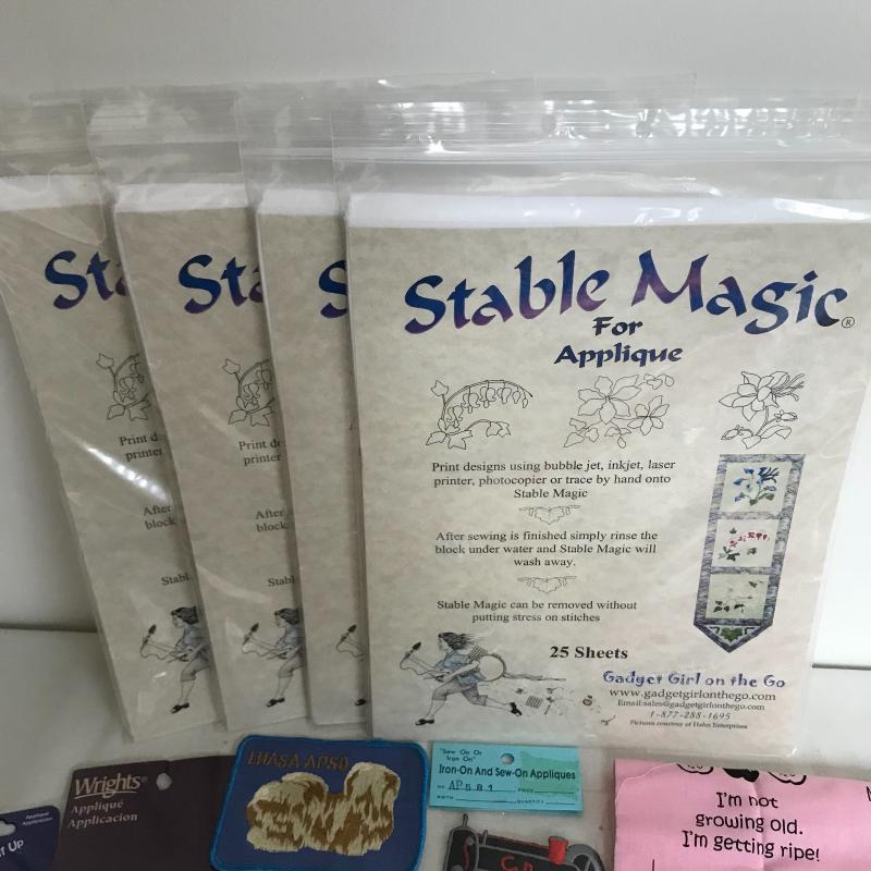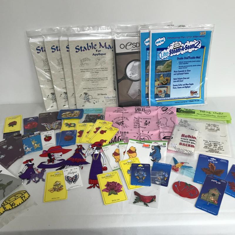 Lot includes appliqué patches of all kinds for your sewing and crafting projects! Also includes iron-on transfers Stable Magic stabilizer, and fusible webbing. See pics. Shipping available.