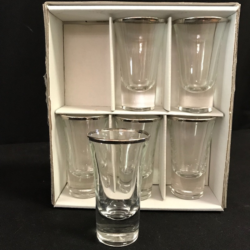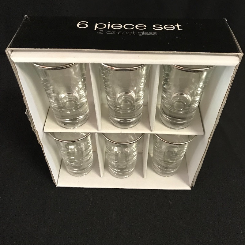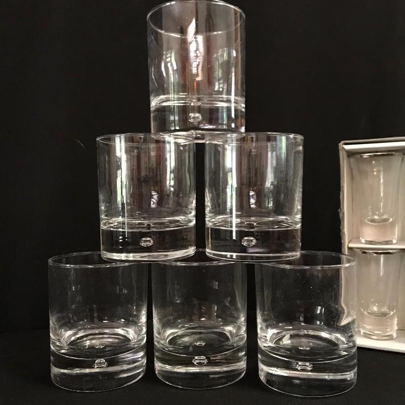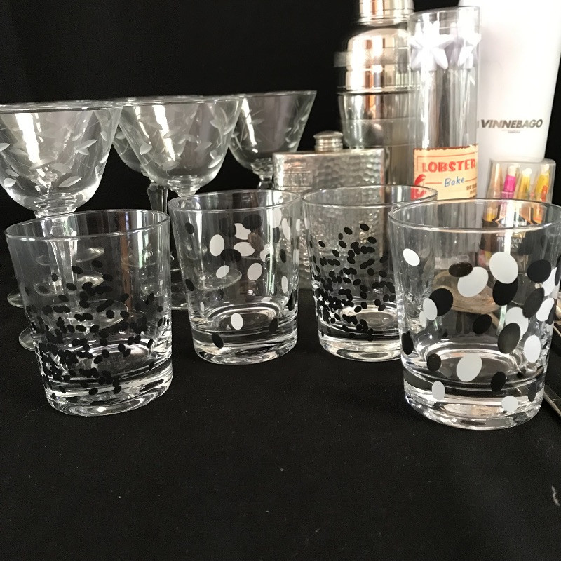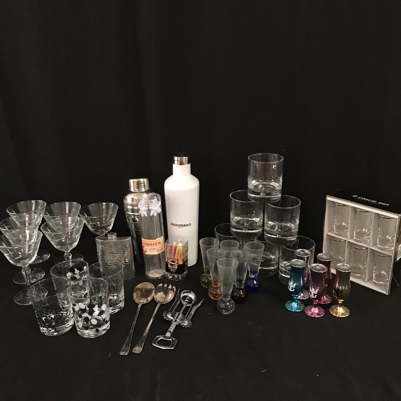 There is a lot to see here and some really unique items as well as great quality. Included are six really great looking blown glass shot glasses, a new set of silver rimmed 2oz shot glasses and five metallic painted grail like shots glasses. A Vinnebago and metal shaker. Four fun Ikea rocks glasses, Sheffield flask and serving ware with a set of six cut glass champagne coupes. Another set of six heavy rocks glasses with a delicate bubble in the center of each bottom, one glass has a slight chip in the rim. See images for all.