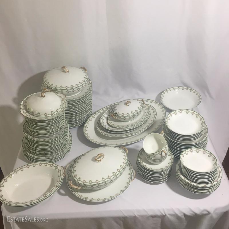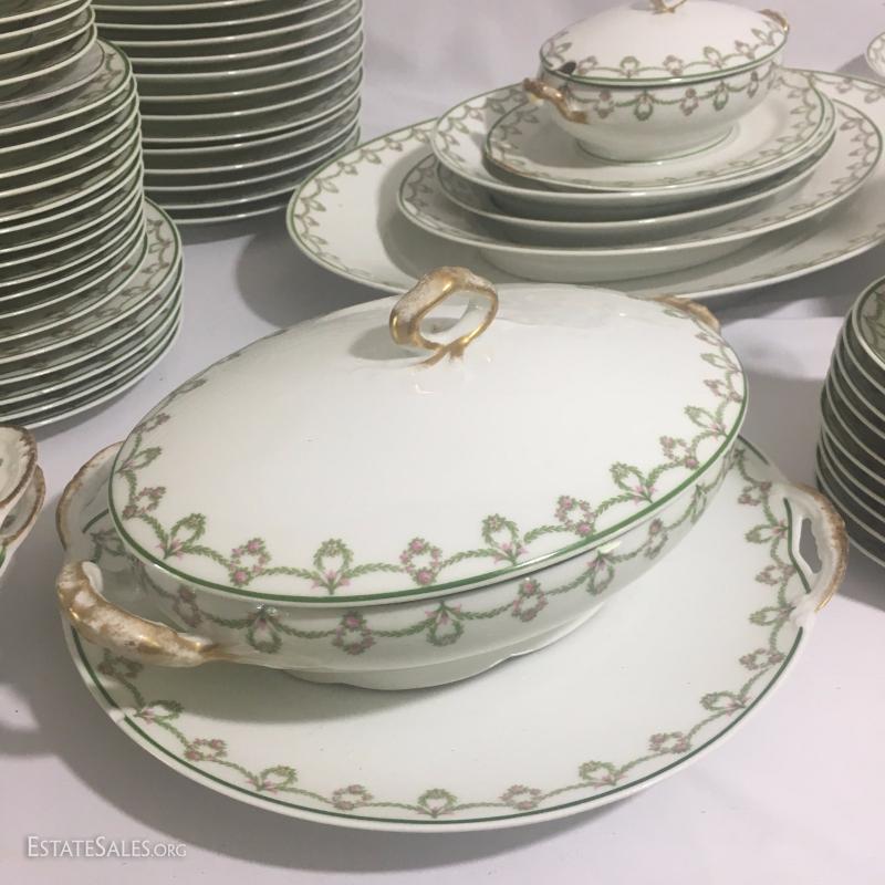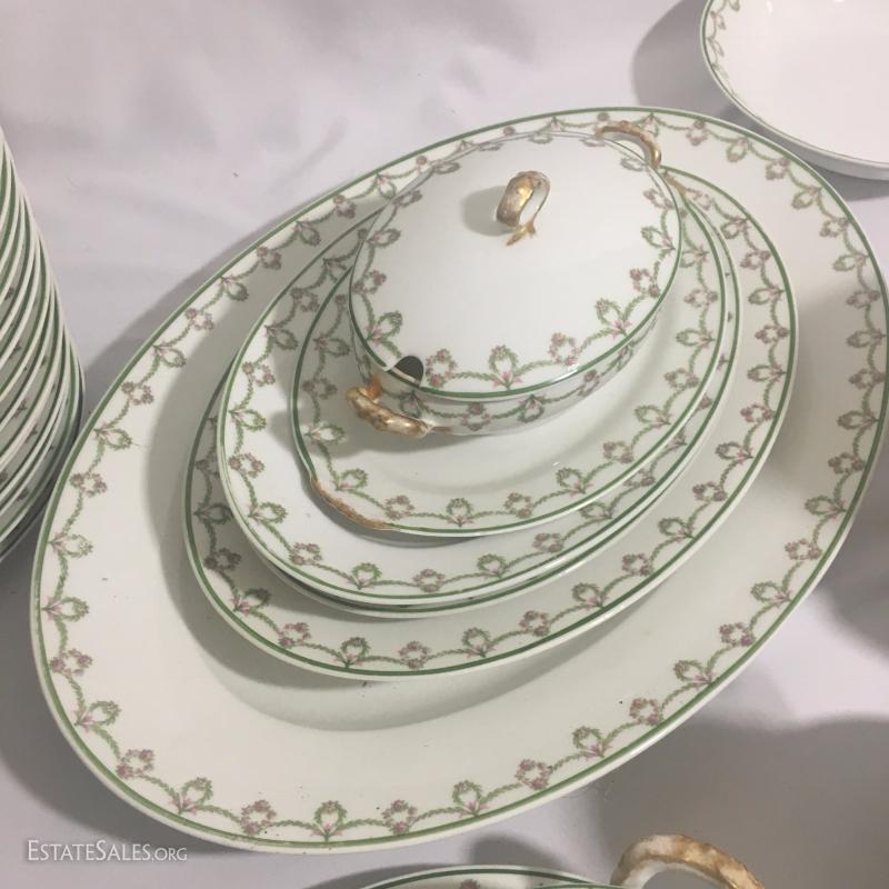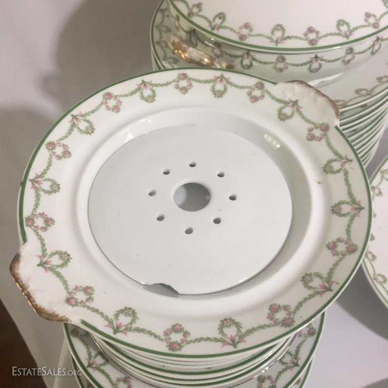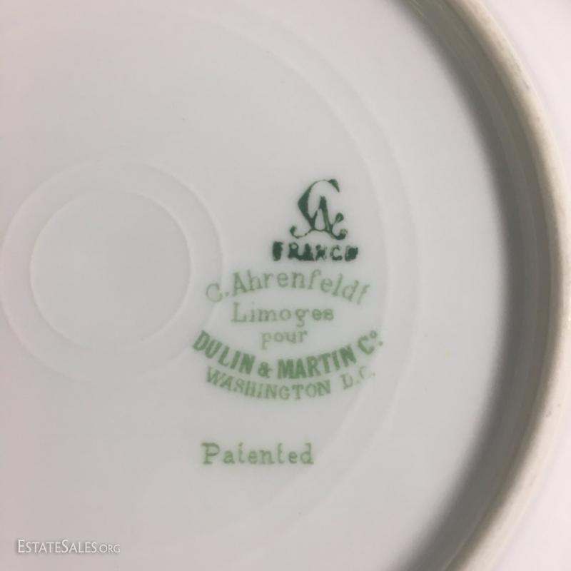 107 piece set of C. Ahrenfeldt Limoges for Dulin & Martin Co. Also stamped France Depose. Some plates have small chips and or fading.