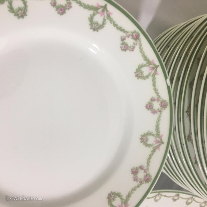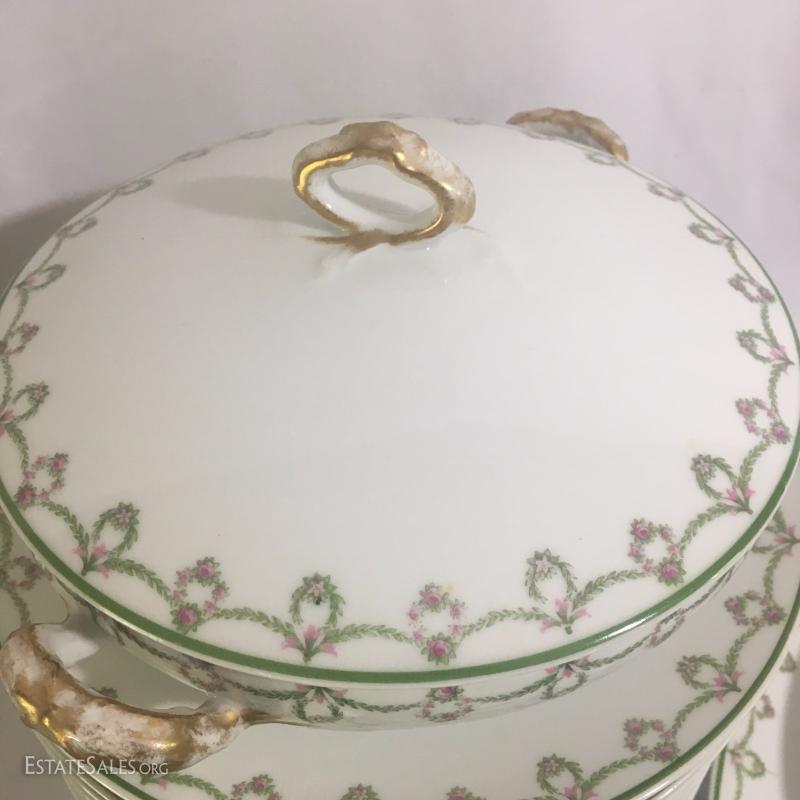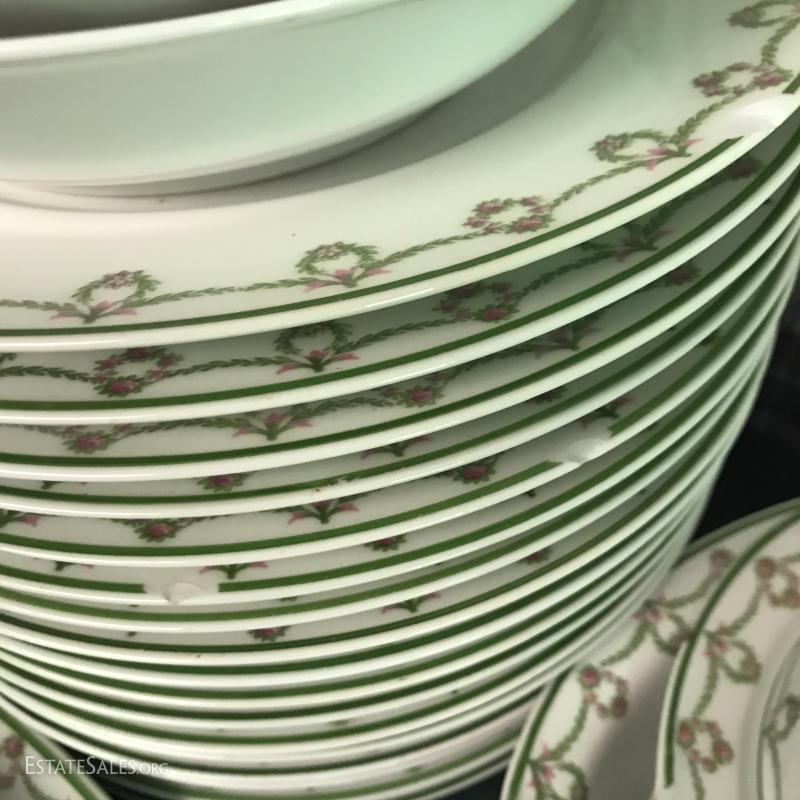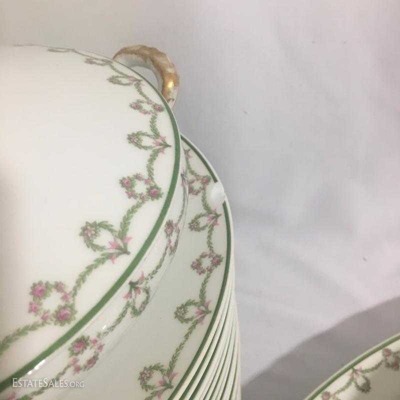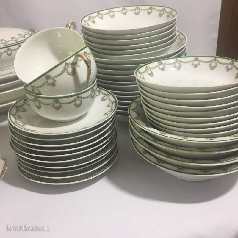107 piece set of C. Ahrenfeldt Limoges for Dulin & Martin Co. Also stamped France Depose. Some plates have small chips and or fading.