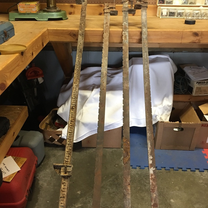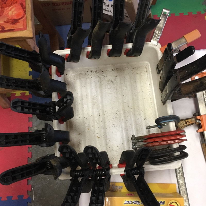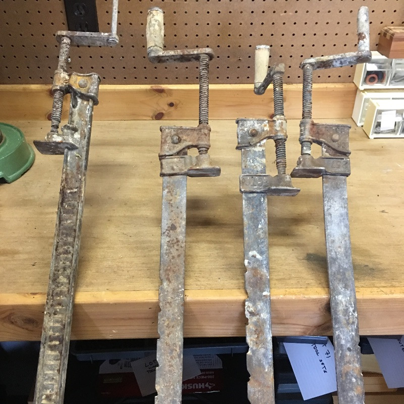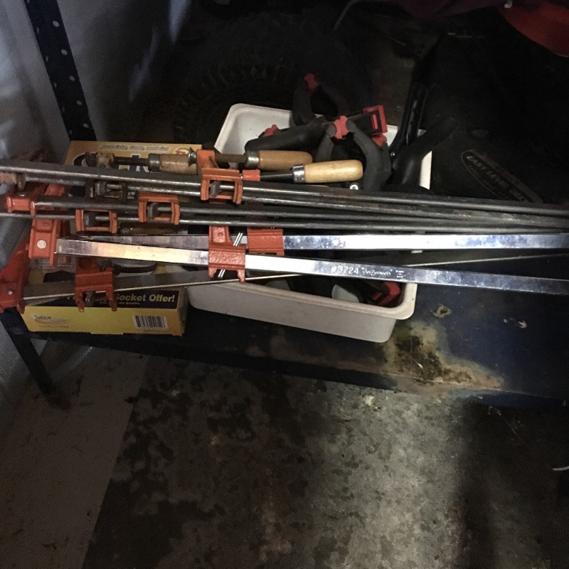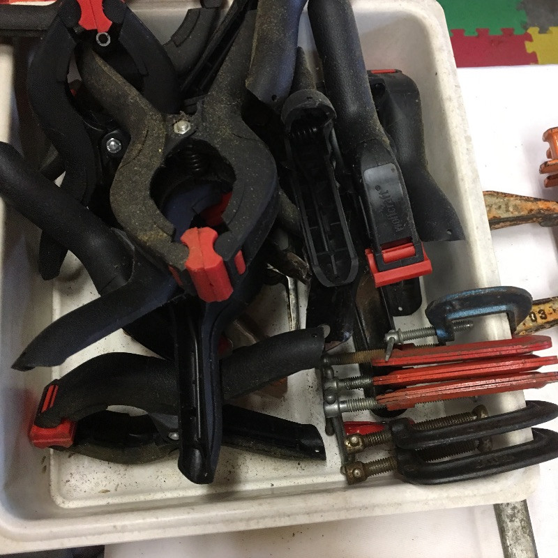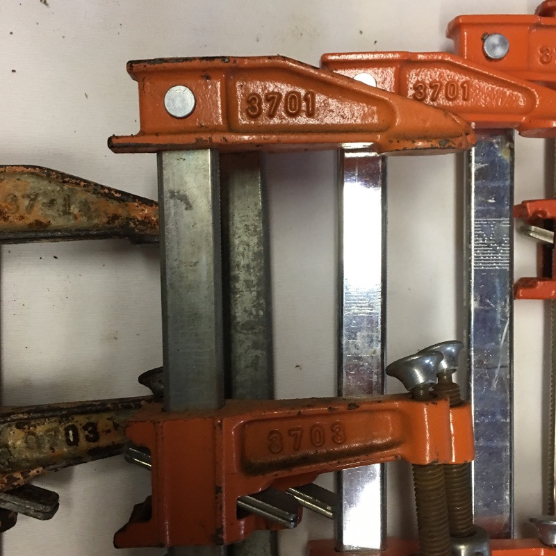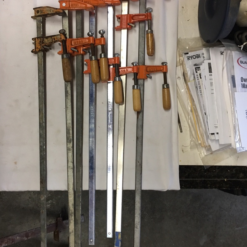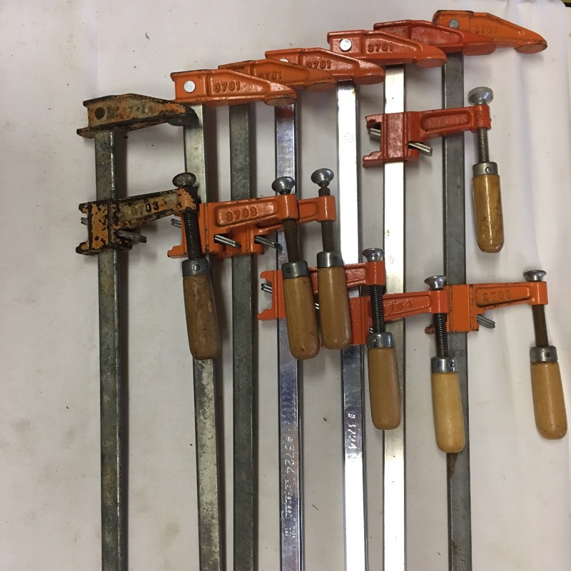 A great assortment of clamps that includes sixteen spring clips, five small c clamps, seven medium bar clamps and four large bar clamps. Longest bar measures 78”.