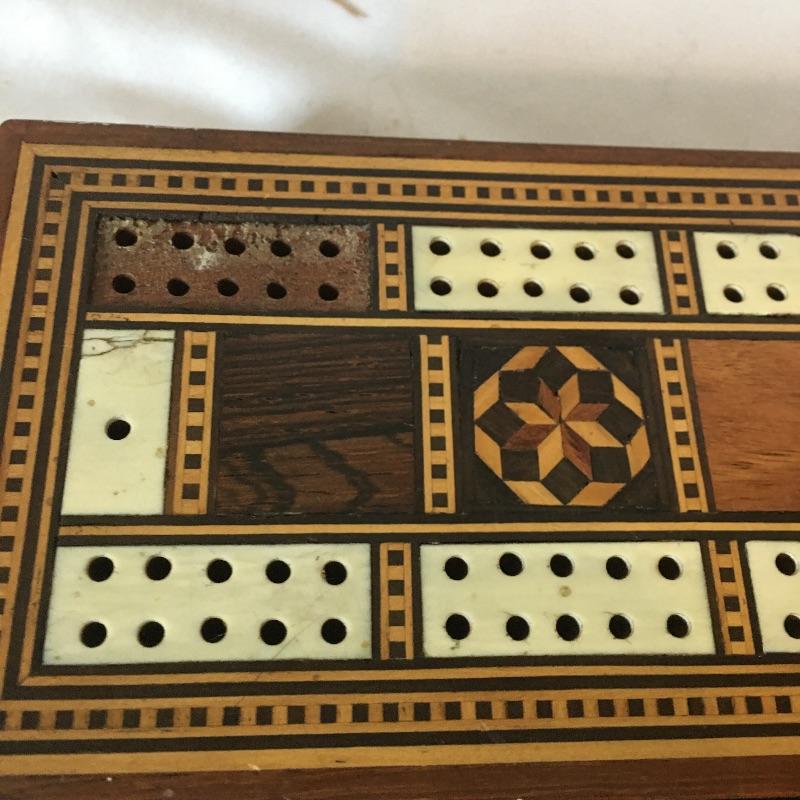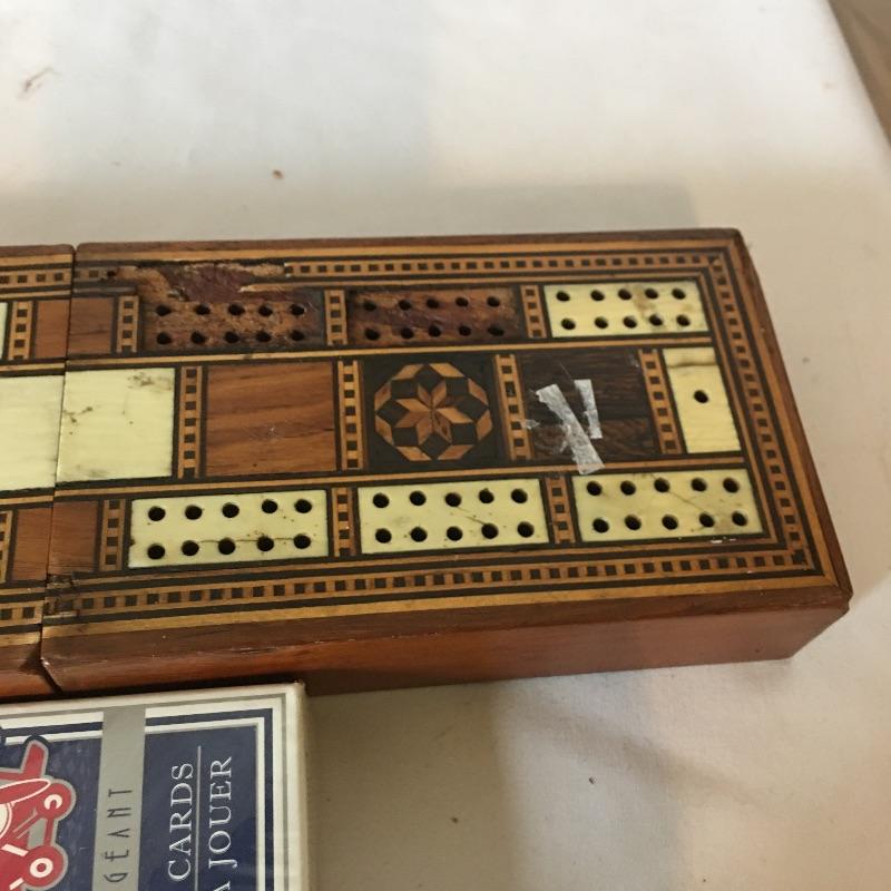 Cribbage boards. Lot includes two 29 boards, folding inlaid cribbage board, two wooden boards, one wooden and metal board, one ivory colored board and one resin board. Folding board has some inlay missing, see pictures. Largest board measures 5” x 15” x 1”.