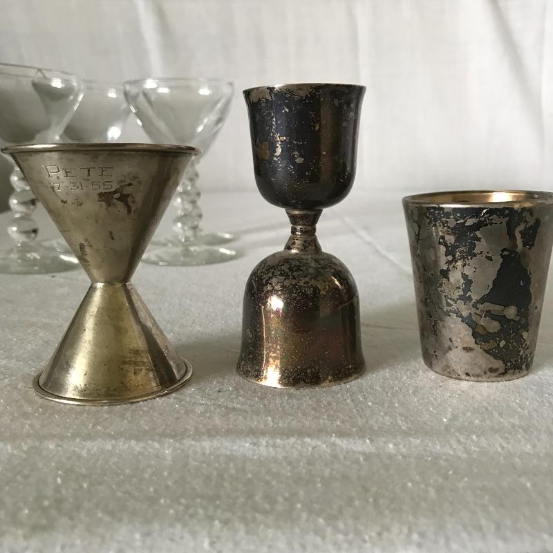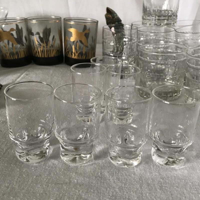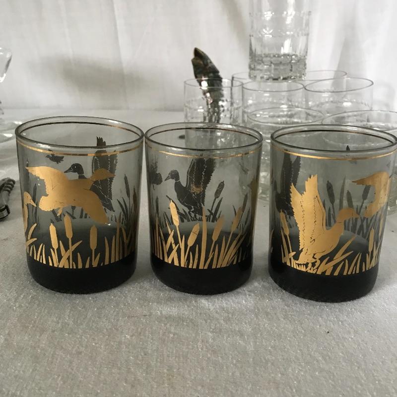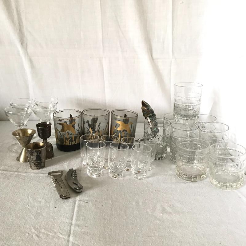 Fun array of vintage and newer items to complete the perfect bar. A vintage articulated abalone fish bottle opener stands out in any setting! Shot and cordial glasses including three MCM golden duck highballs. Two low and six highball glasses have that classic bar feel. Three Sterling pieces including two jiggers and a sterling lined glass shot glass by Reed & Barton. See photos. Shipping available.