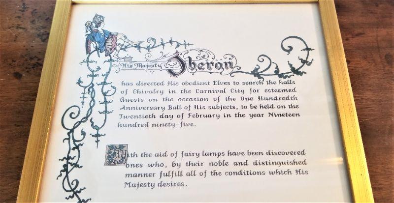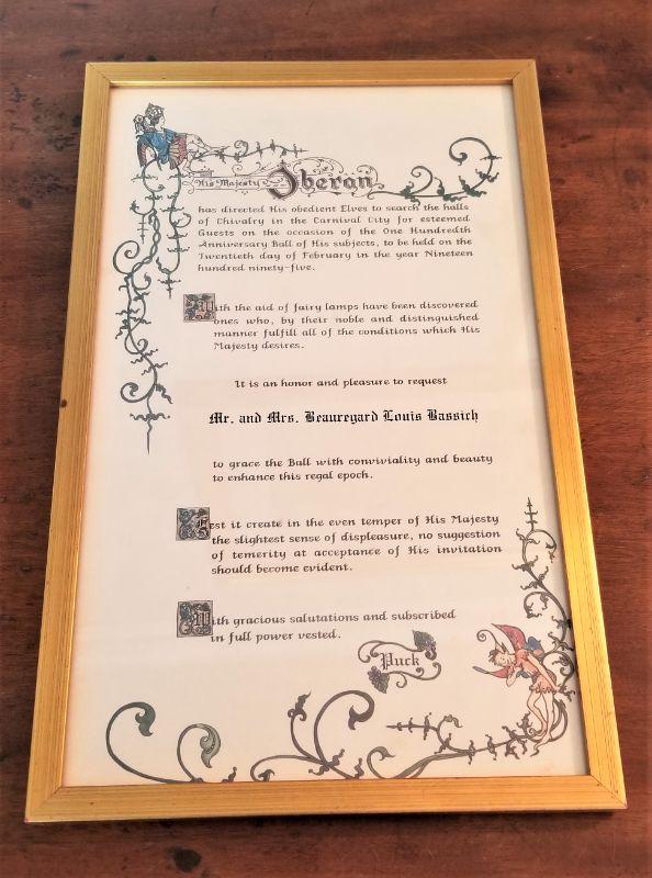 Personalized Mardi Gras Invitation - Elves of Oberon - framed. Measures 14.5" x 9", dated 1995. Design is lovely and looks to be hand colored.