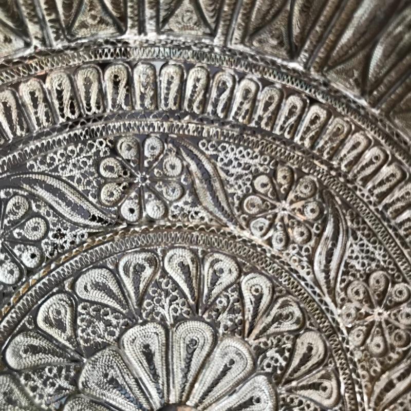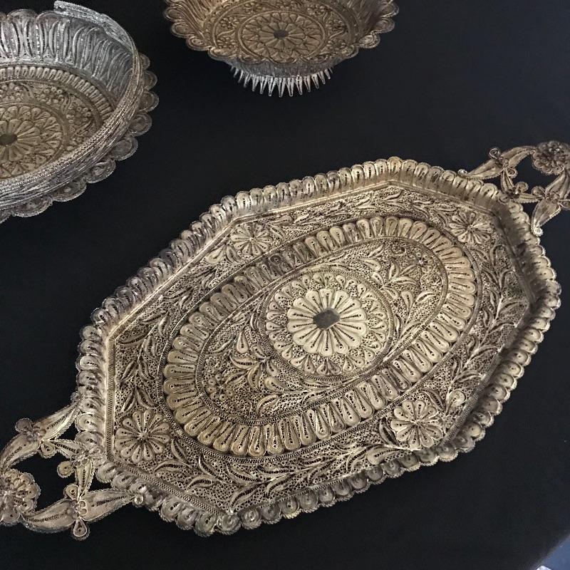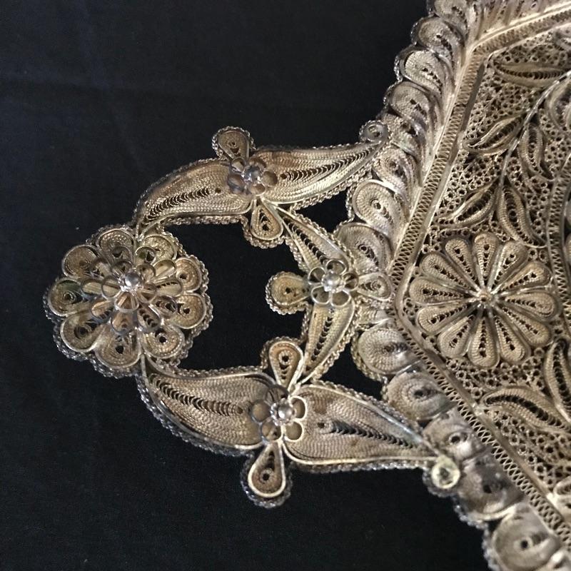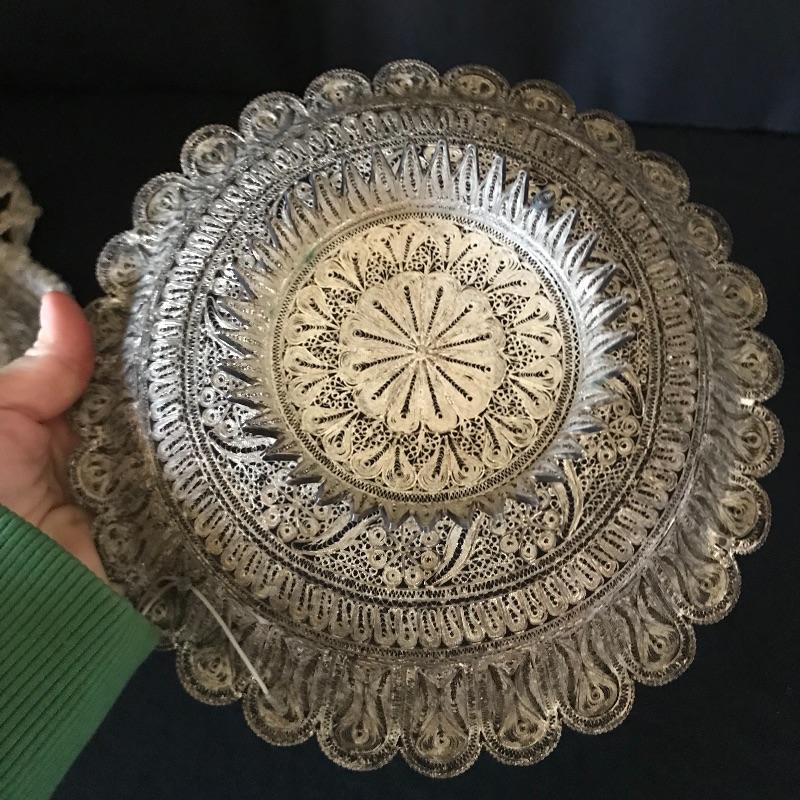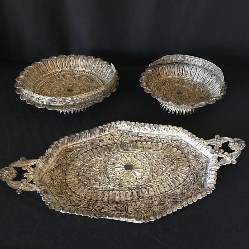 These intricate silver filigree wire work serving trays appear to be made of silver. Possibly sterling. Would be gorgeous displayed together on a wall. Oval tray is 17" x 9". Shipping available.