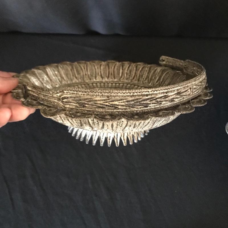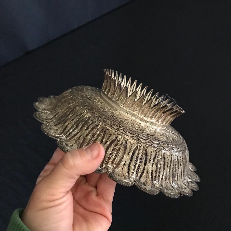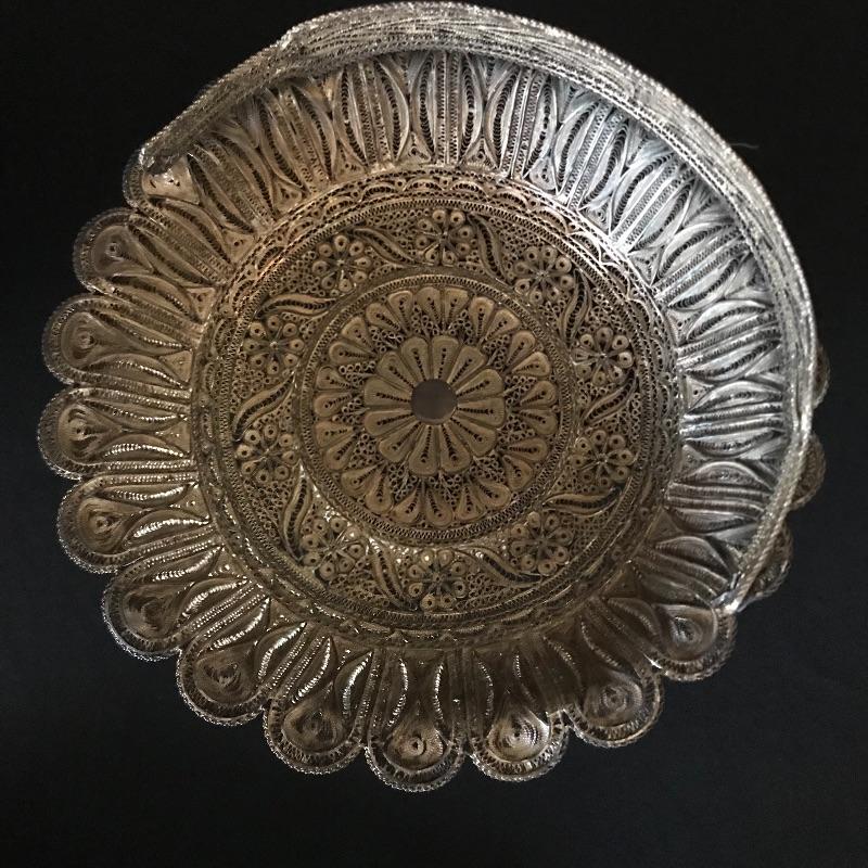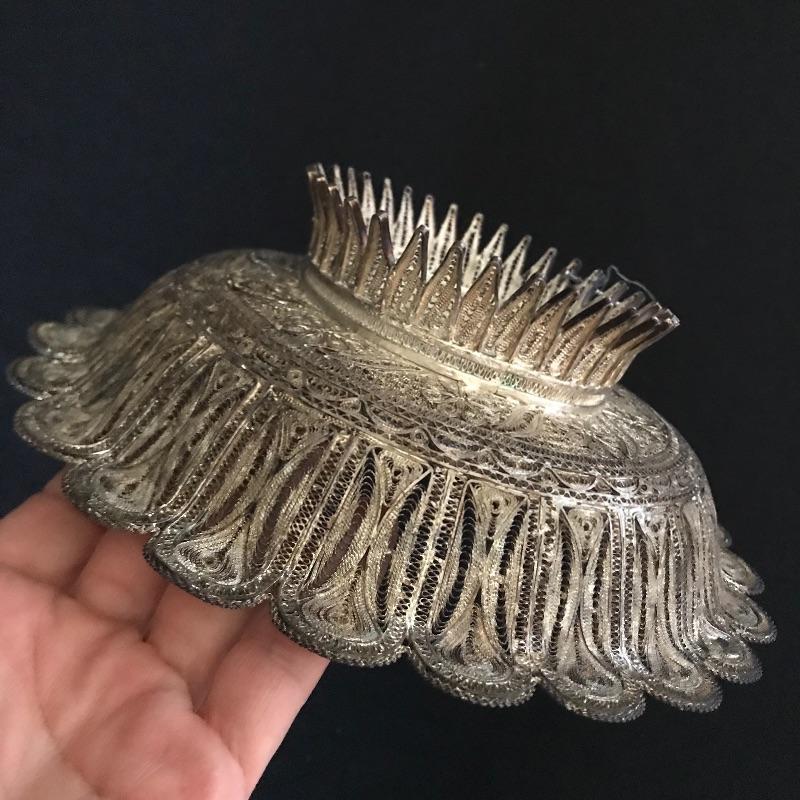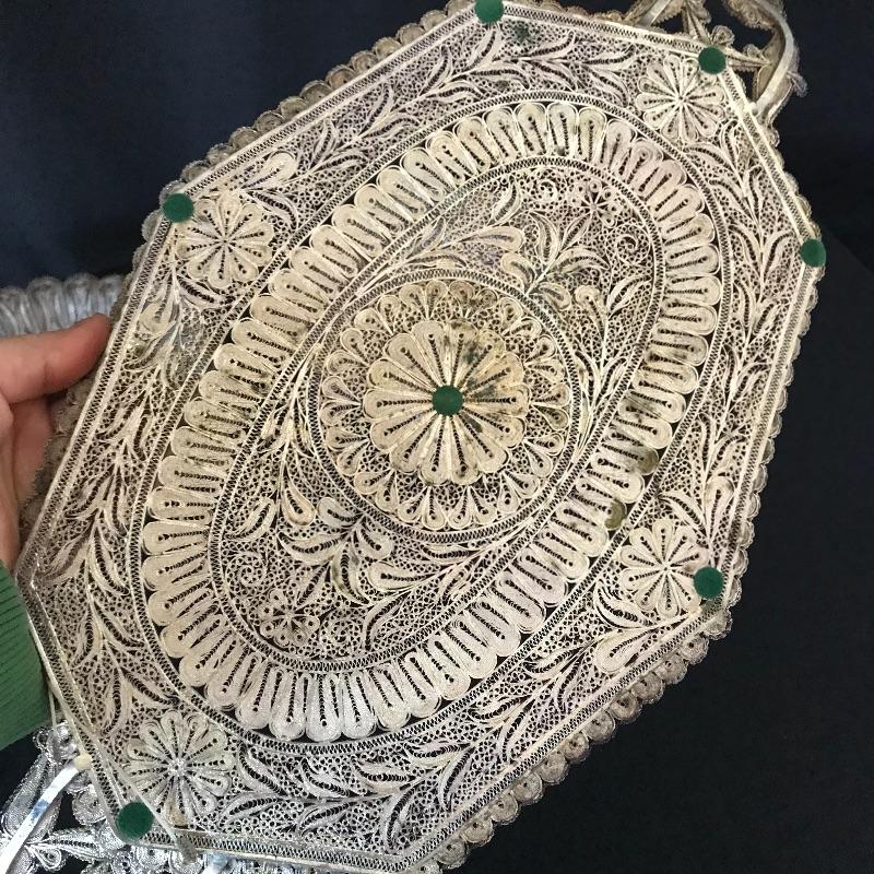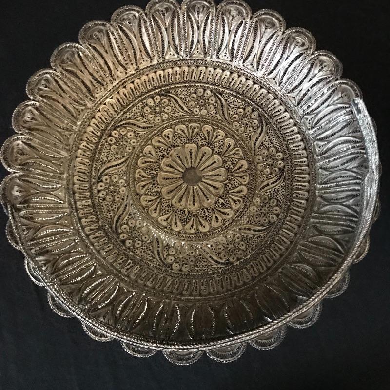 These intricate silver filigree wire work serving trays appear to be made of silver. Possibly sterling. Would be gorgeous displayed together on a wall. Oval tray is 17" x 9". Shipping available.