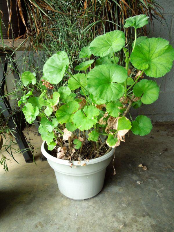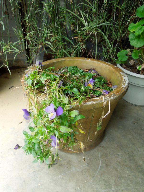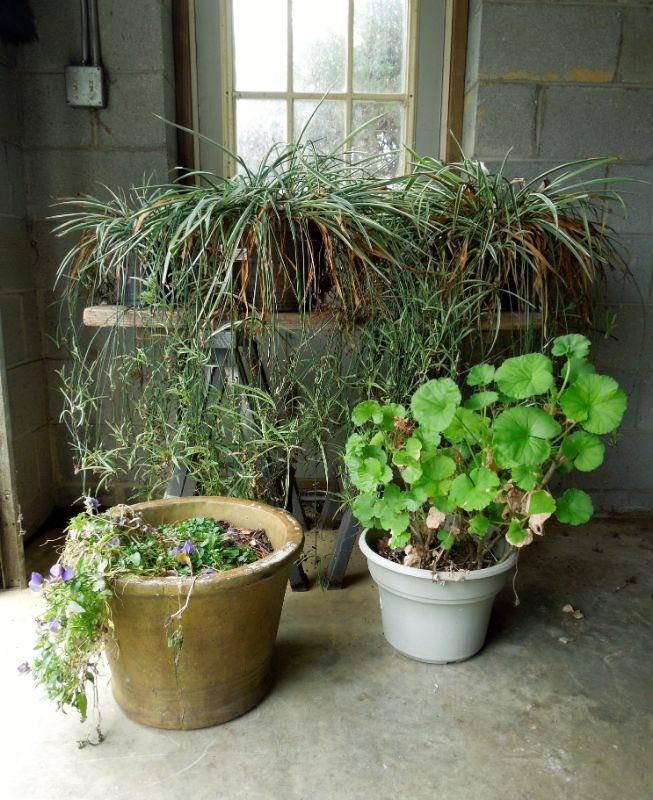 3 potted trailing spider plants in 10" plastic pots; a geranium in 13" plastic planter; and purple pansies in 16" x 12" clay pot. Have been watered and cared for.