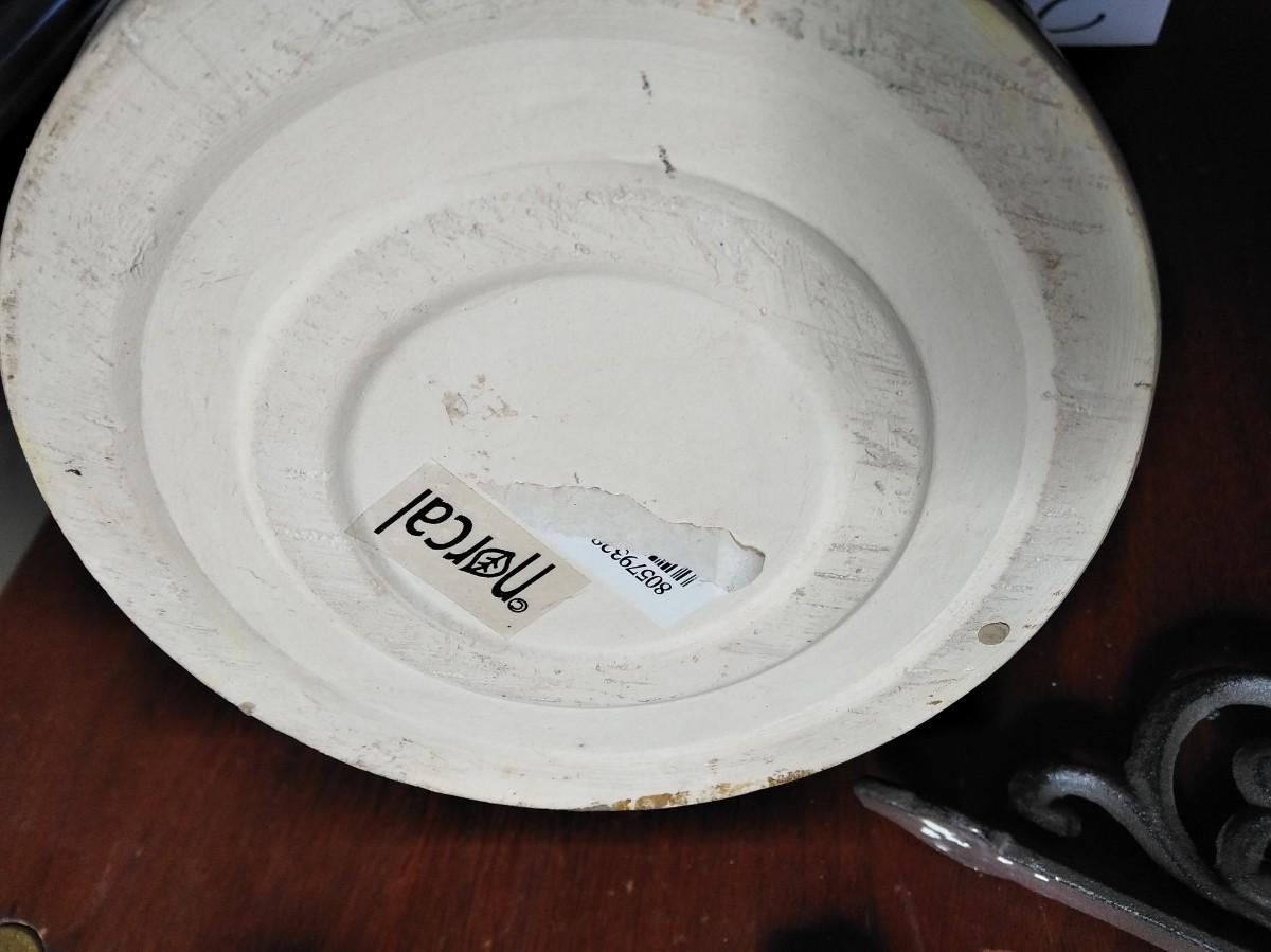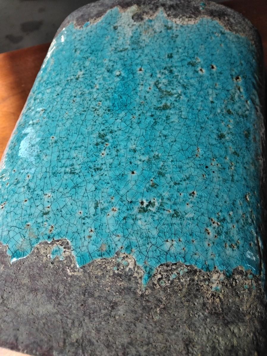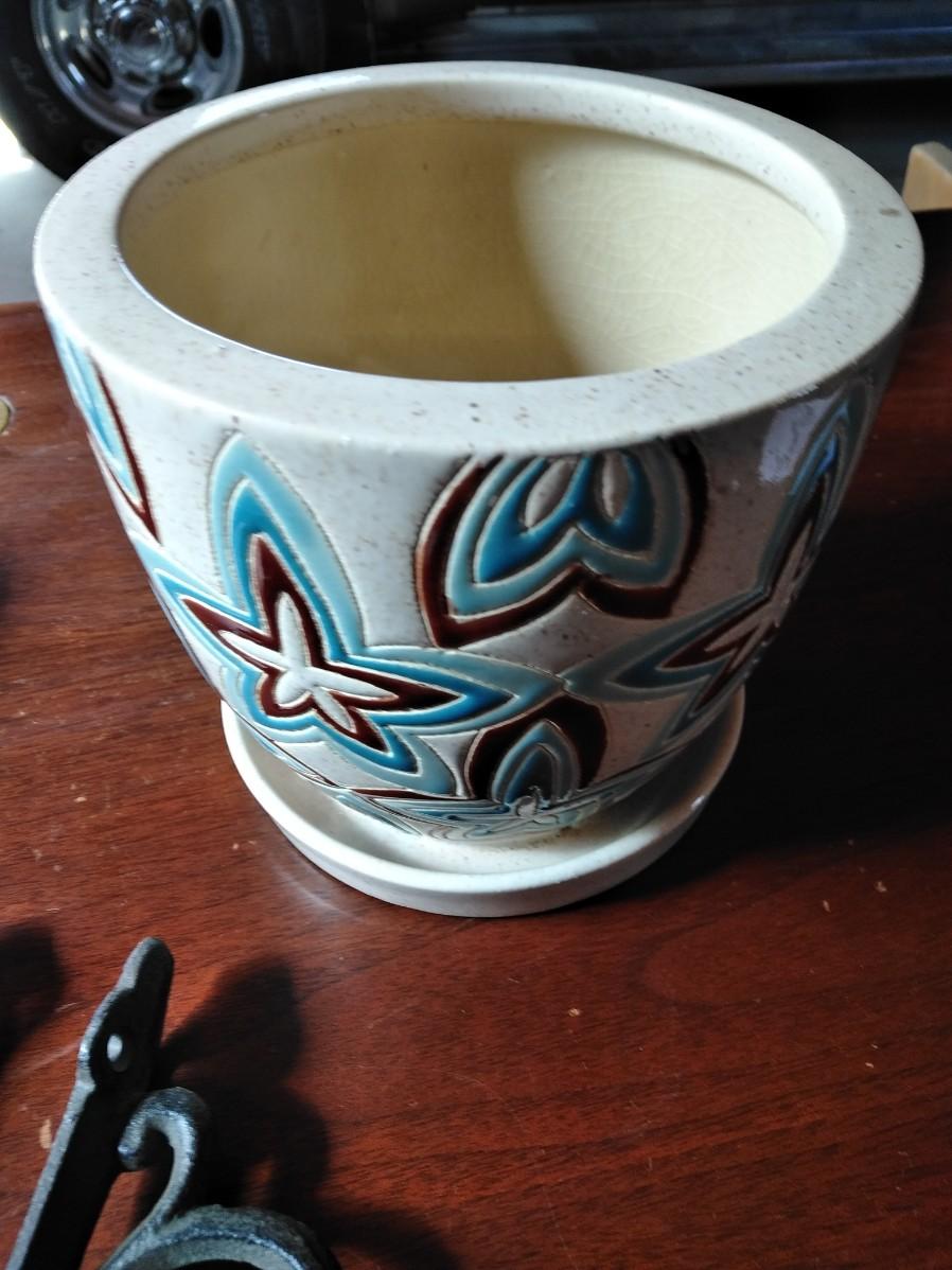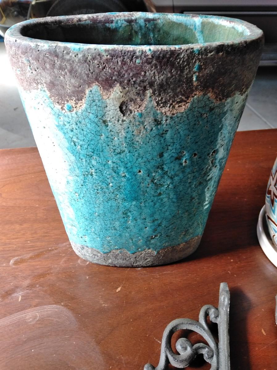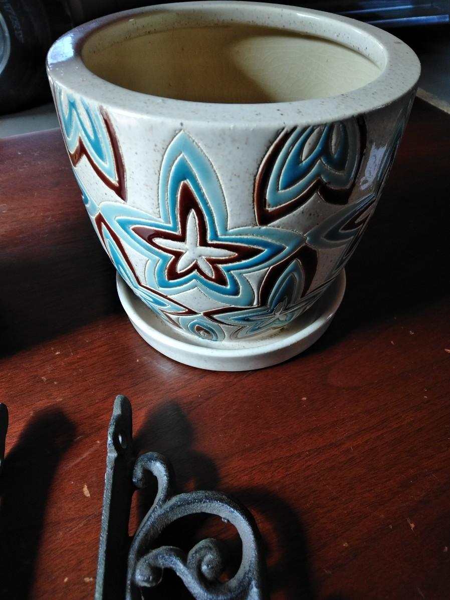 FLOWER POT WITH DRIP TRAY, TWO CAST IRON SHELF BRACKETS, AND A NICE BLUE AND GREY GLAZED VASE