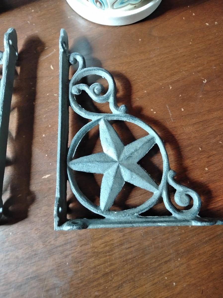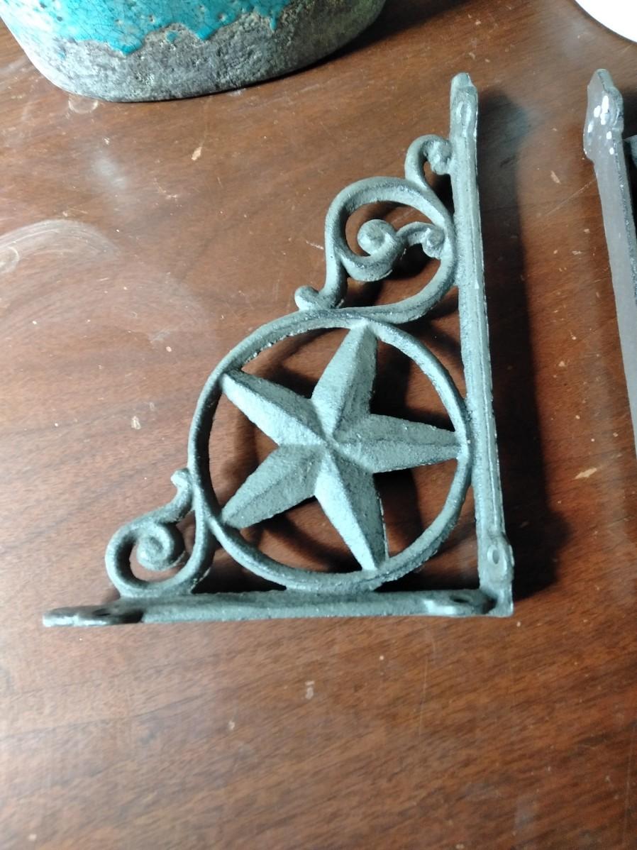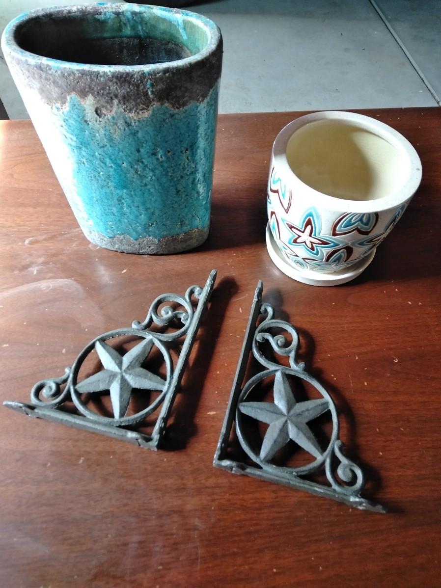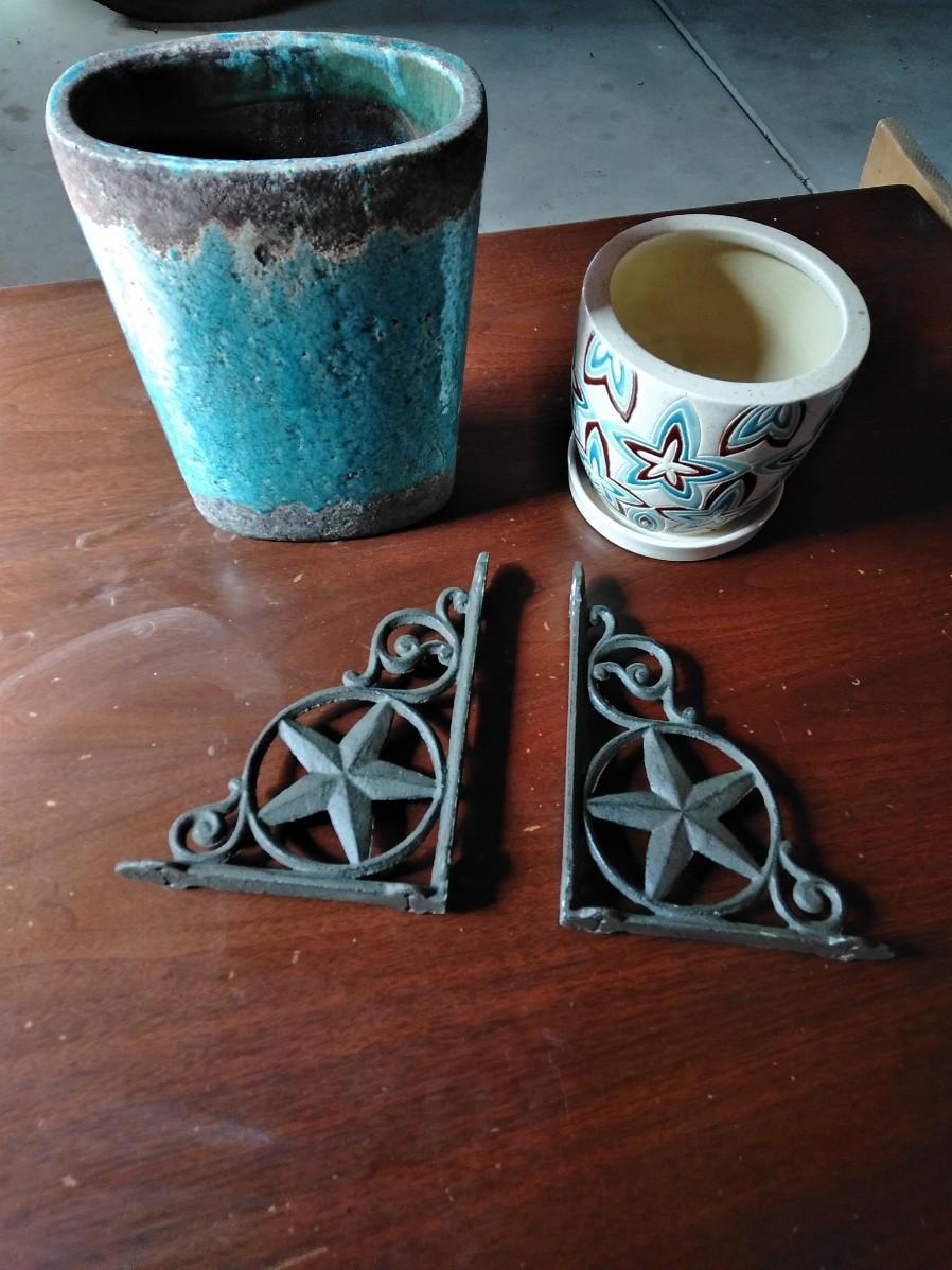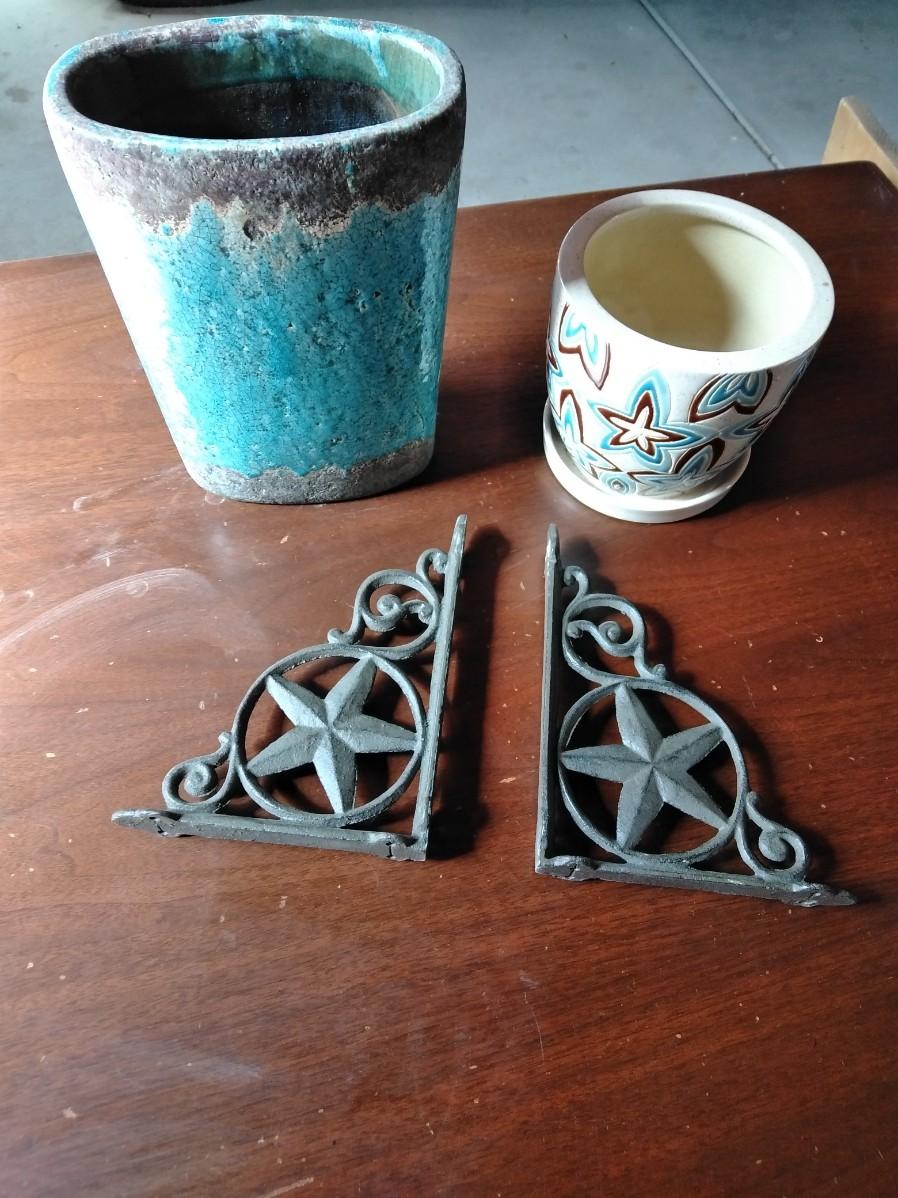 LOT 26 FLOWER POT, VASE AND CAST IRON SHELF BRACKETS (W)