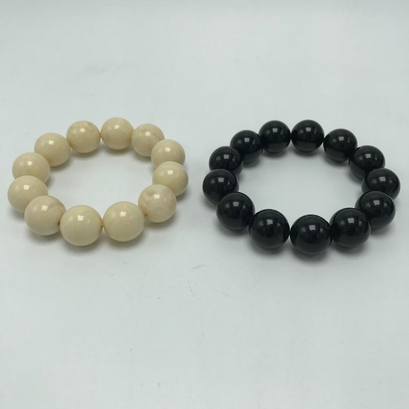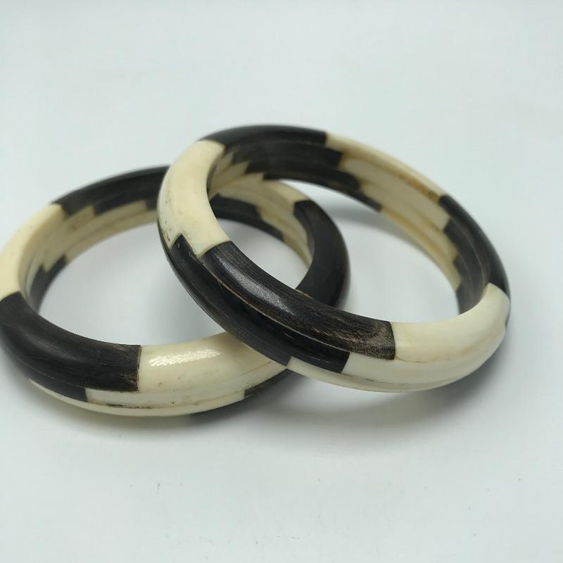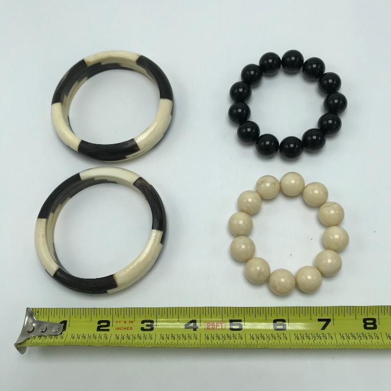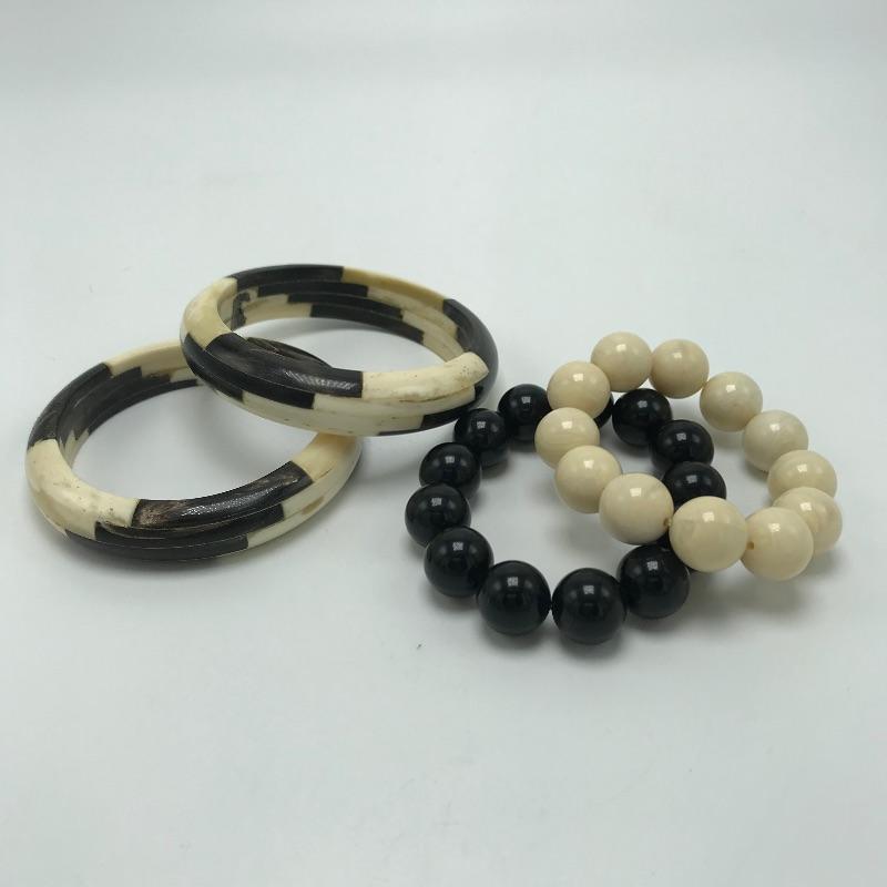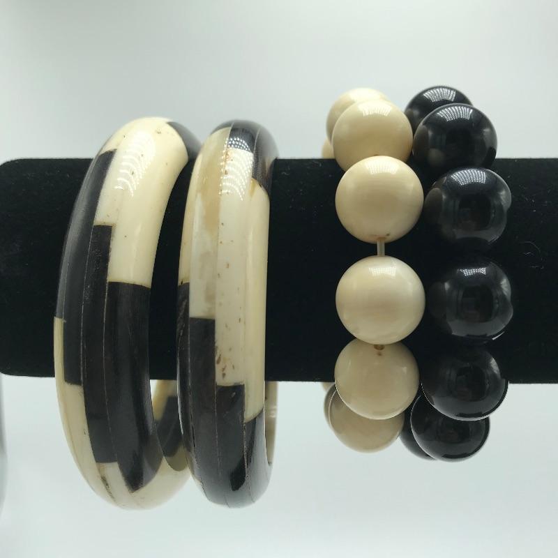 Two sets of complementing bracelets. The beautiful thick bangle bracelets appear to have four ash brown wood and ivory colored layers stacked in each. The beaded flex bracelets would look great together, but have enough personality to stand on their own. One has black beads, the other show marbled ivory colored beads. See photos.