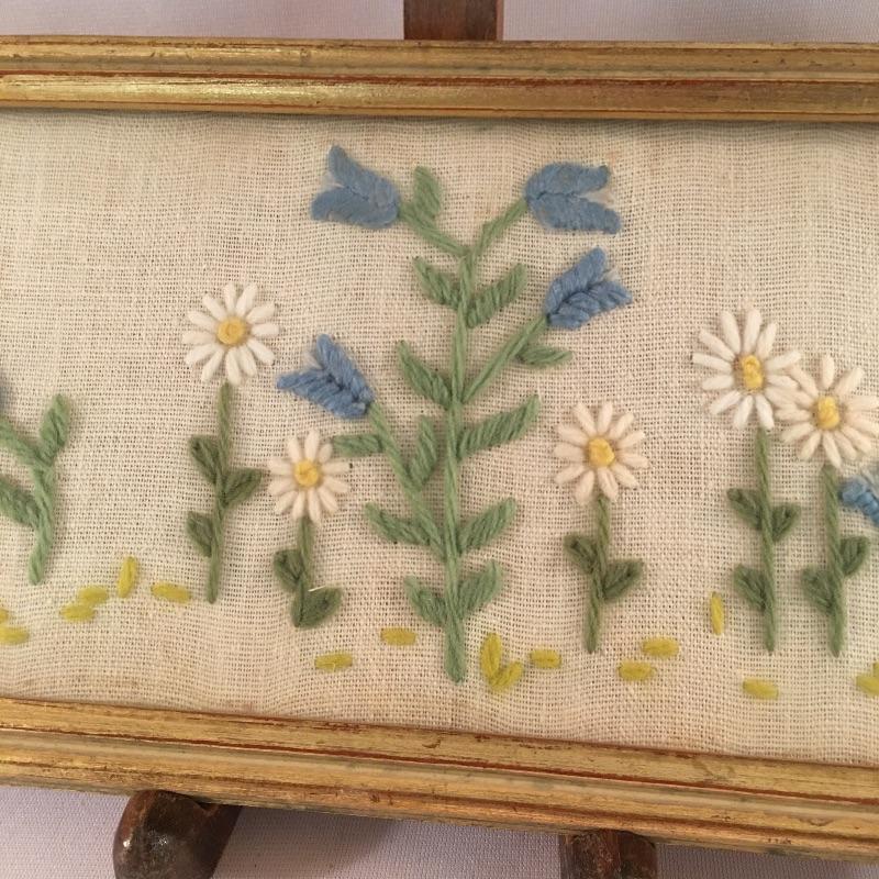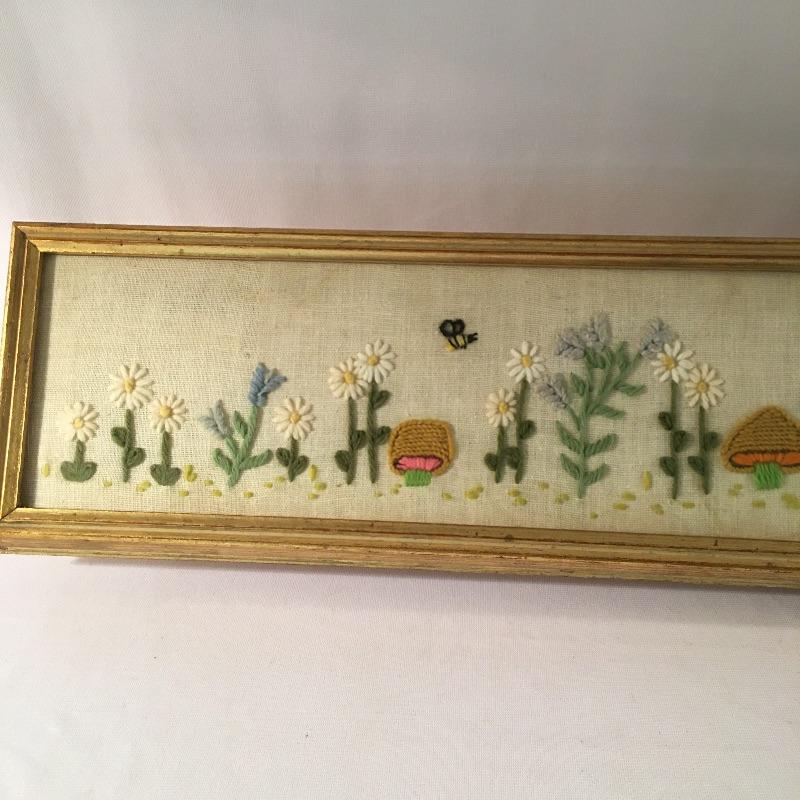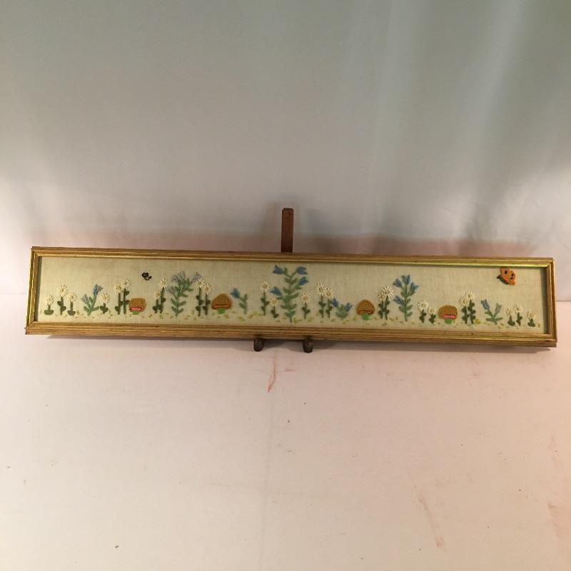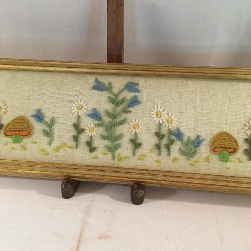 Framed vintage embroiderywith a nature motif that includes mushrooms, daisies, butterfly, bee and a blue flowering plant.