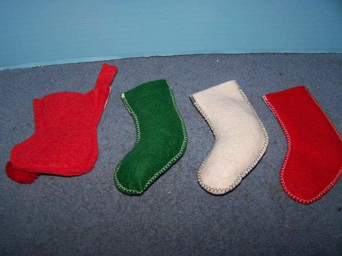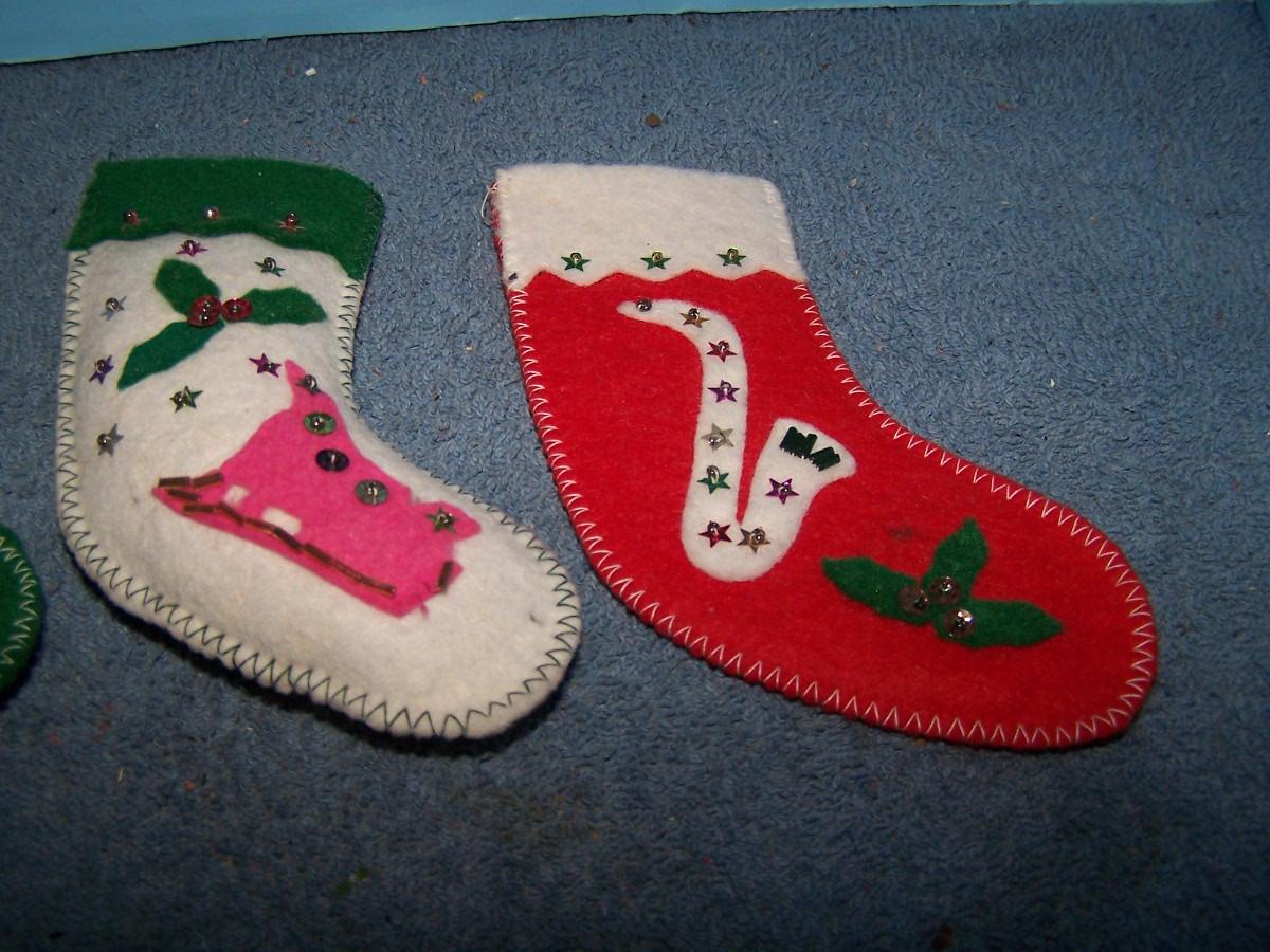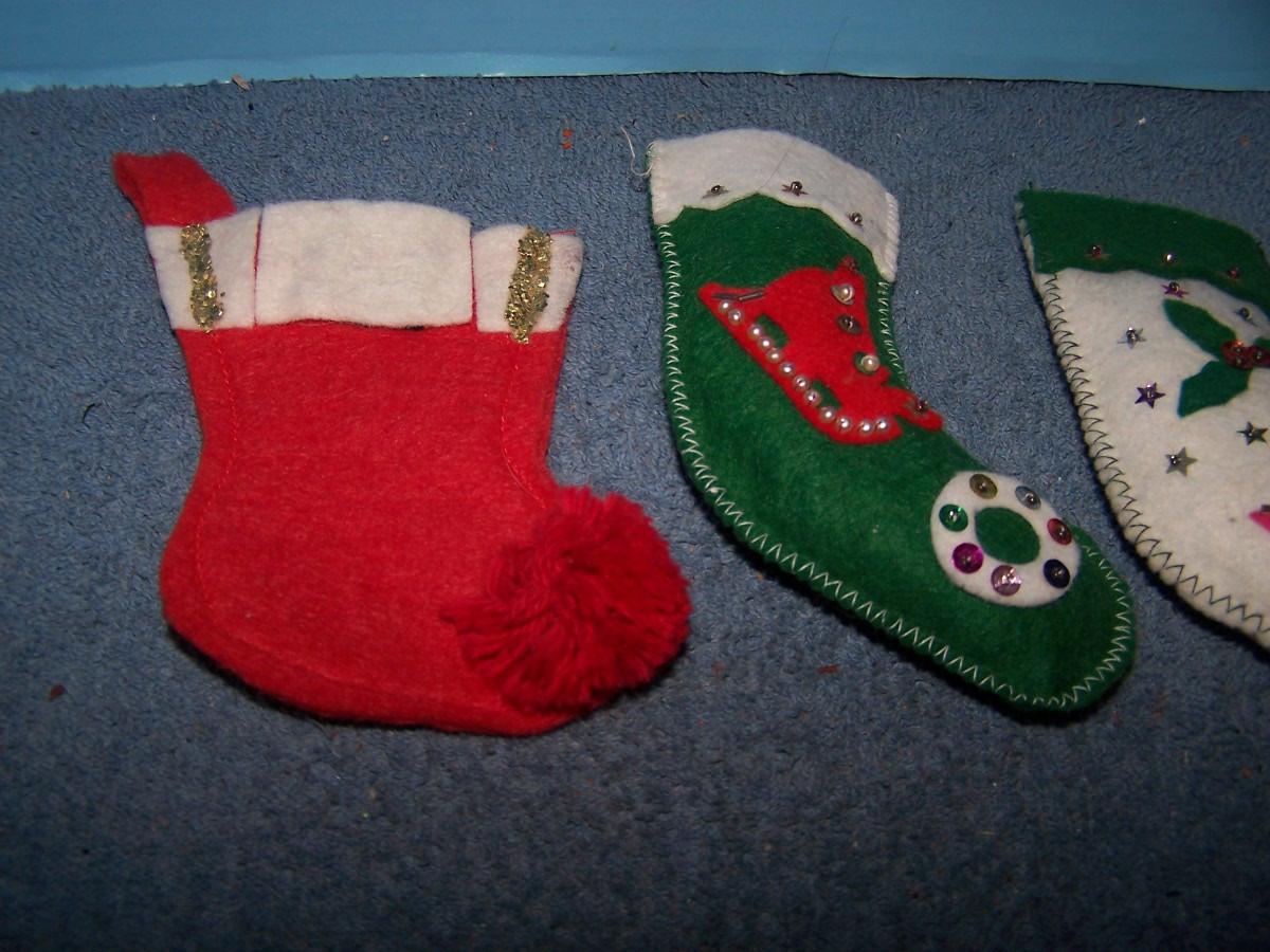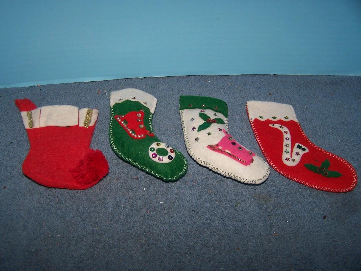 THESE ARE GREAT VINTAGE MCM CHRISTMAS MINI STOCKING ORNAMENTS!!! GREEN-5 1/2'' TALL.. RED-LIGHT WEAR, OTHER 3 VERY SLIGHT WEAR..