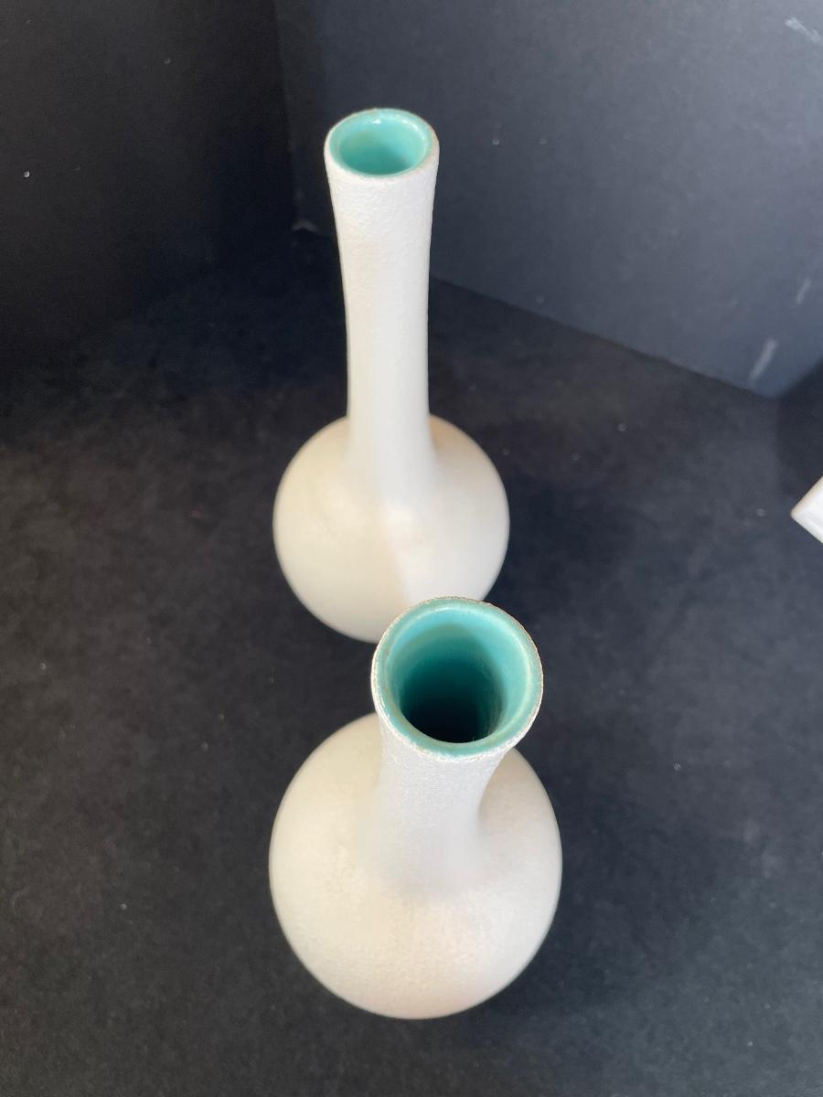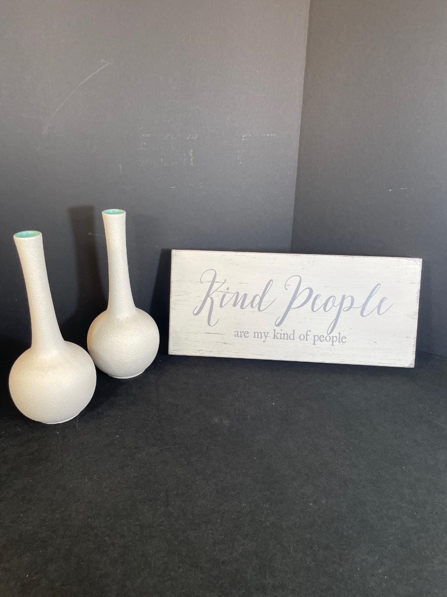 2 White matching vases with sign that reads "Kind People are my kind of people"