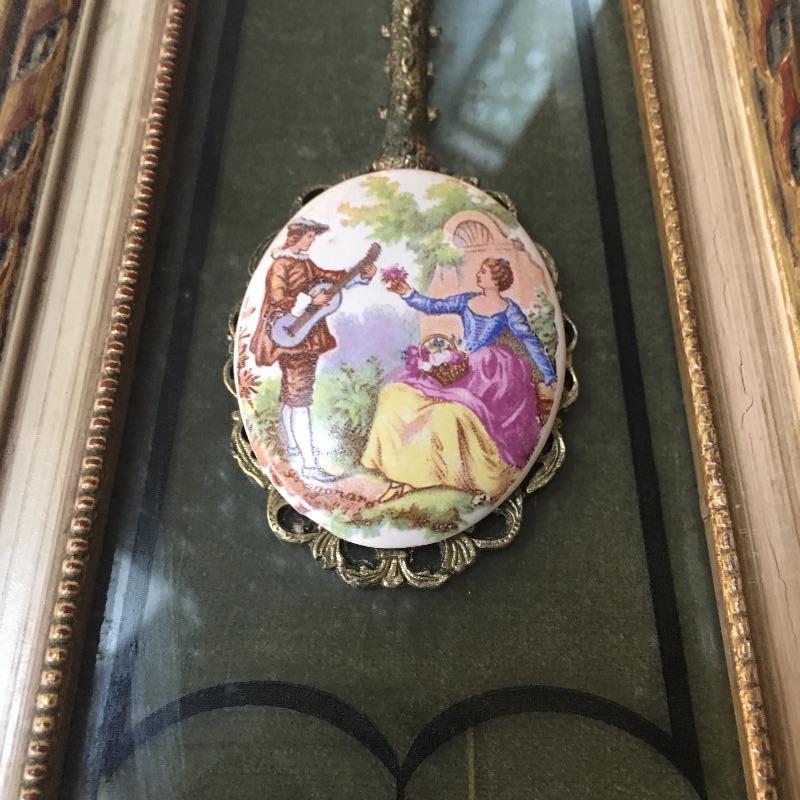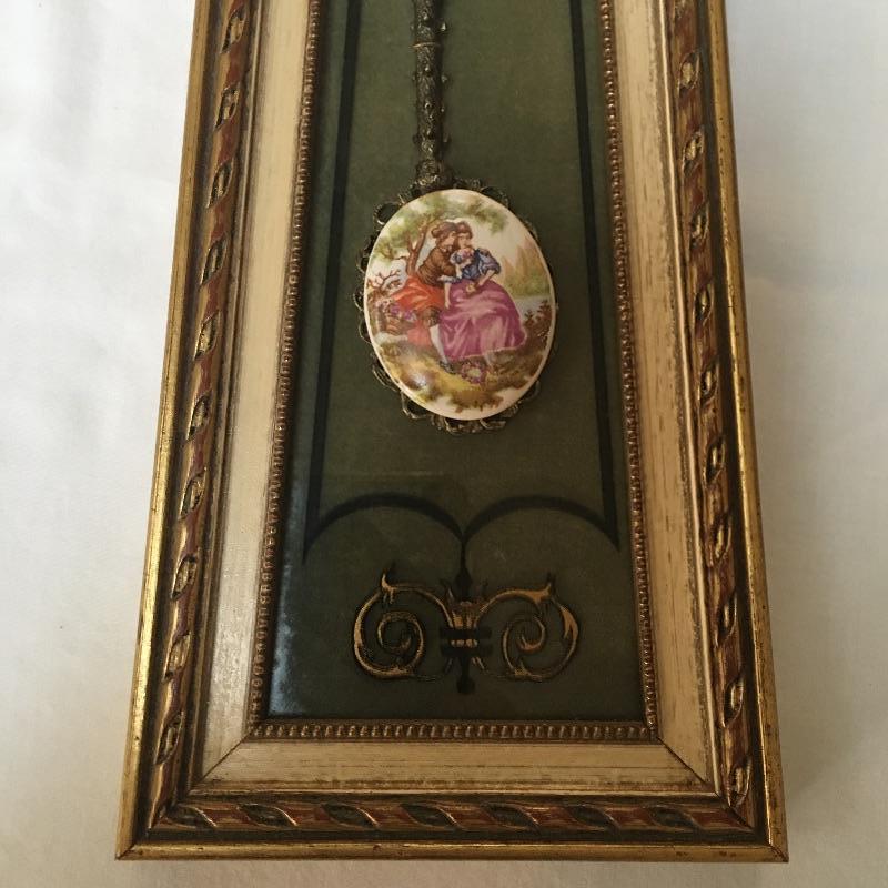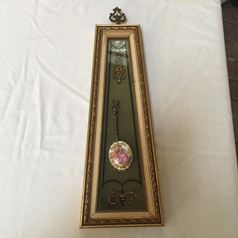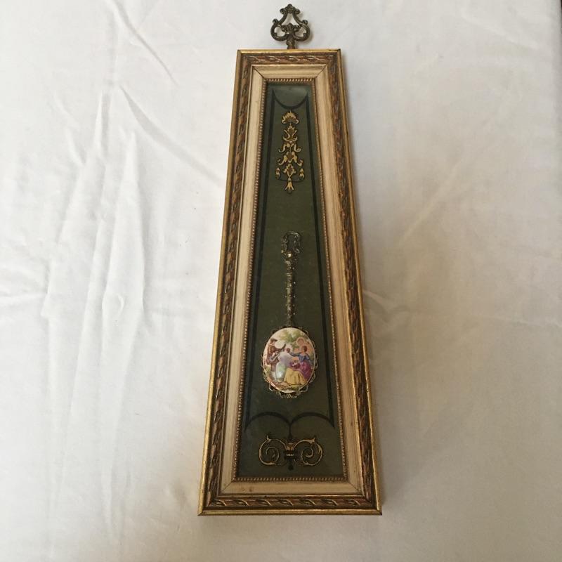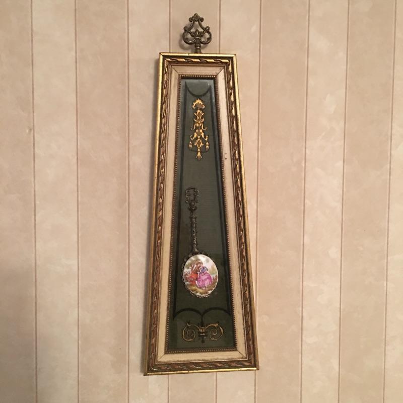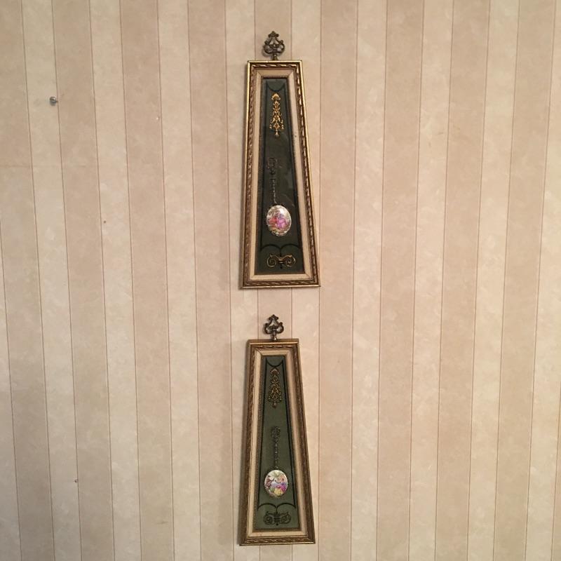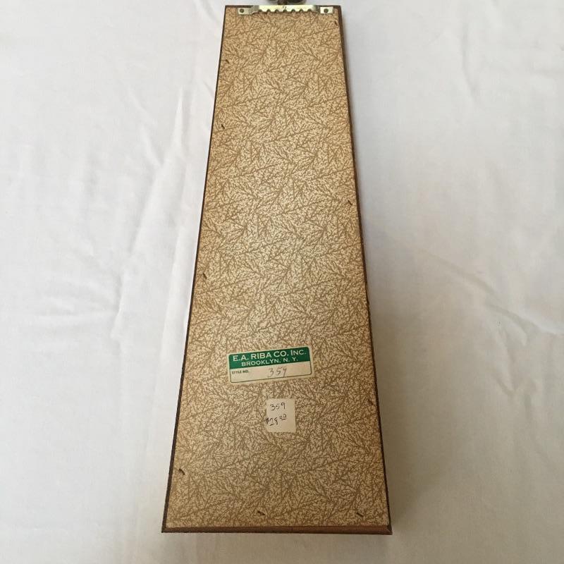 Two Italian style Renaissance art wall hangings. Unique trapezoidal shaped wall hangings with painted glass covering green felt. The ceramic and metal piece is attached on top of the glass. Definitely a conversation starter. These pieces are similar to those in Lot 50. Sticker on back says E.A. RIBA Co. in Brooklyn NY.