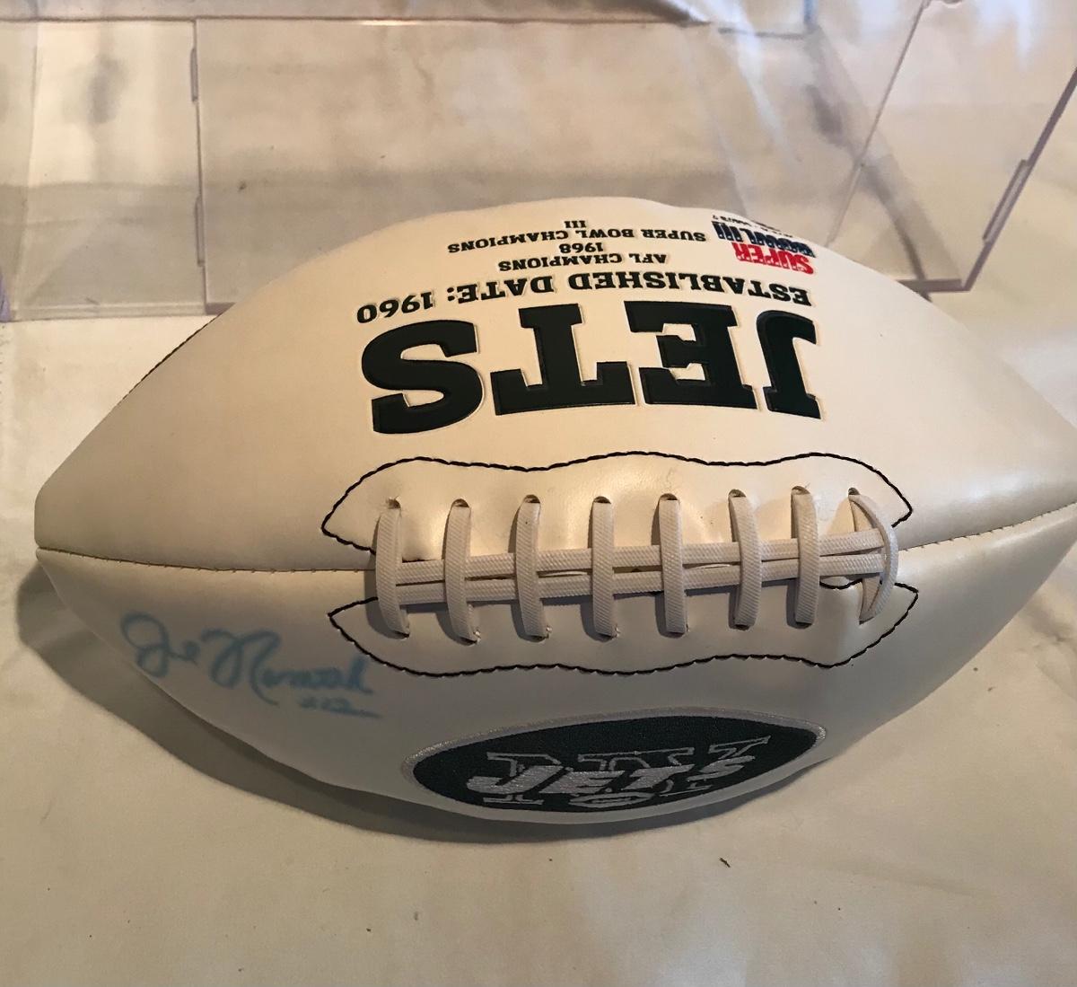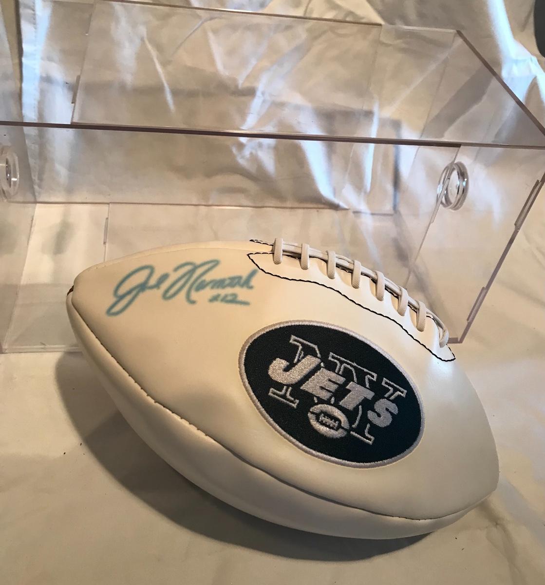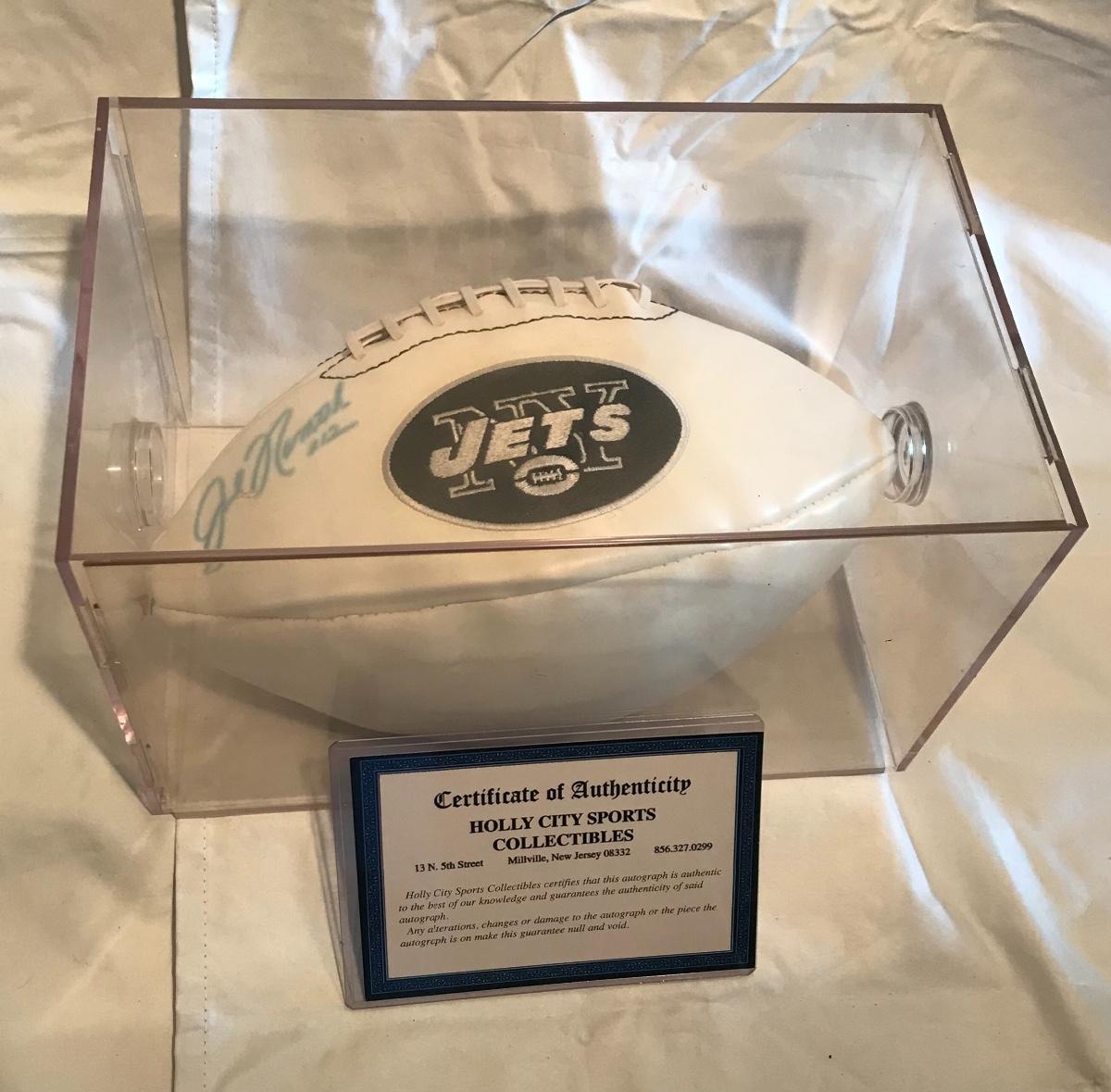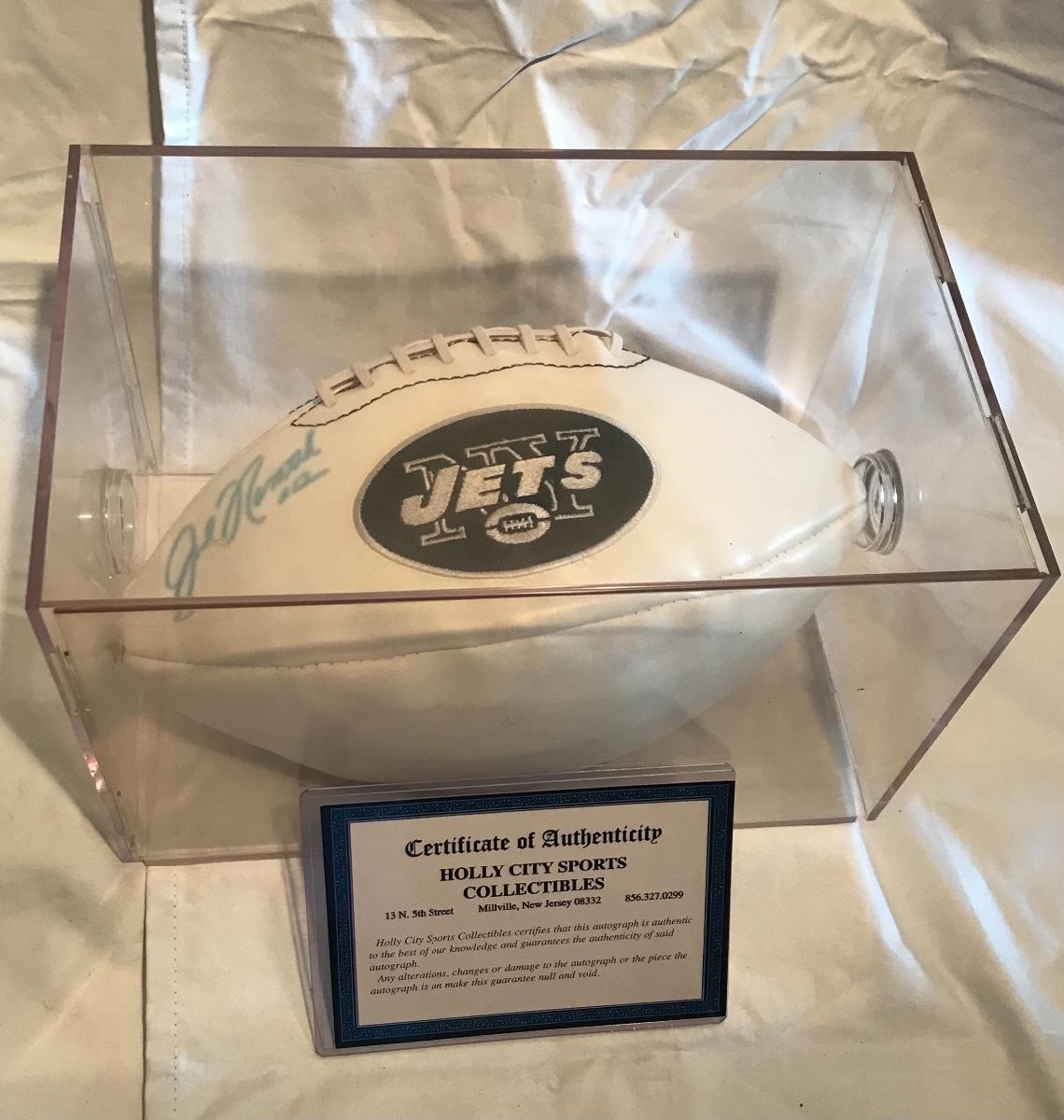 Football autographed by Joe Namath in plastic case with certificate of authenticity.The pictures show condition, measurements if taken, and what is included in the lot. Due to the large amount that we photograph and the time frame, we are not always able to take measurements. All items unless noted, are pre-owned and have been used. If you purchased furniture, you must bring help. We do not allow one person to carry large furniture out on their own. Bring help, tools and a truck for the safety of our client’s homes, and your personal safety. Company policy. Thank you.