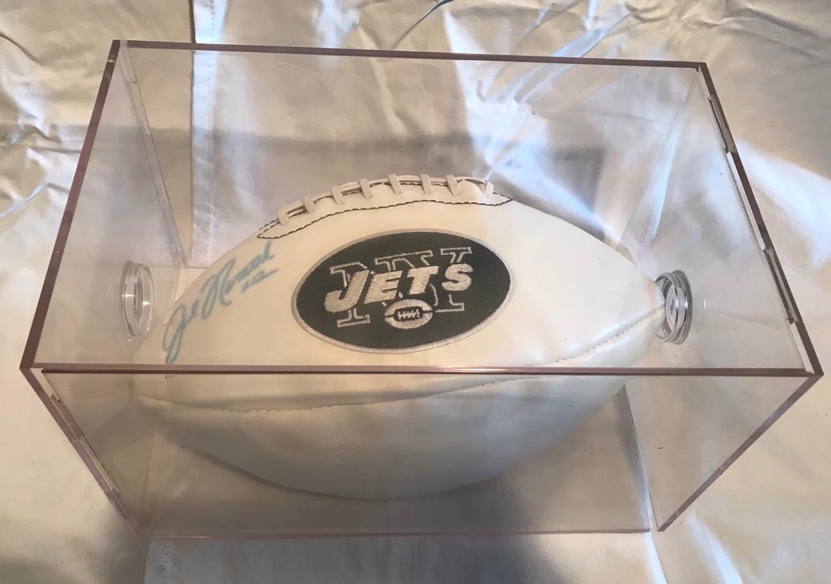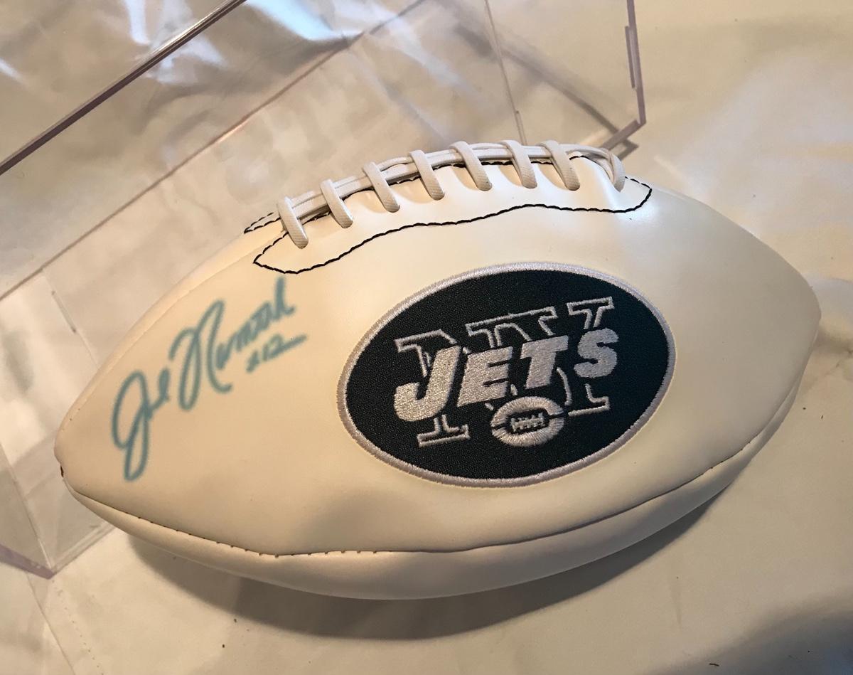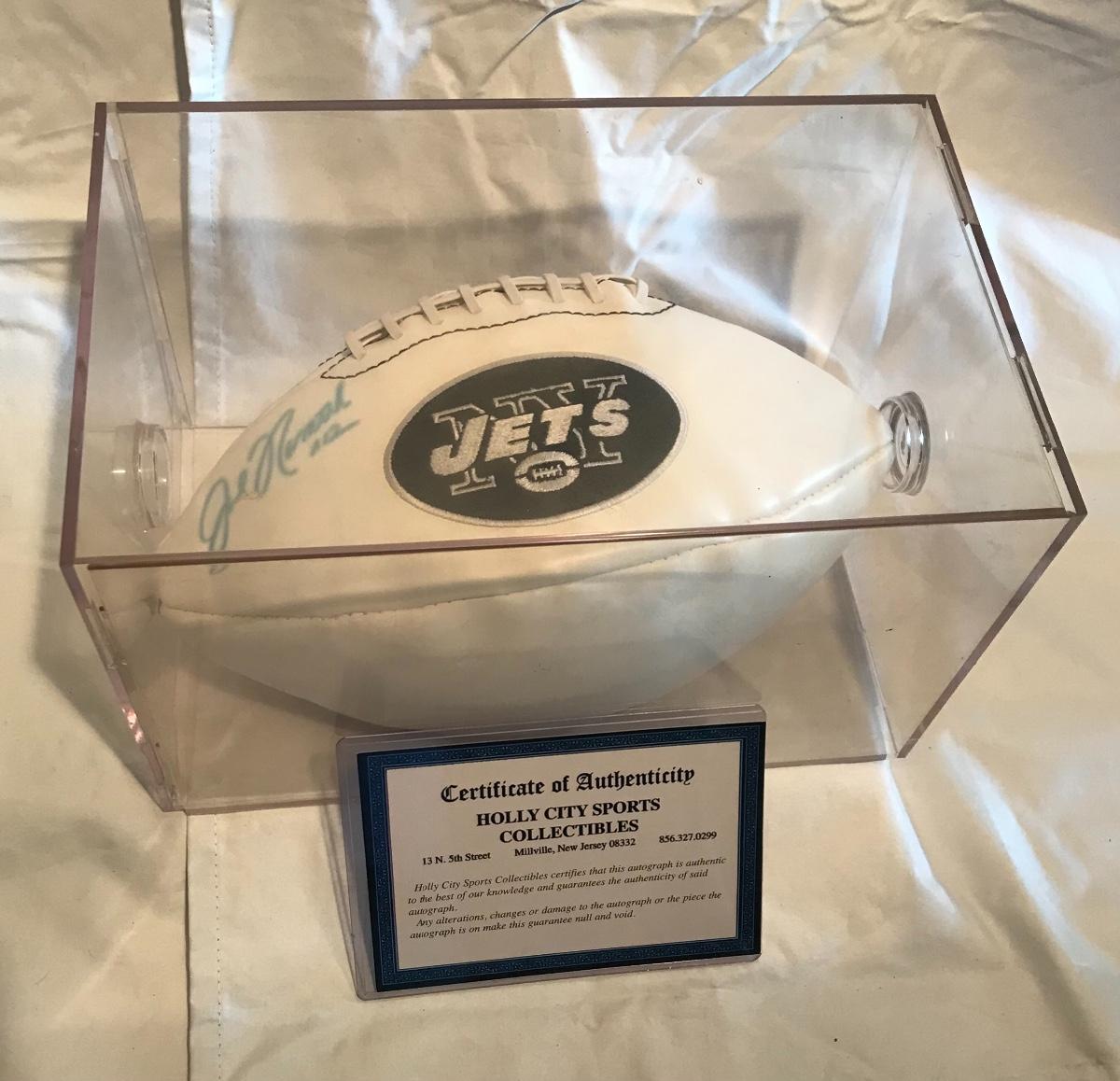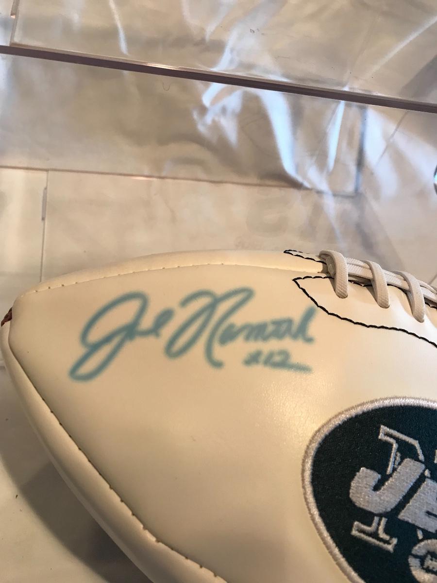 Football autographed by Joe Namath in plastic case with certificate of authenticity.The pictures show condition, measurements if taken, and what is included in the lot. Due to the large amount that we photograph and the time frame, we are not always able to take measurements. All items unless noted, are pre-owned and have been used. If you purchased furniture, you must bring help. We do not allow one person to carry large furniture out on their own. Bring help, tools and a truck for the safety of our client’s homes, and your personal safety. Company policy. Thank you.