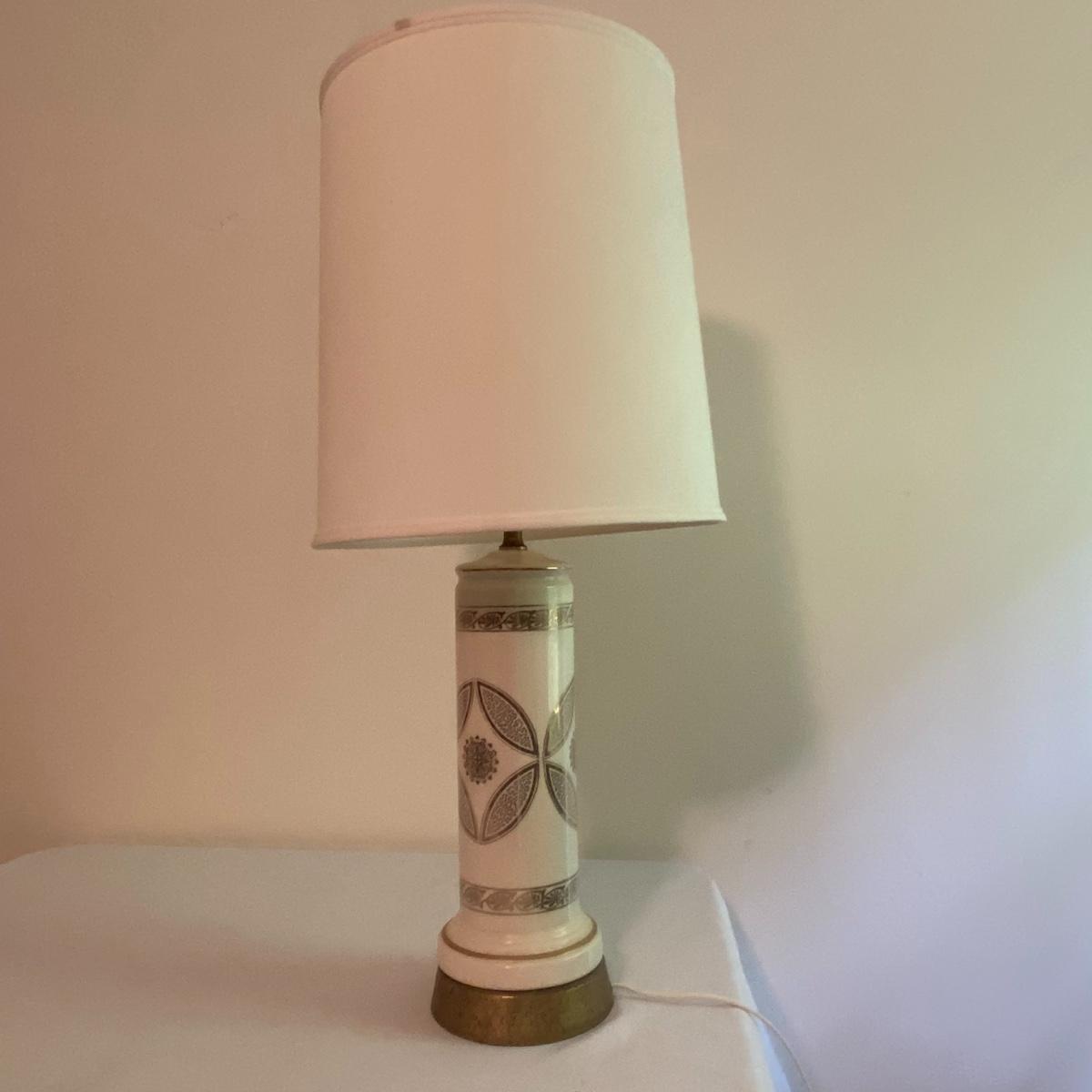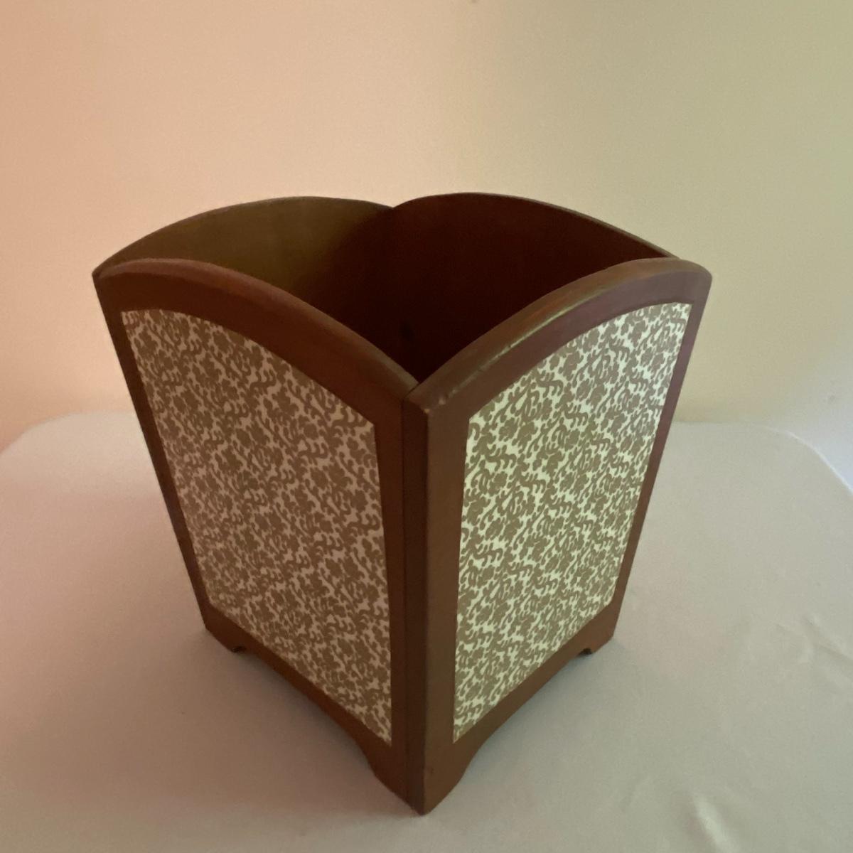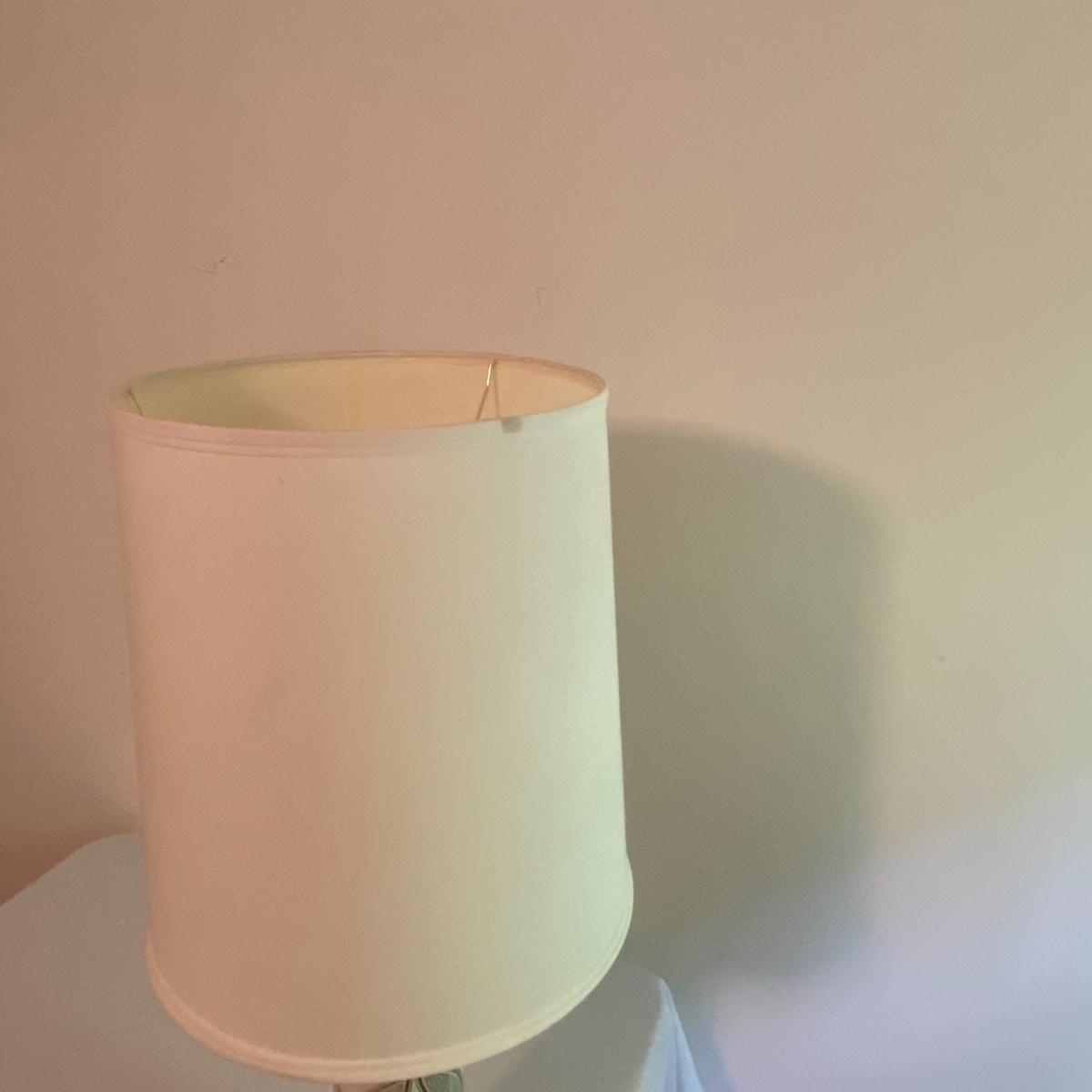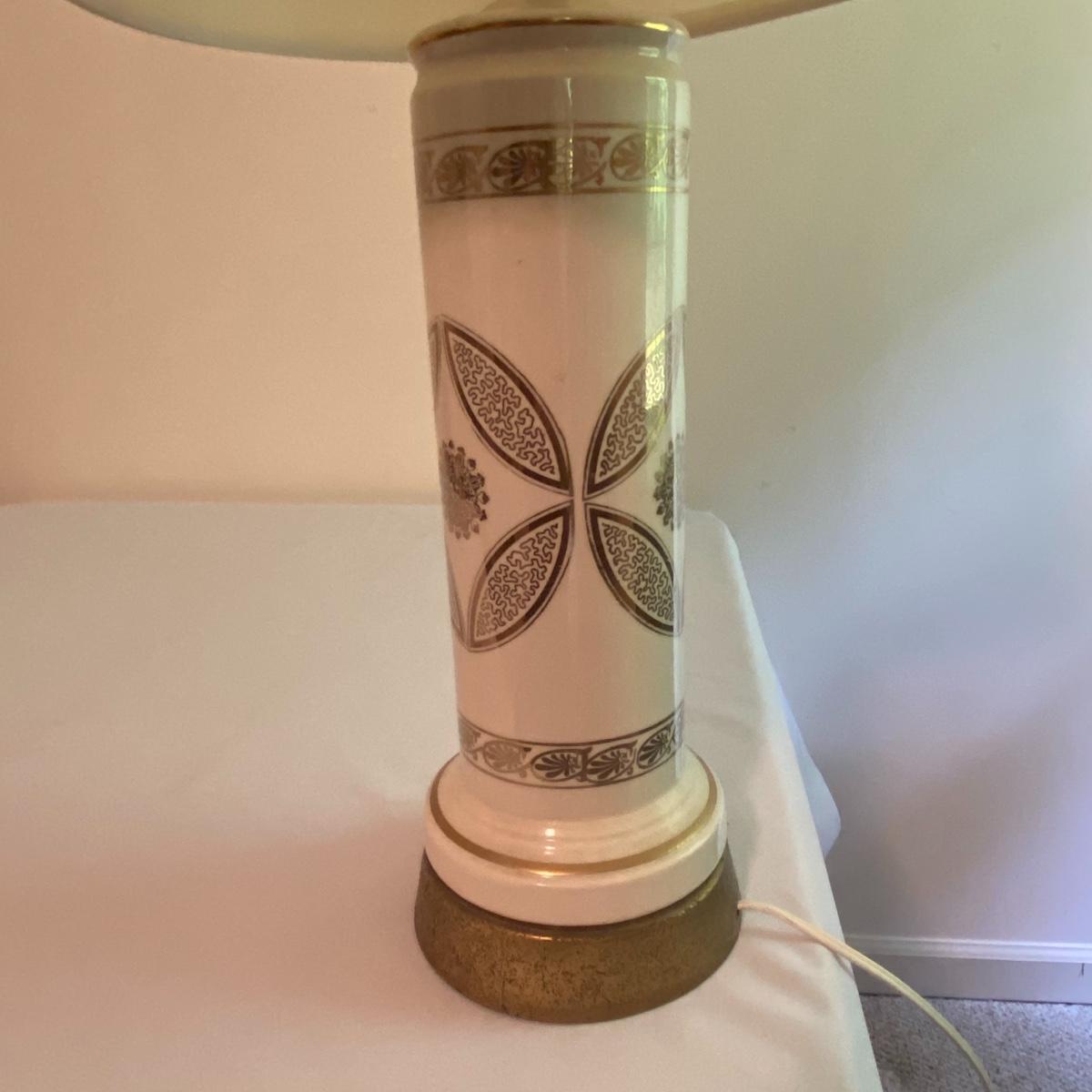 Lot includes adorable large white lamp. Cylinder white base with gold-like floral designs will fancy up any room! Sleek all white shade has a diameter of 12” and the lamp altogether stands 31” tall. The lamp appears to be made of a nice ceramic material. Included in the lot is a wastebasket with white floral designs pair delightfully with the lamp. Wooden waste bin stands 12” tall and the mouth of the bin measures 10”x10”. See photos. Local pickup only.
