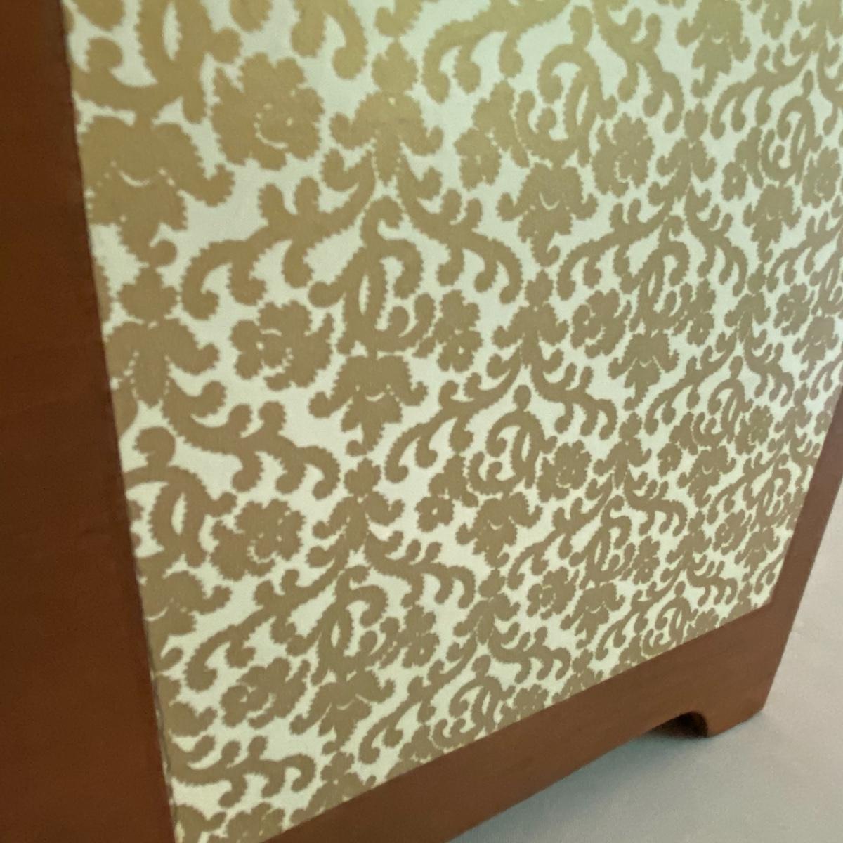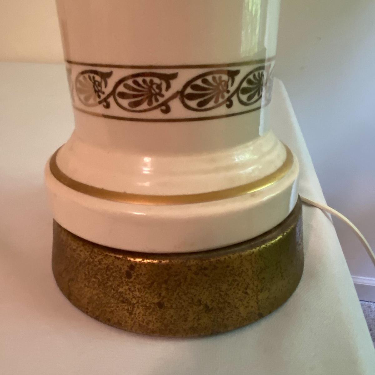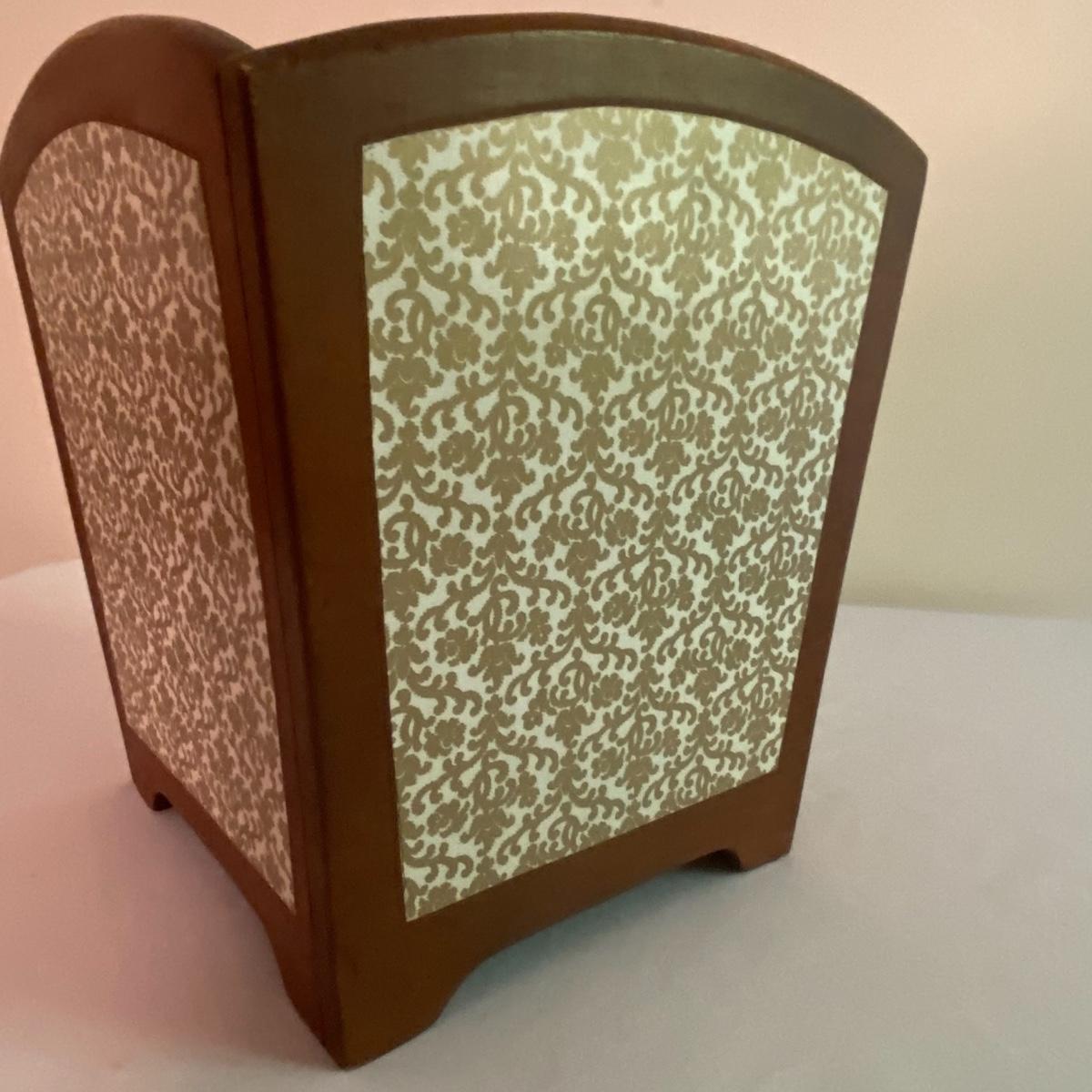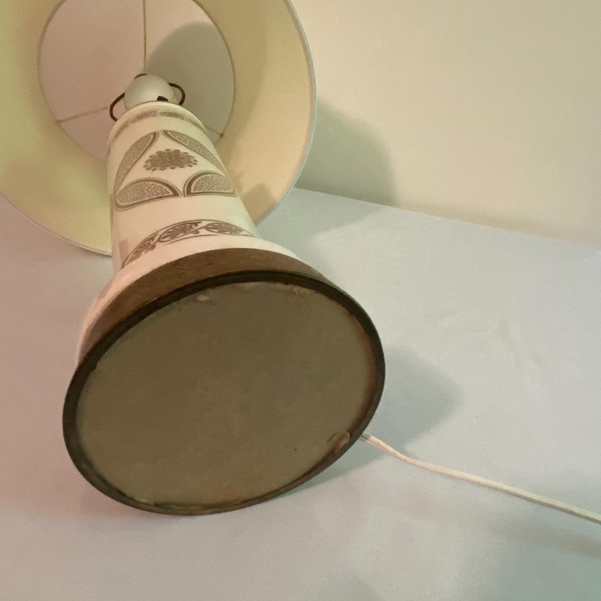 Lot includes adorable large white lamp. Cylinder white base with gold-like floral designs will fancy up any room! Sleek all white shade has a diameter of 12” and the lamp altogether stands 31” tall. The lamp appears to be made of a nice ceramic material. Included in the lot is a wastebasket with white floral designs pair delightfully with the lamp. Wooden waste bin stands 12” tall and the mouth of the bin measures 10”x10”. See photos. Local pickup only.