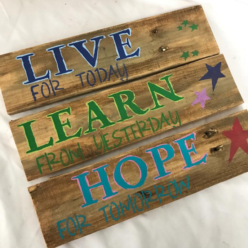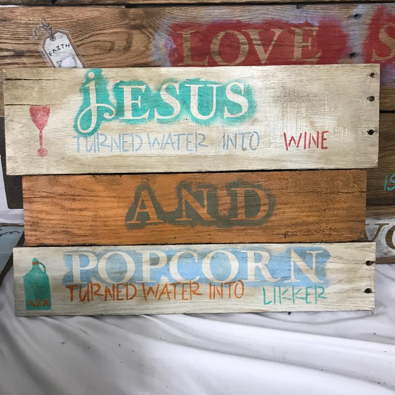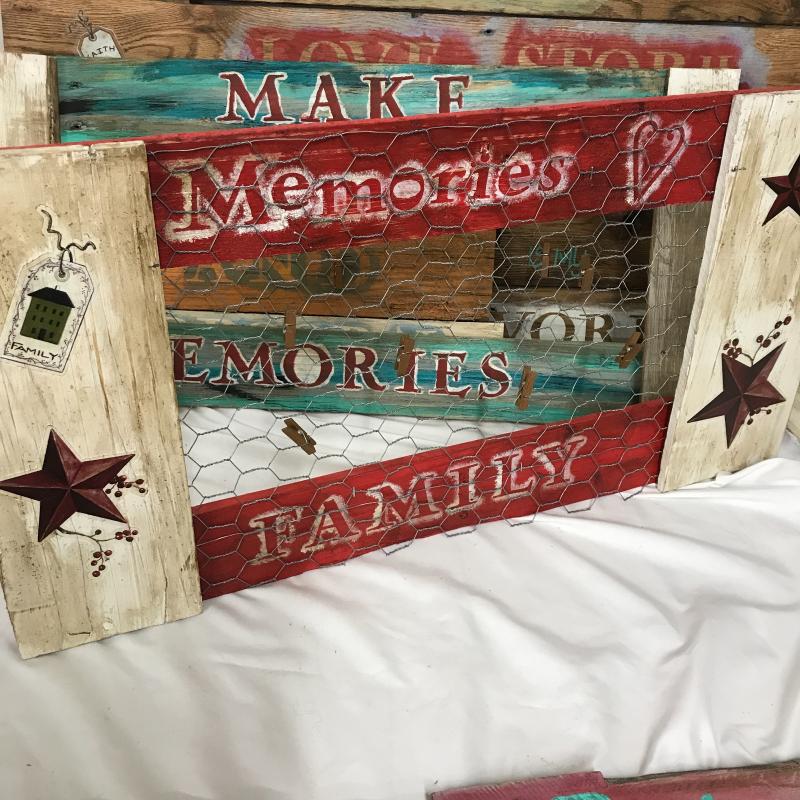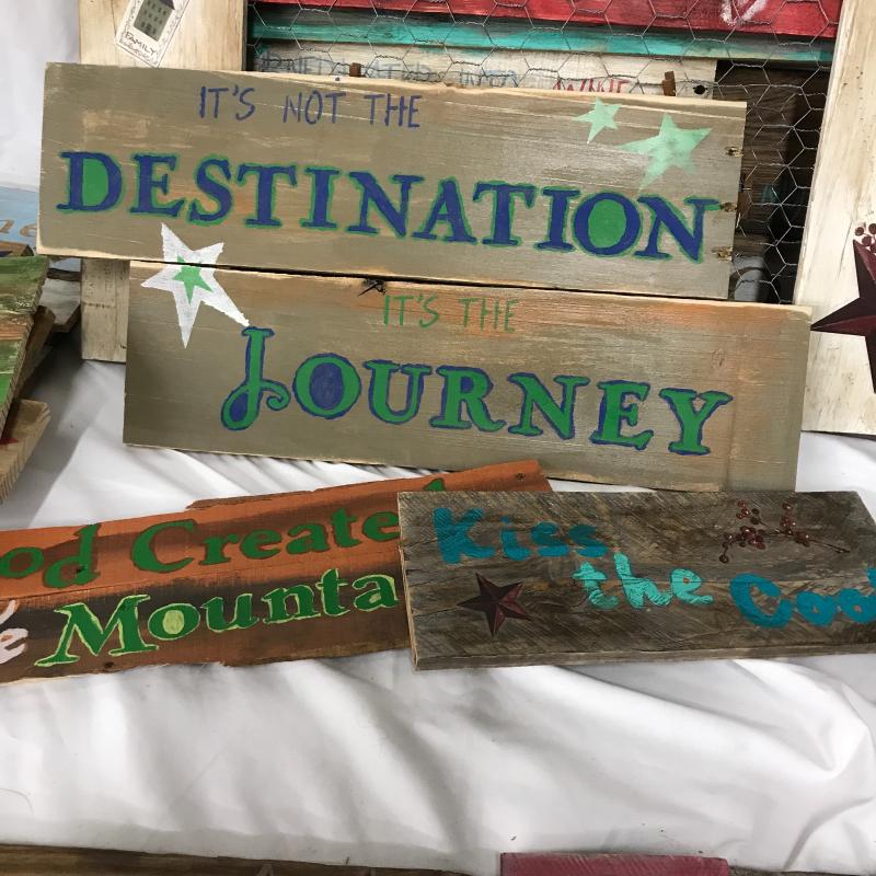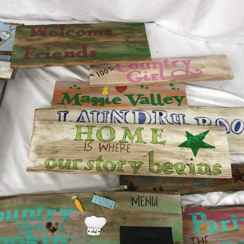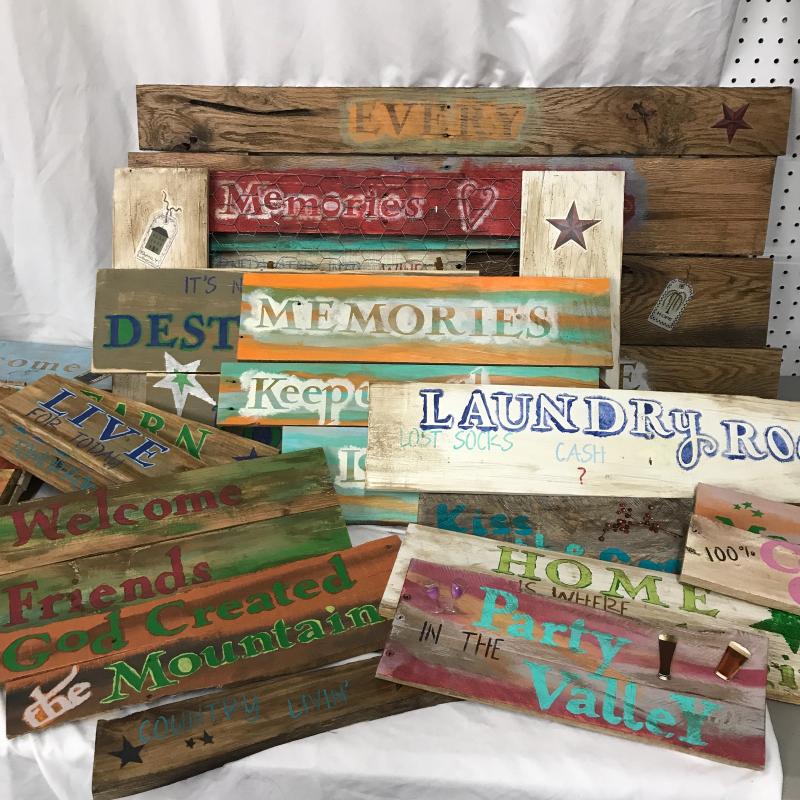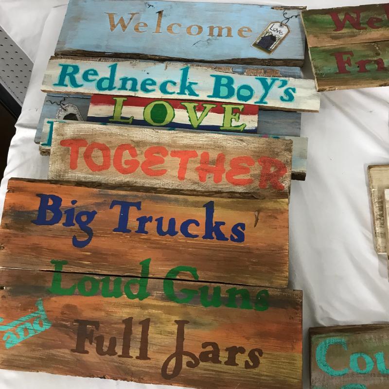 Fun signs with quotes painted on wood. Use in your home or give as gifts. Two of them also have a built-in screen with hooks to add photos. Various sizes. Largest is 38.5” x 18”. Local pick up only in Maggie Valley, NC.