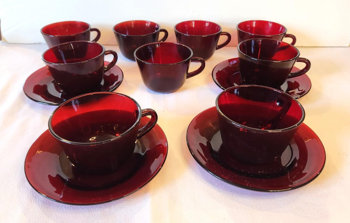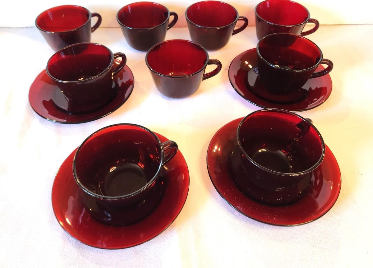 Nice lot of vintage (1940's) Ruby Red cups/Saucers - 9 cups, 4 saucers. Good condition.