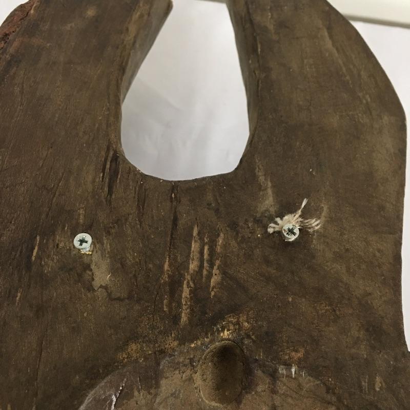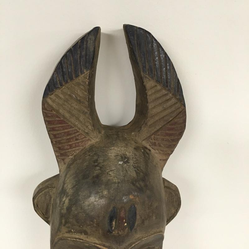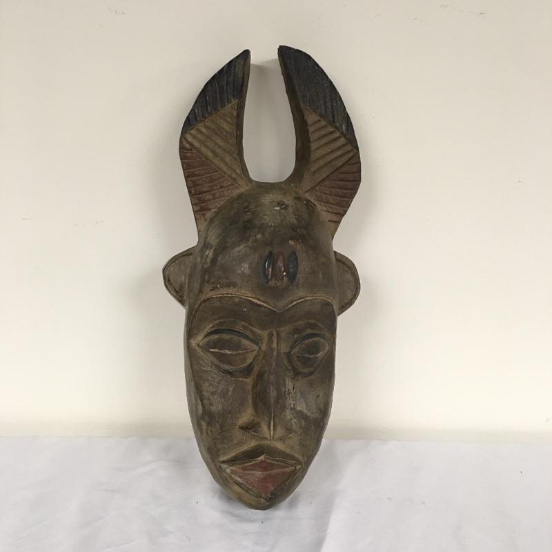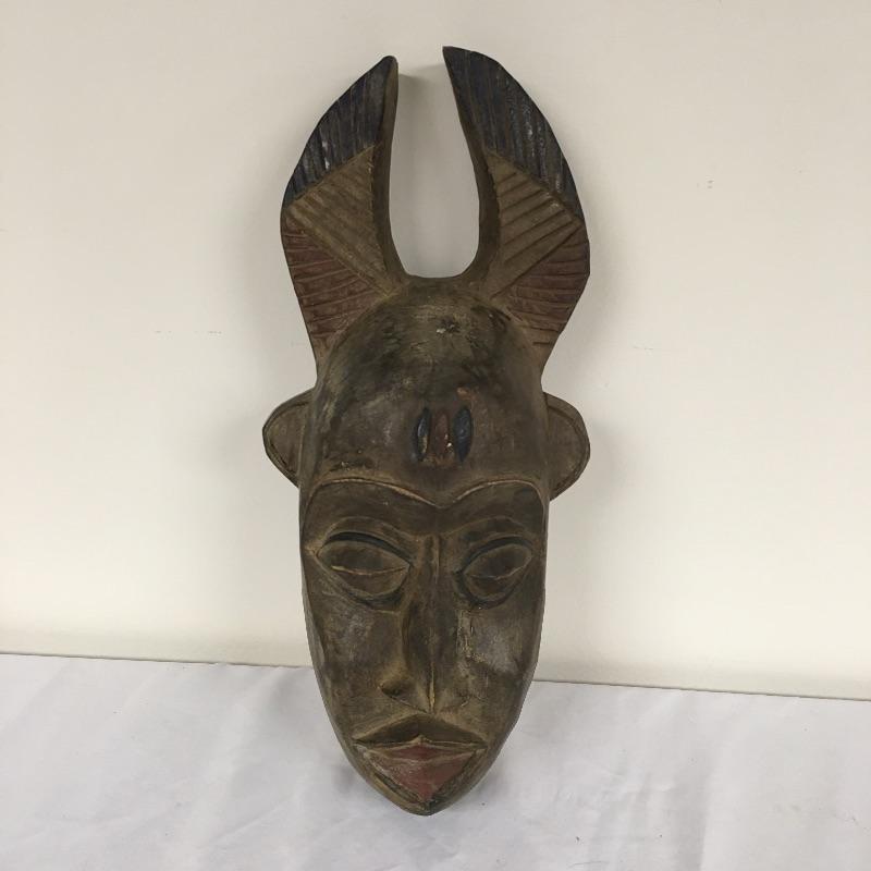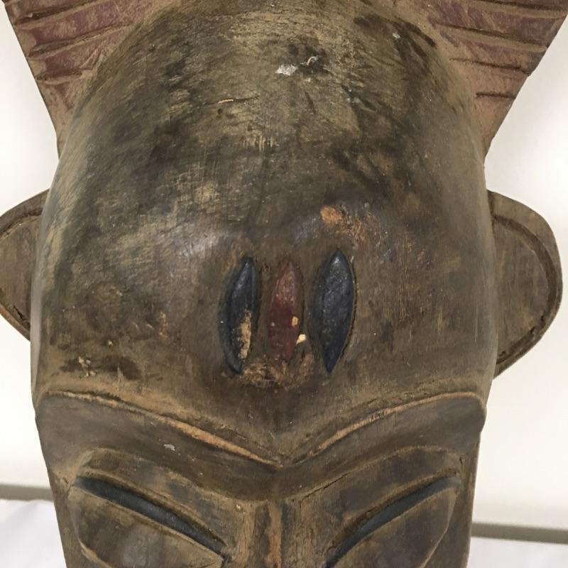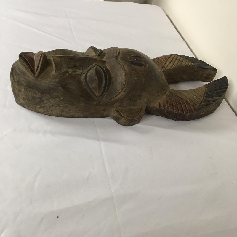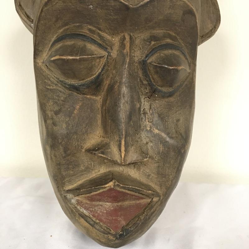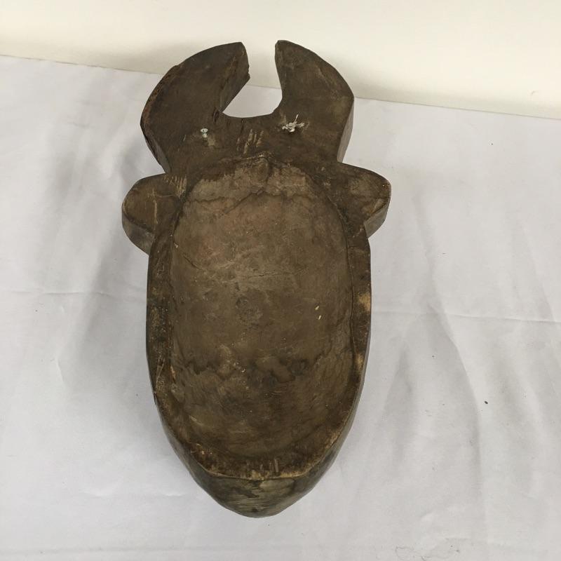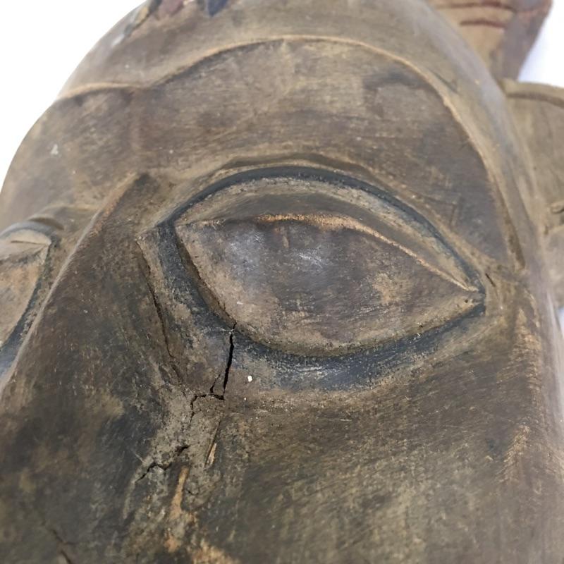 Heavy wooden mask with helmet crest and painted accents. There are no eye openings. Mask has a crack by eye, see pictures.