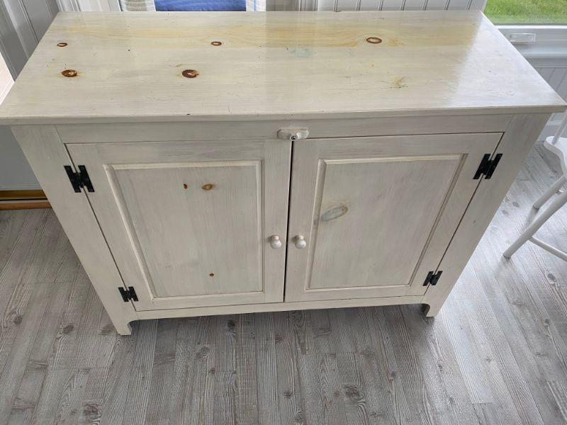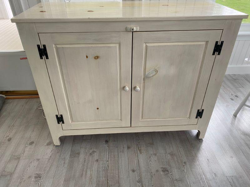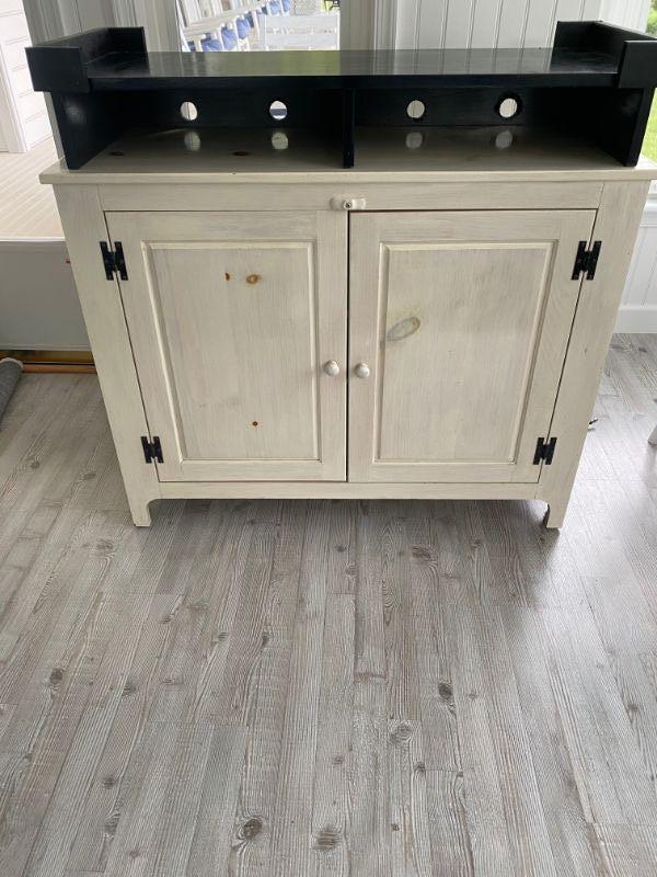 White washed style cabinet for storage or television . This comes with a custom made shelf the homeowner used to raise television and have cable boxes on the top. this cabinet measures43.5" wide x 34" tall x 18" deep