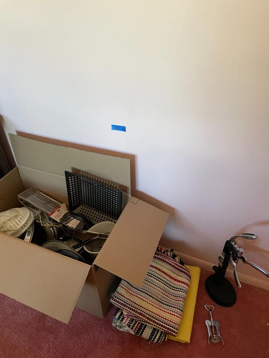 Lot 26- Misc. kitchen items, table cloths, wine openers