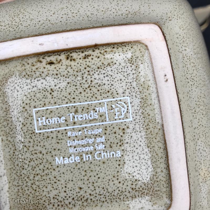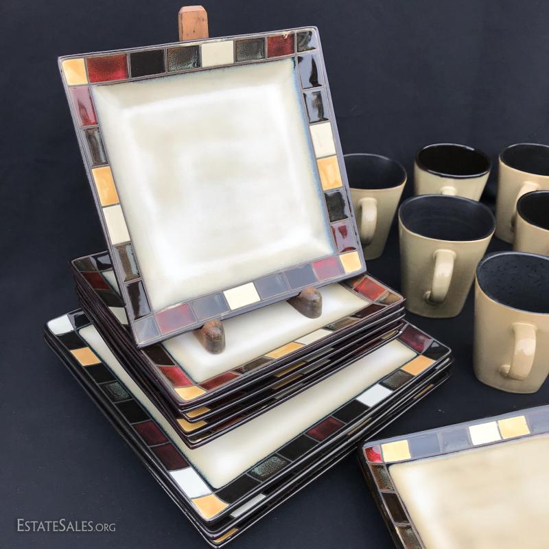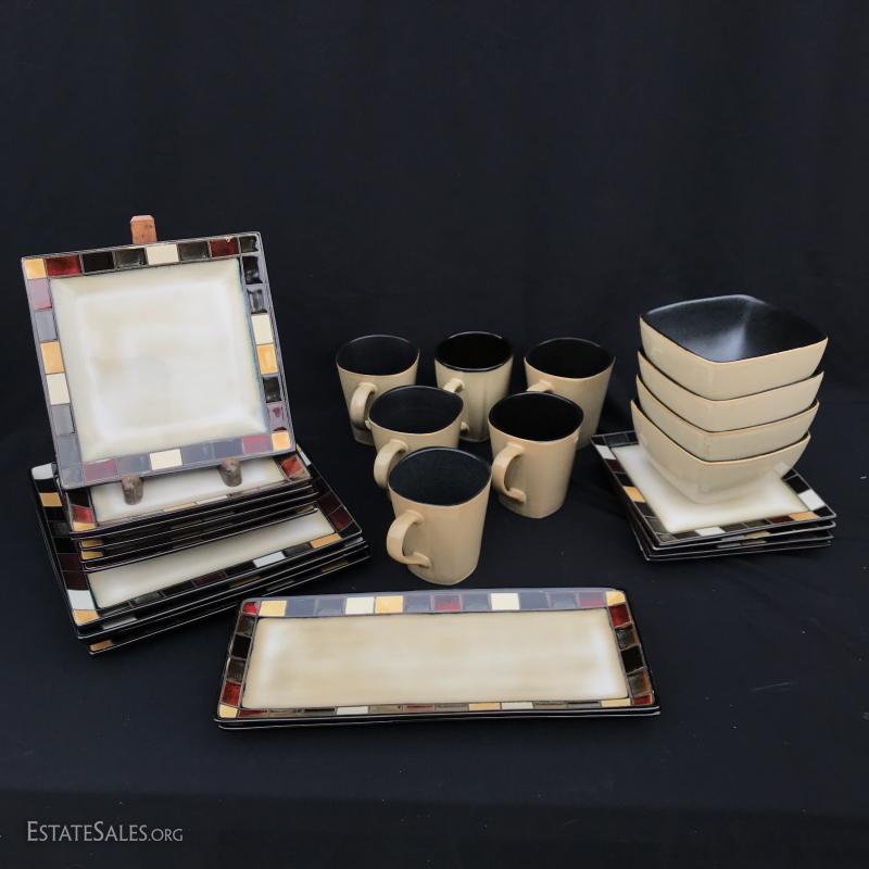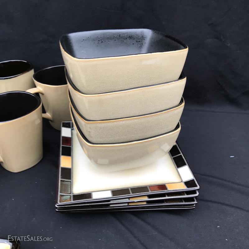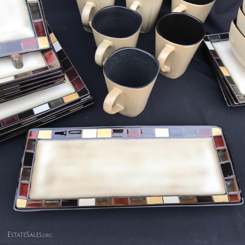 New set of dishes includes four place settings and some extra pieces. 26 pieces in all. Handsome design with colored tile edge. Made by Home Trends. No shipping Available. Only local pick up in Asheville, NC.