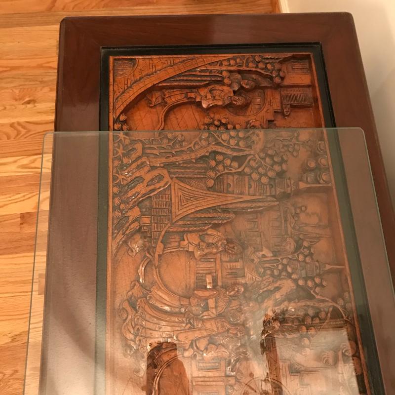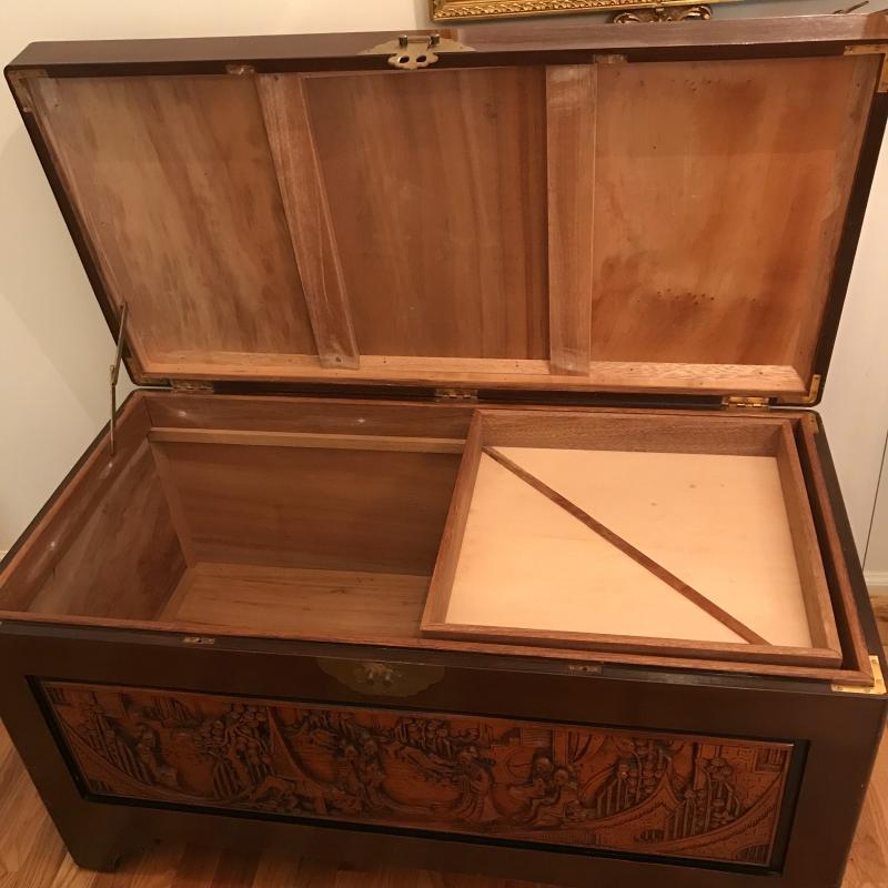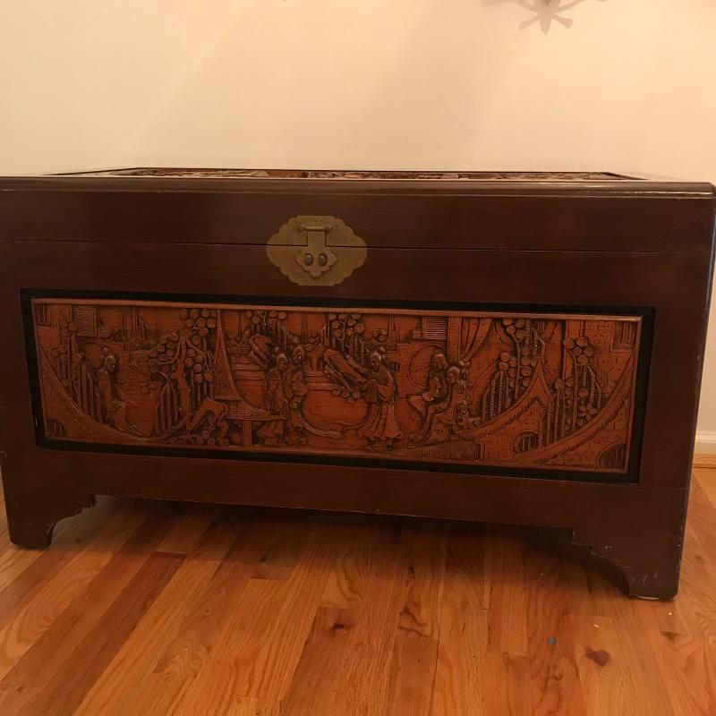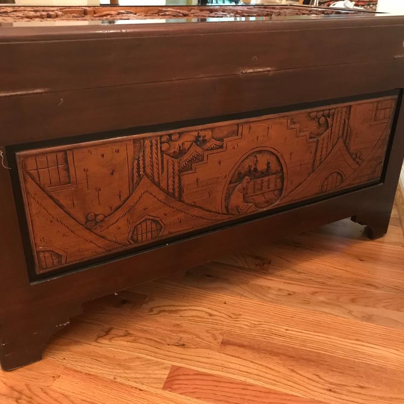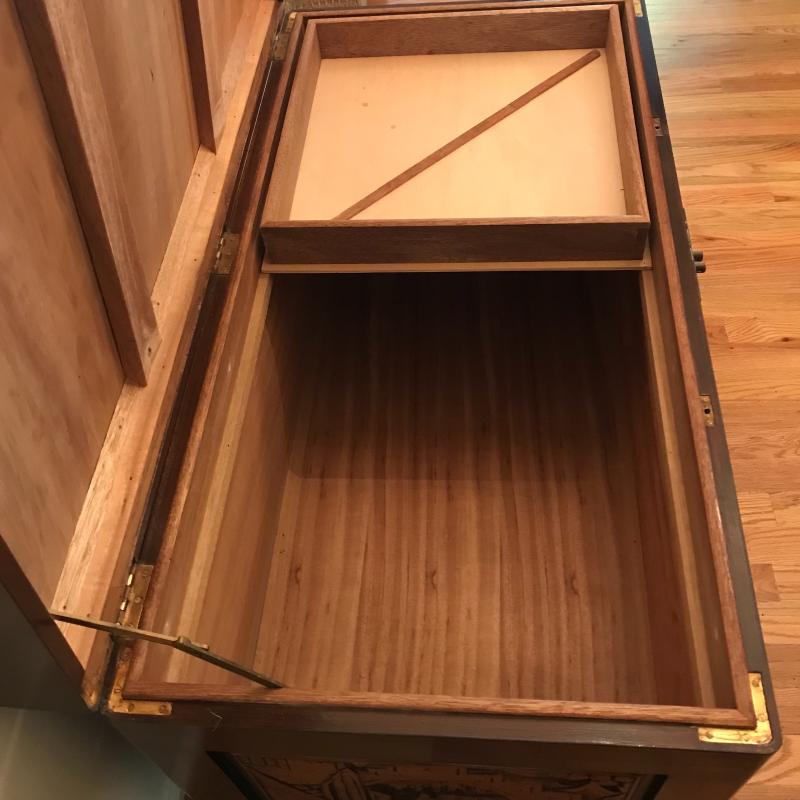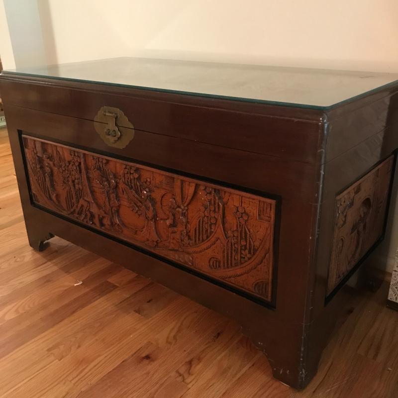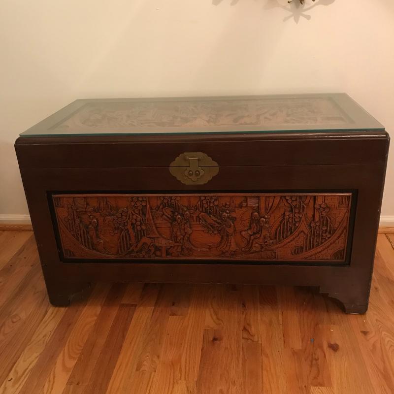 Absolutely remarkable. This gorgeous all wood trunk measures 40”x20”x22.27” with brass fixtures. Ornate relief carvings on wood on five sides. Includes a protective glass top which is removable. The inside organizing box is also removable. Local pick up only in Arden, NC.