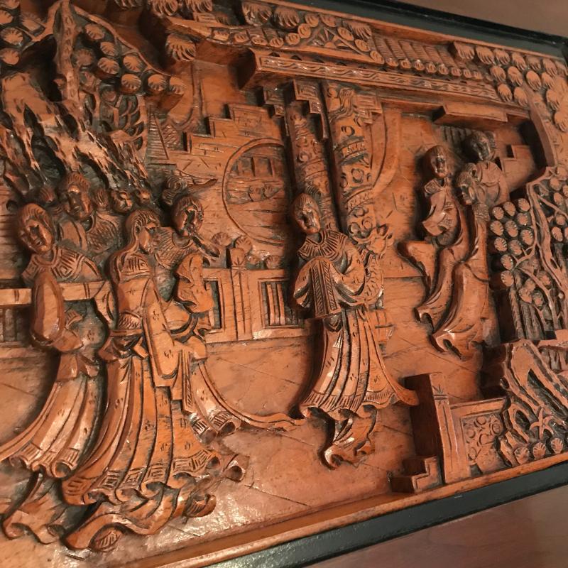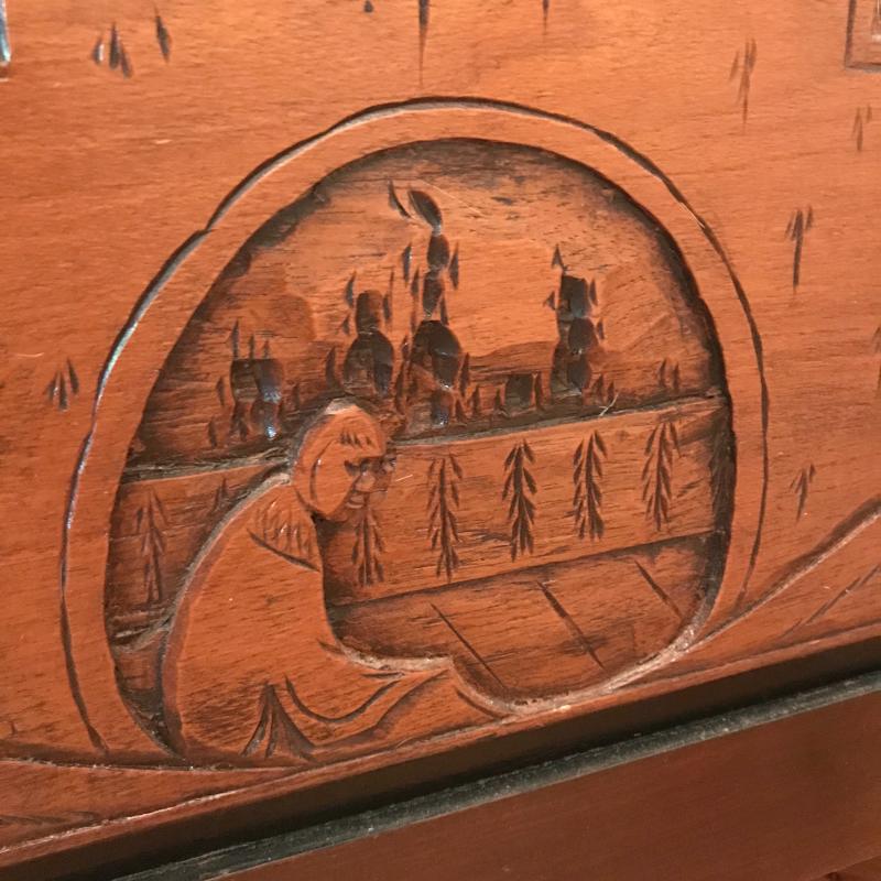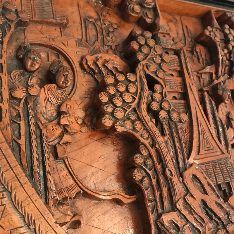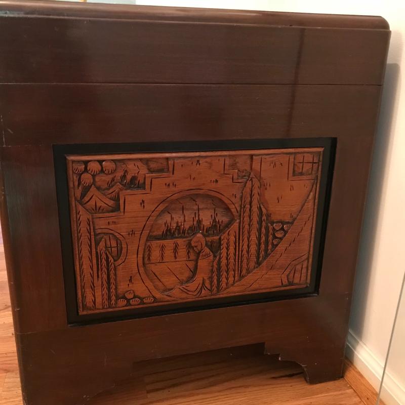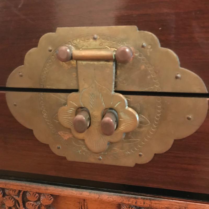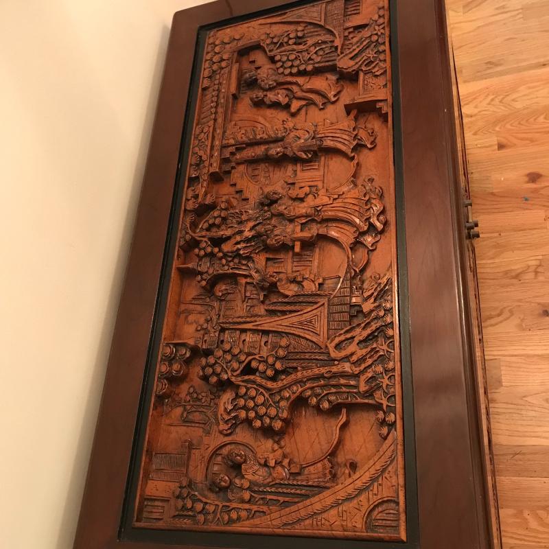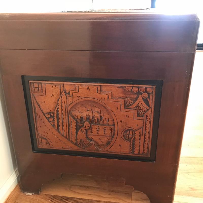 Absolutely remarkable. This gorgeous all wood trunk measures 40”x20”x22.27” with brass fixtures. Ornate relief carvings on wood on five sides. Includes a protective glass top which is removable. The inside organizing box is also removable. Local pick up only in Arden, NC.