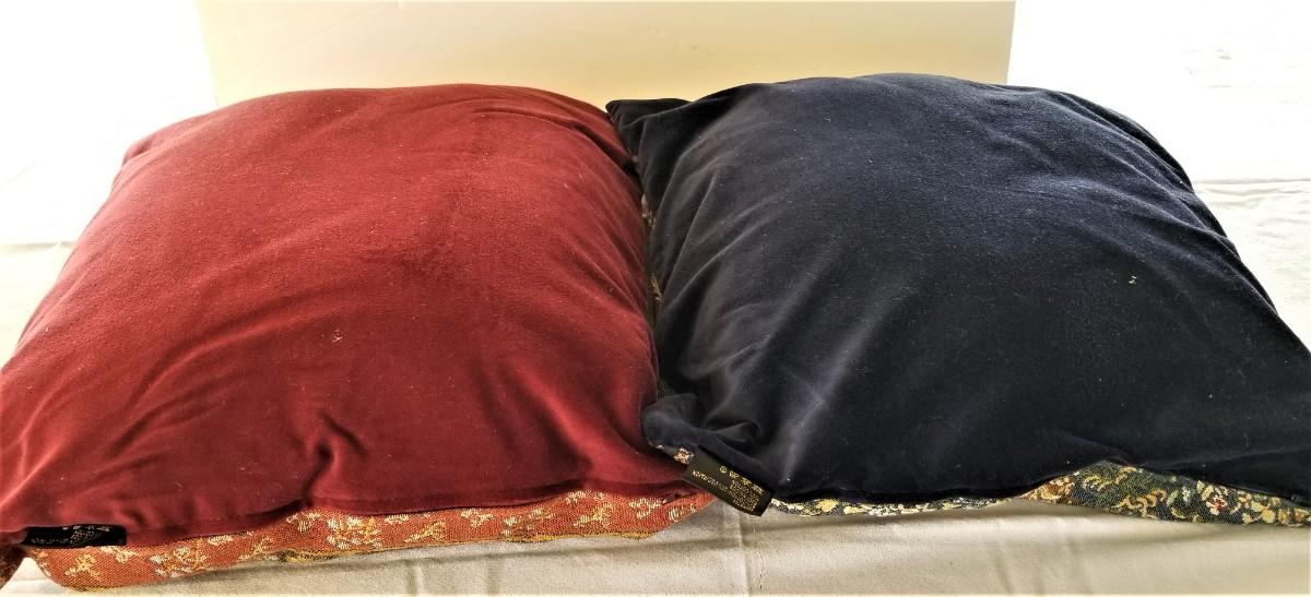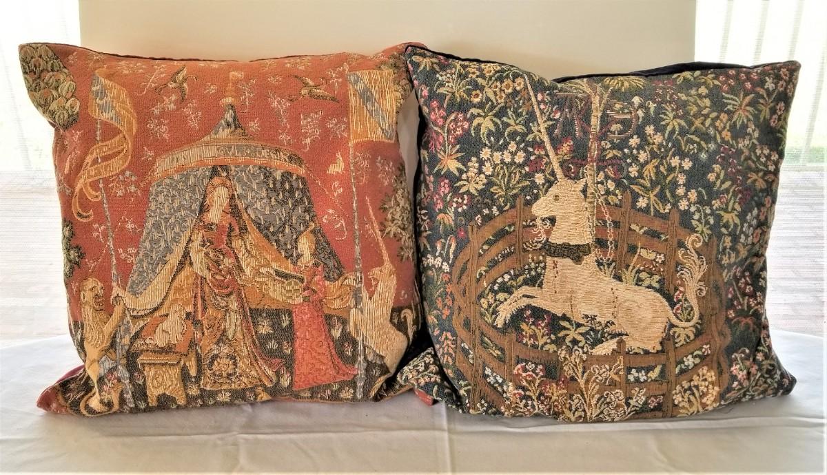 Nice pair of quality French Sofa Cushions - classical medieval scenes featuring unicorns. Each measures 18" x 17". Gently used condition, Made by Gobly's - France.