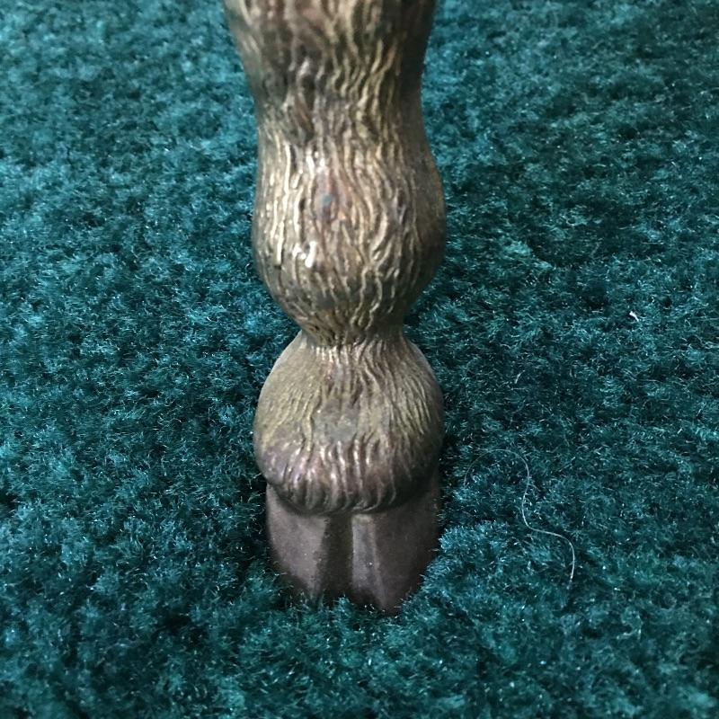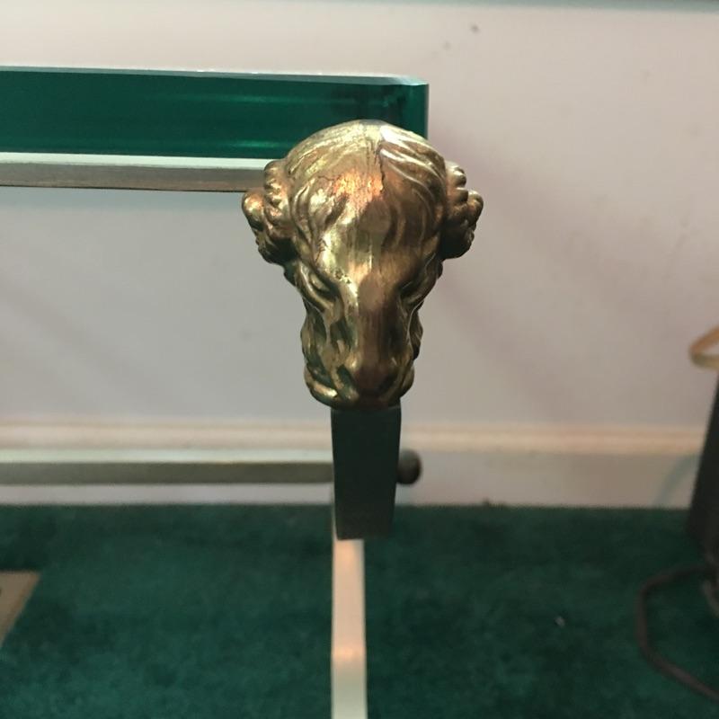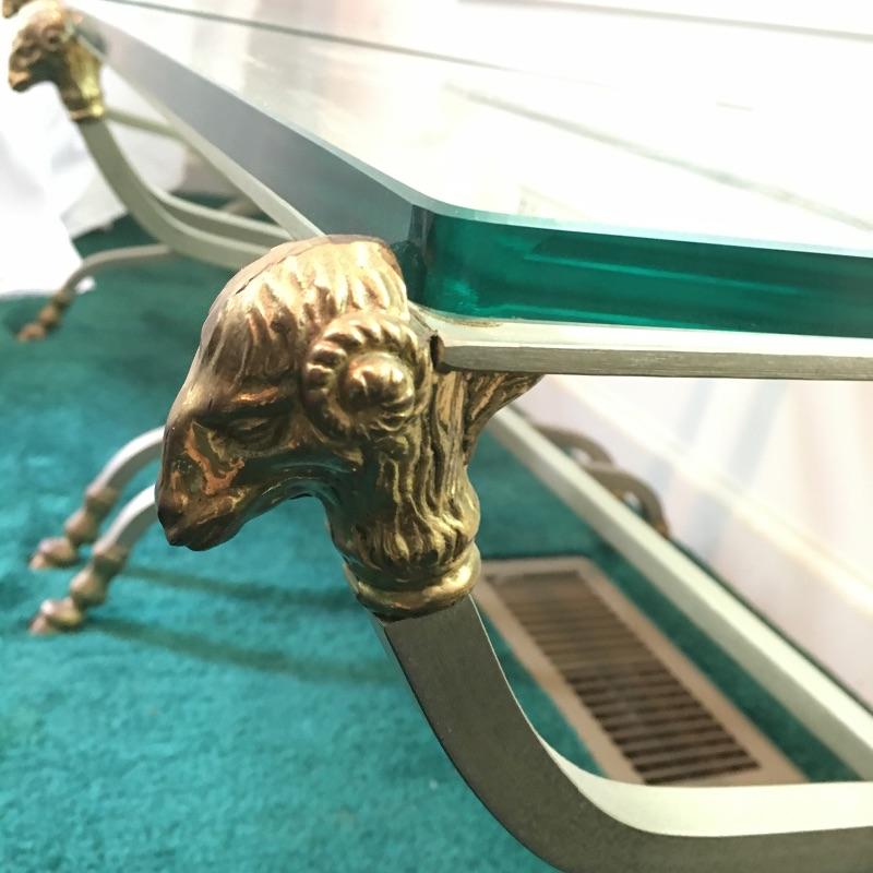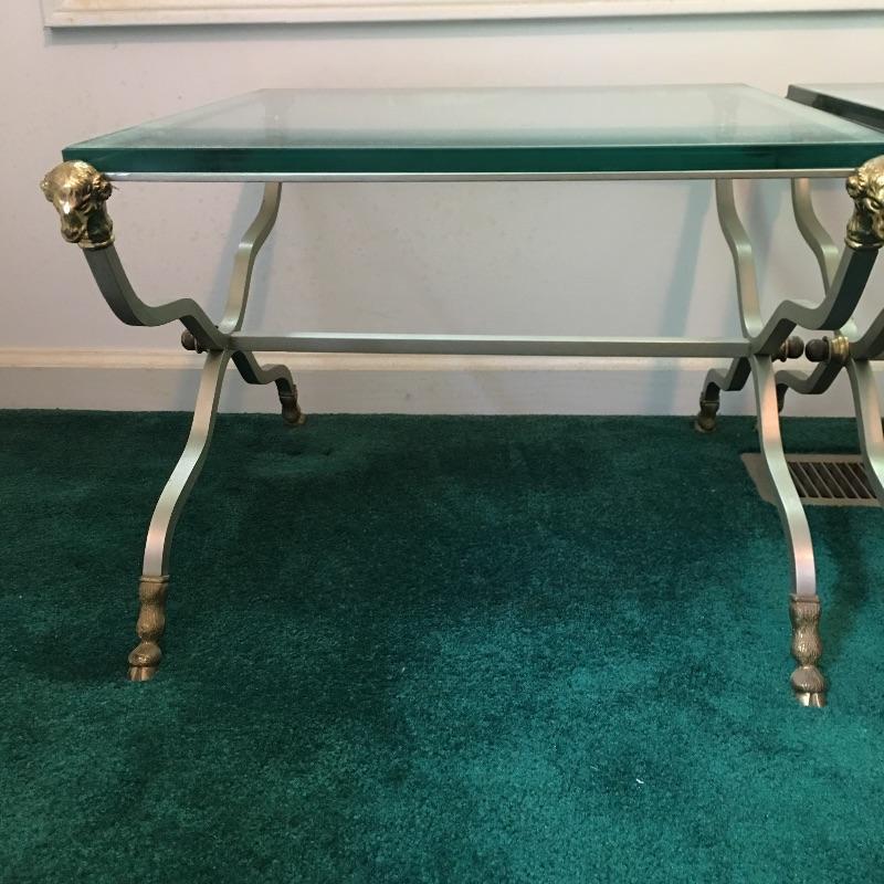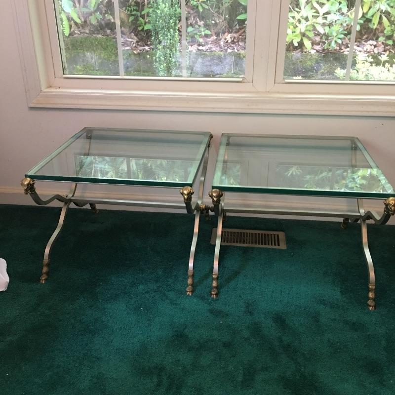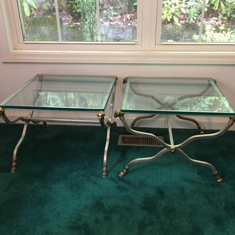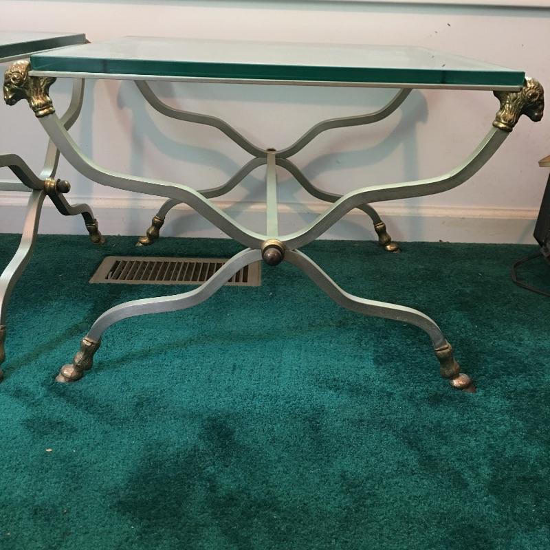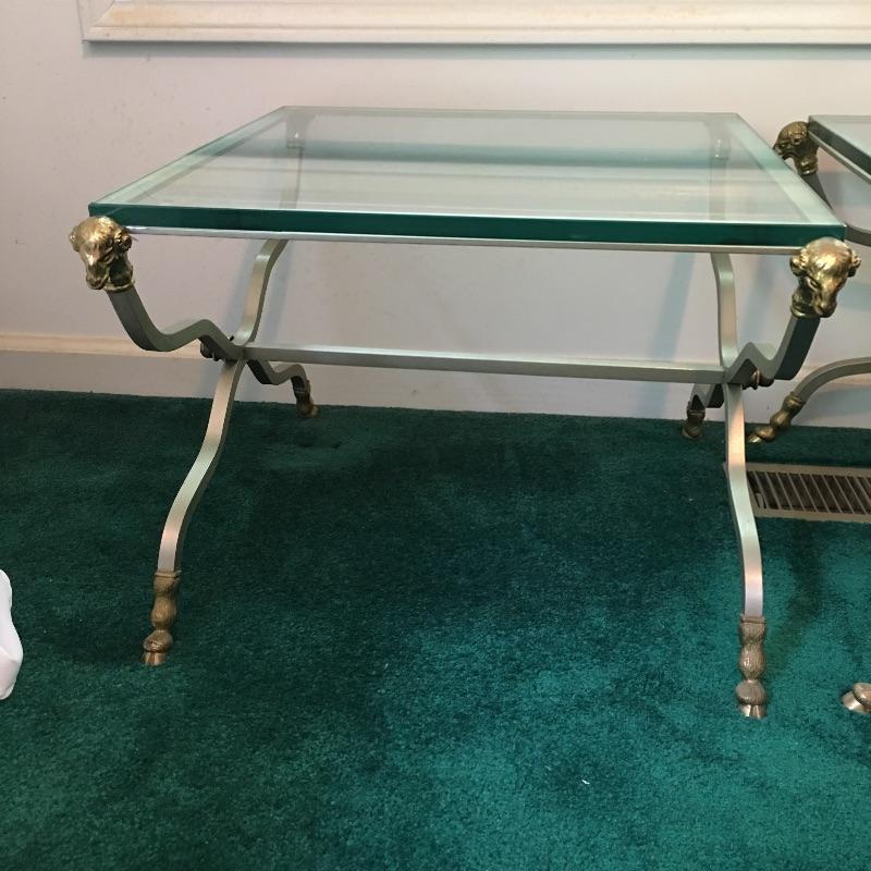 Pair of iron and glass side tables that measure 20” x 20” x 15.5”. Tables have rams head at the top and rams feet for the legs. Table appears to be iron with brass and and a 1/2 thick piece of glass. Bring help items are substantial. These would look great in a office, man cave or she-shed!