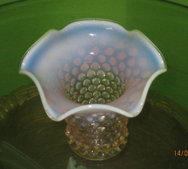 Very pretty vase that is light pink with milk glass highlights. It is about 4.5".