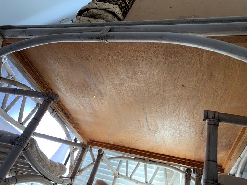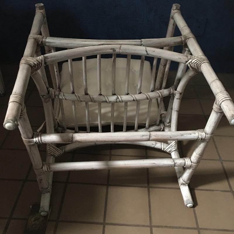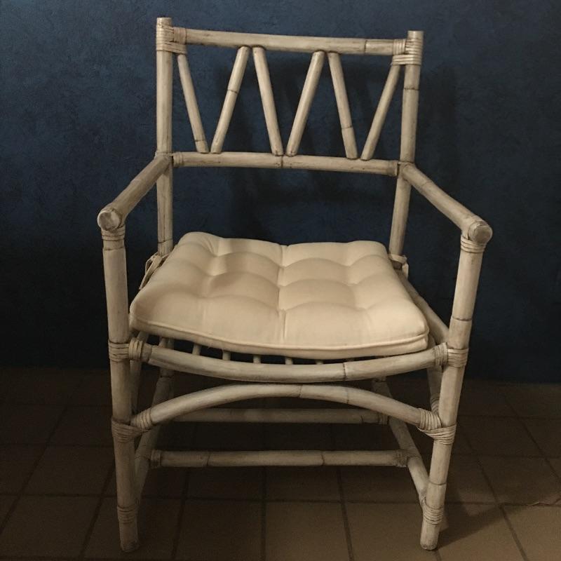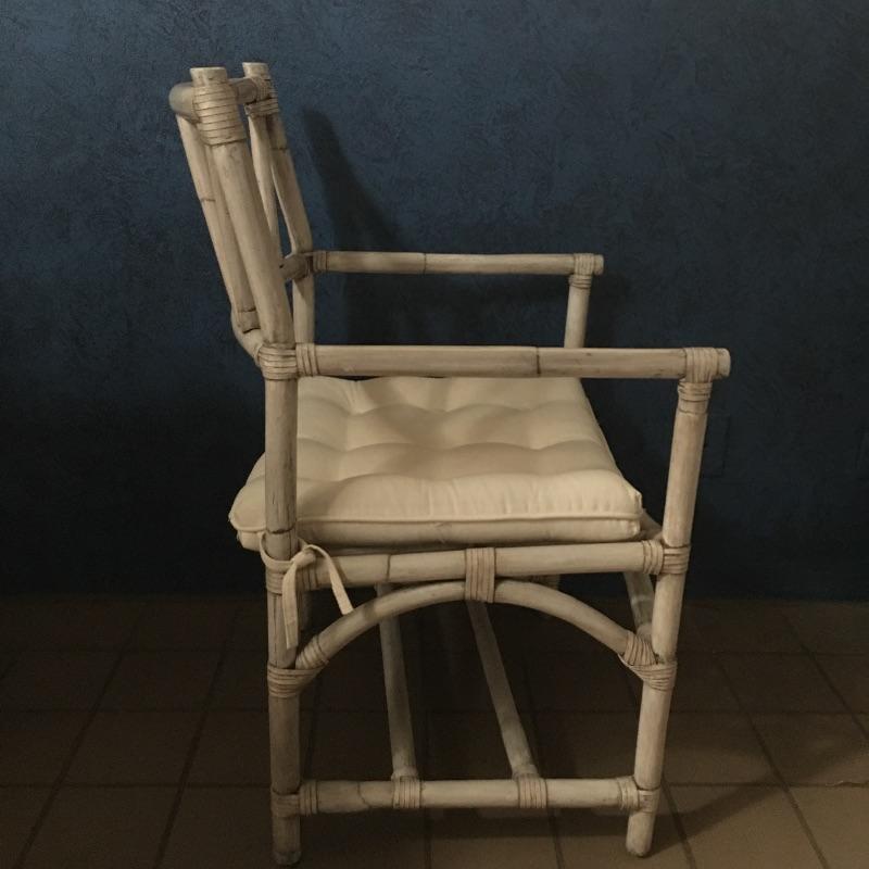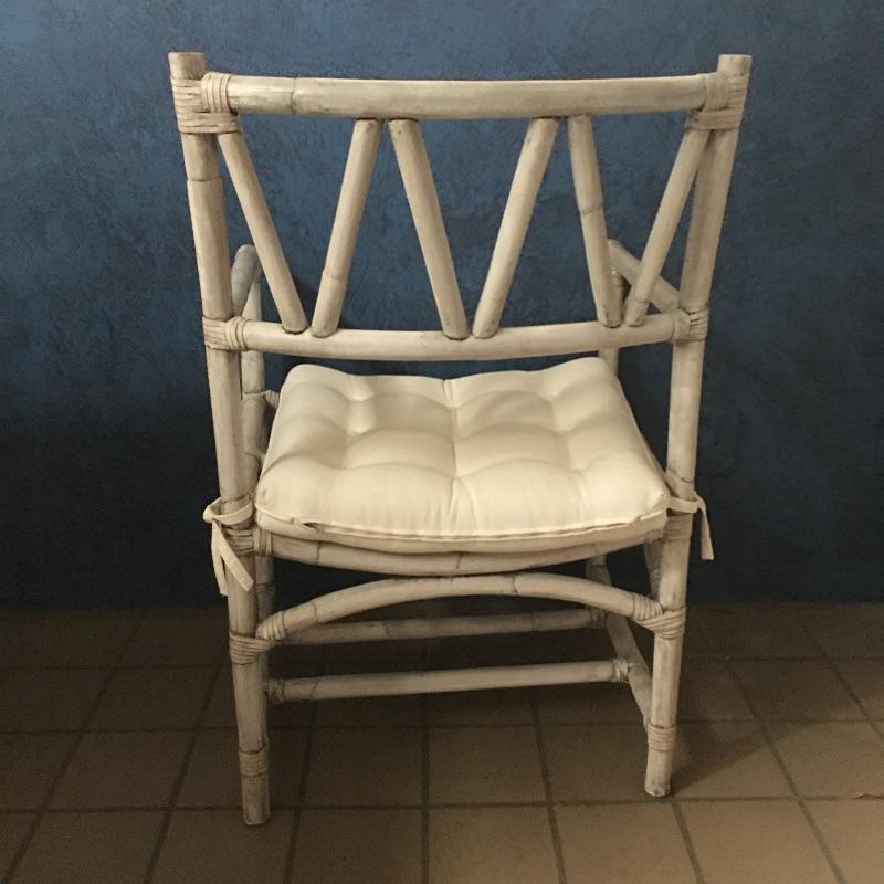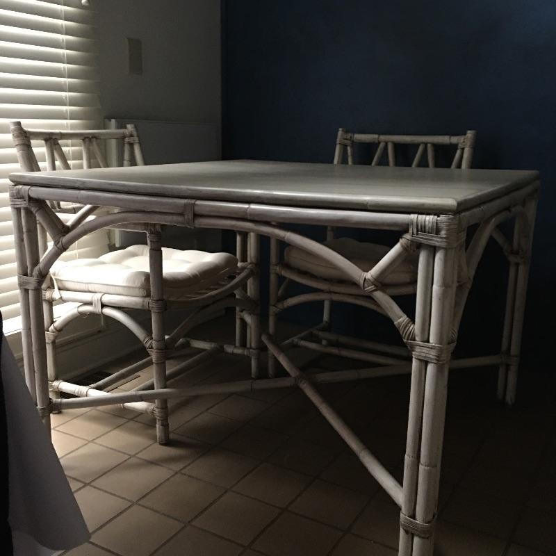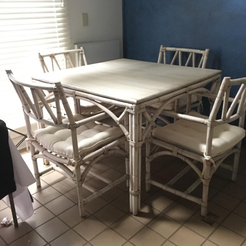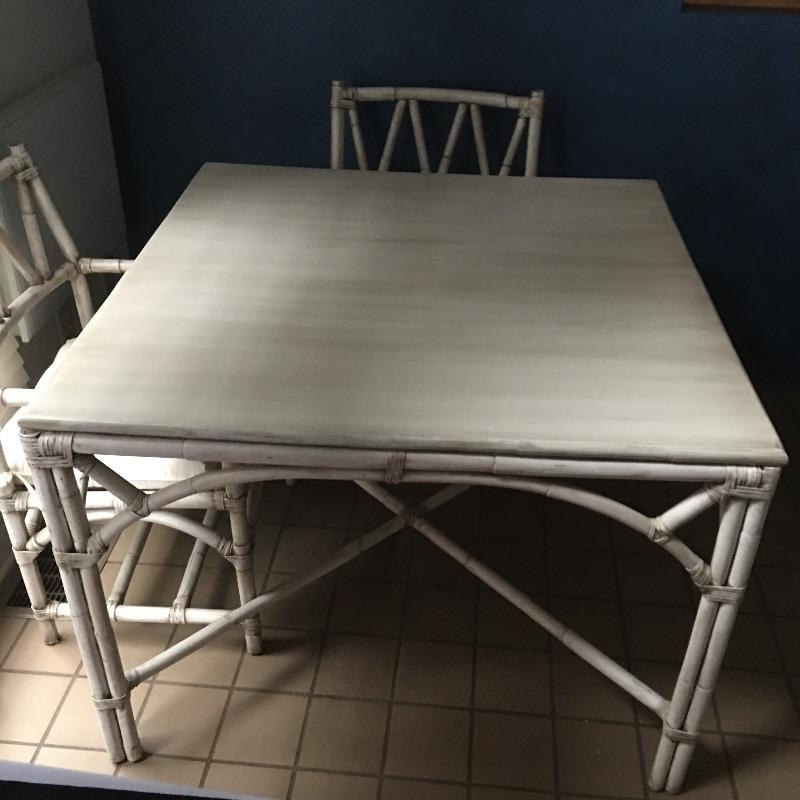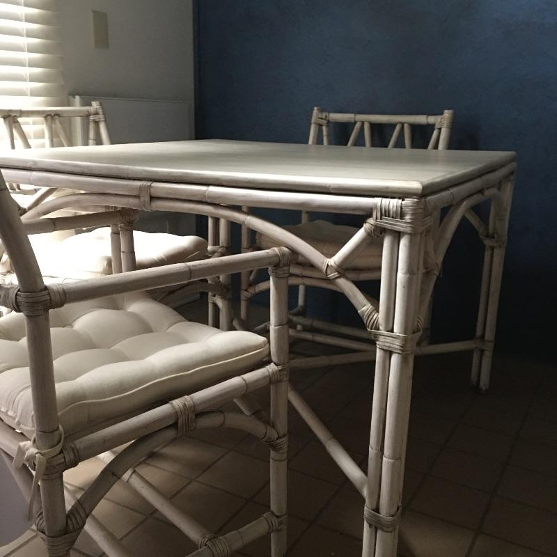 Bamboo table and four chairs with removable cushions. Lovely table and chairs for the coastal feel anywhere you want it. Has a grey wash look to the finish and table top is All wood frame with wood panel and laminate. Pieces are light weight.