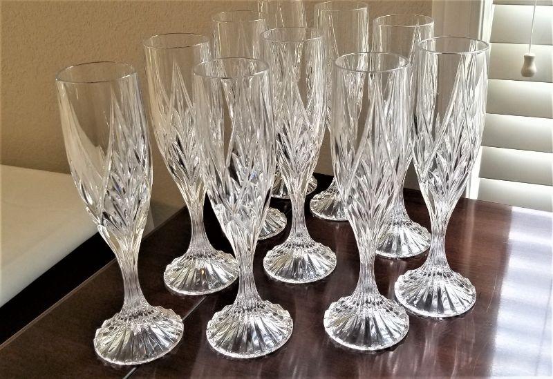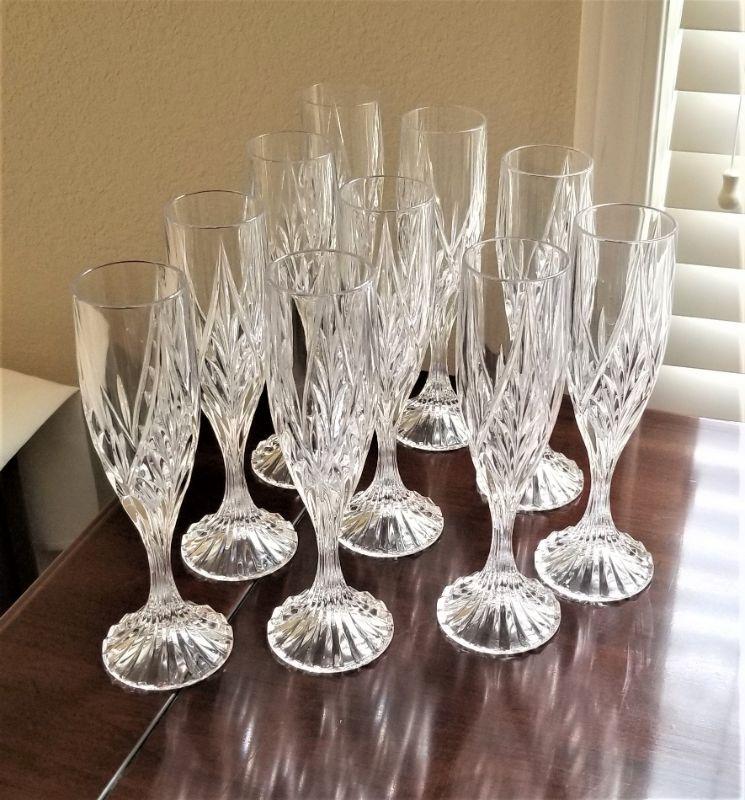 Set of 10 nice champagne flutes - no maker's mark. Good condition - each stand 8.75" tall. No box.