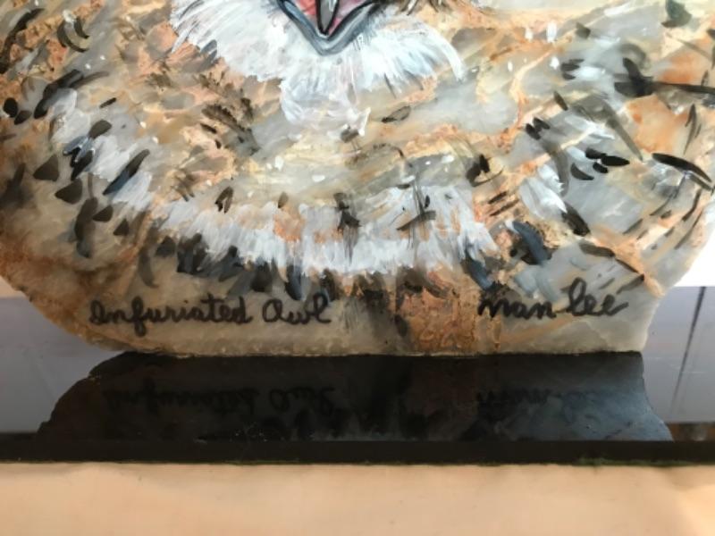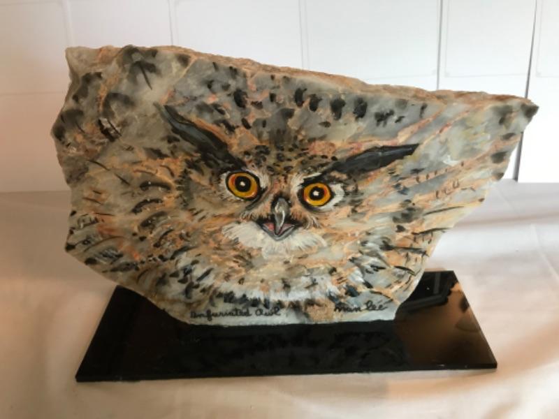 Signed “Infuriated Owl” painting on stone by Nan Lee Roberts, a listed artist Local to Talbot County. Stone slab measures 9” tall on a base that is 12” long and 4” deep