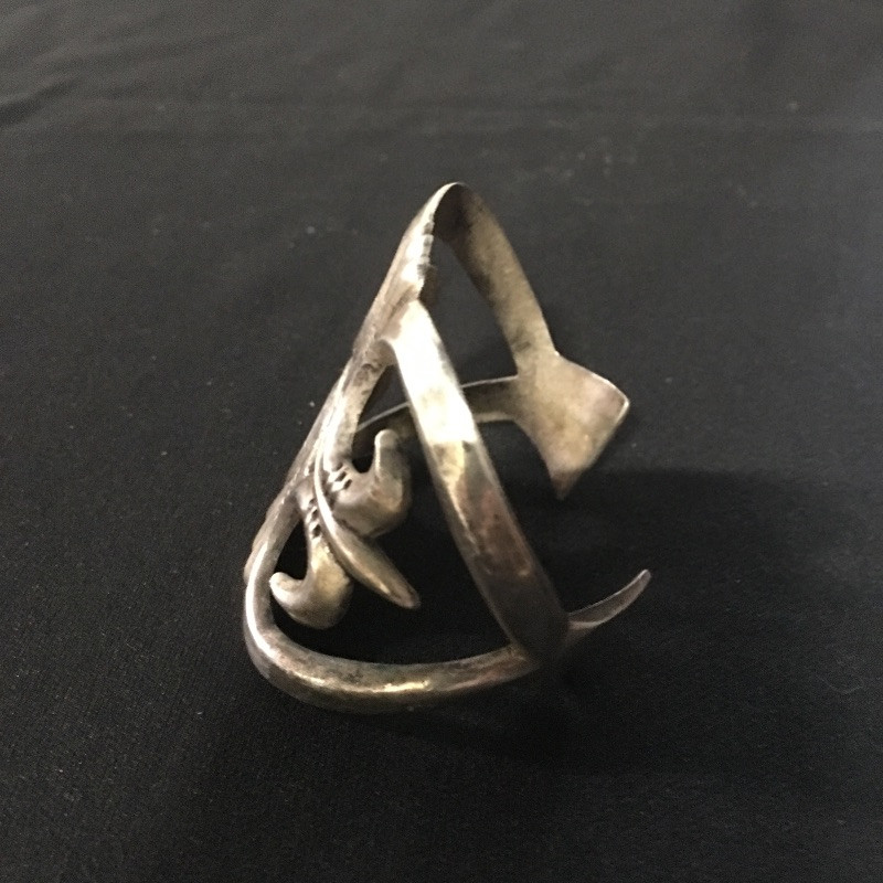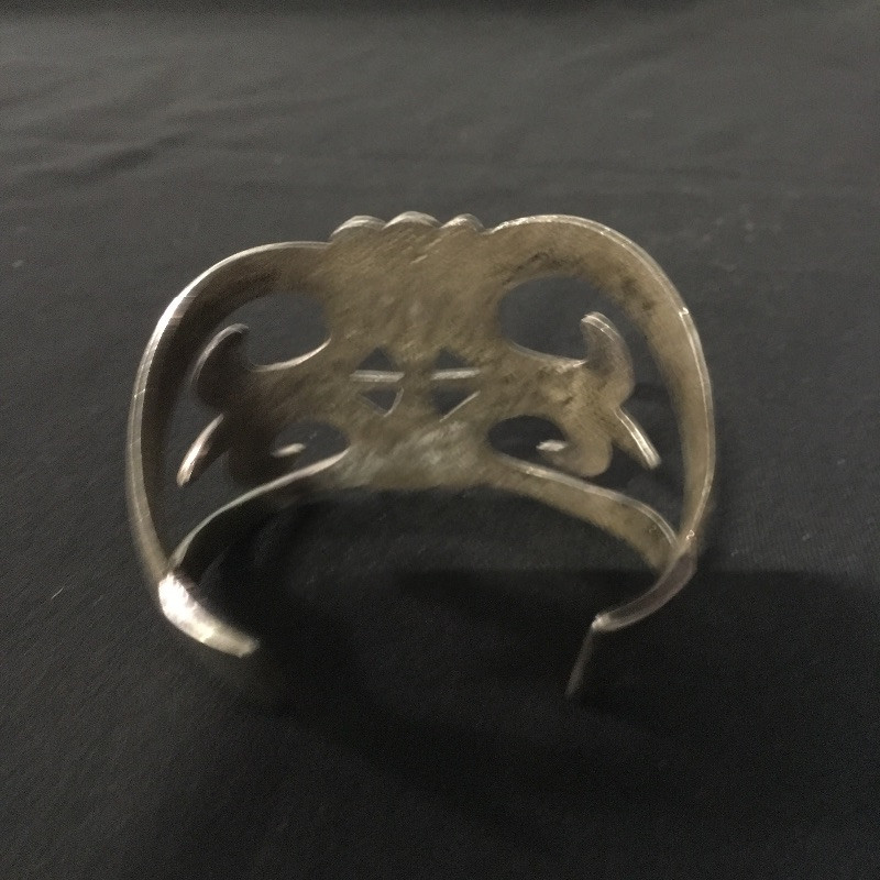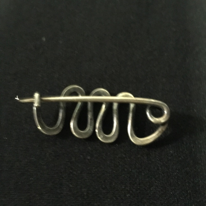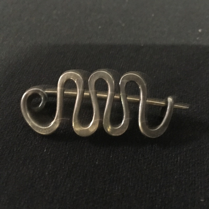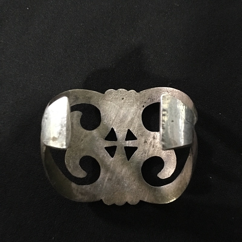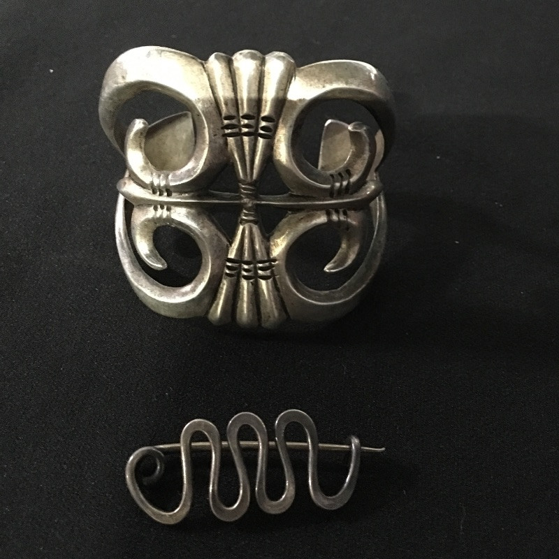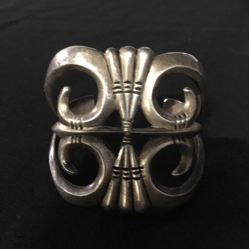 Add some elegant somewhat contemporary pieces to your jewelry collection with these two pieces. The cuff appears to be silver coated and the pin is sterling silver. Cuff measures 2.375” tall and 6” around.