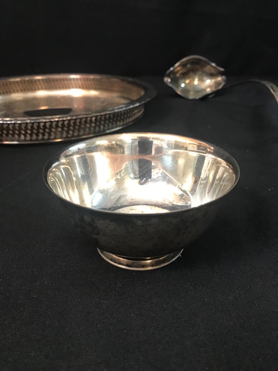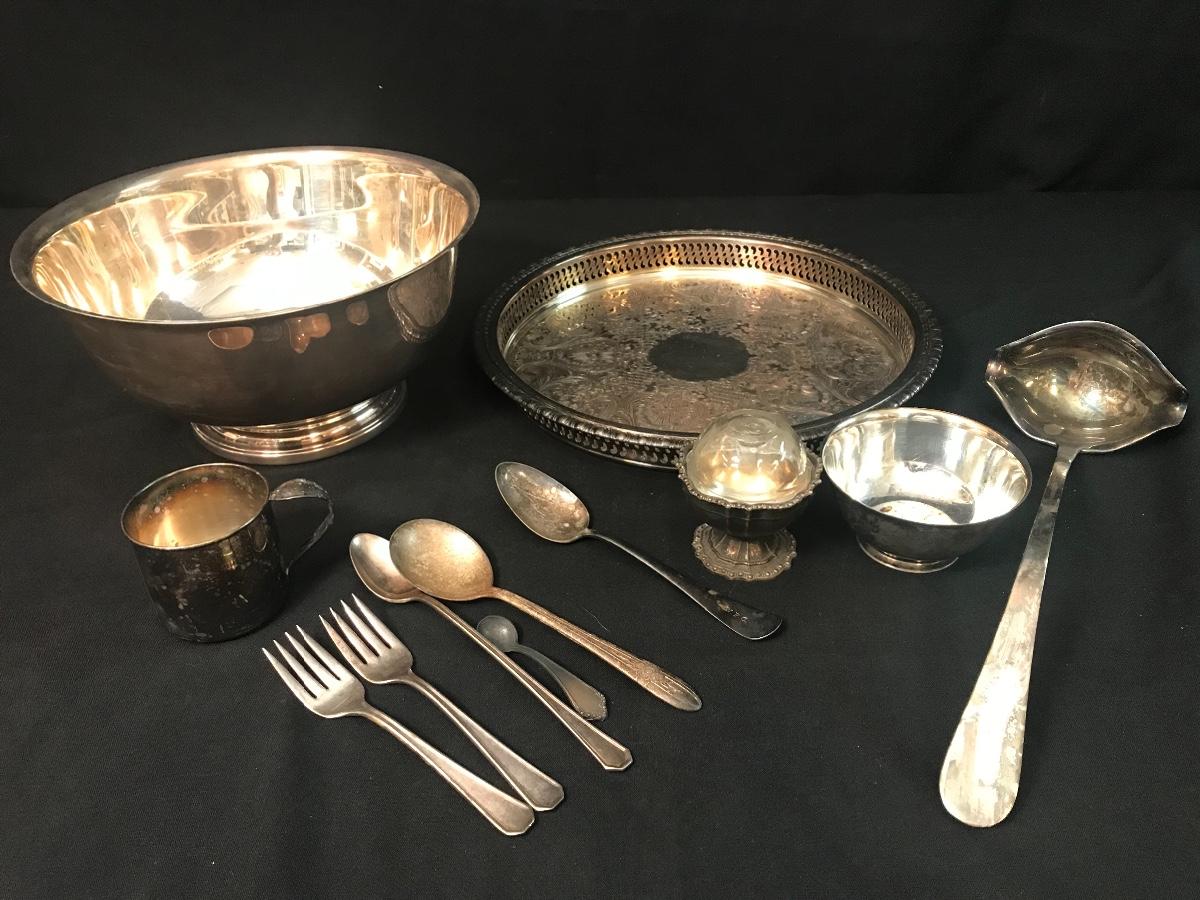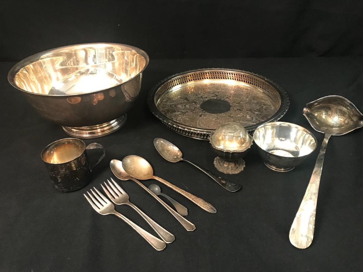 Lot of silver plated items - trays, bowls utensils. Please see all pictures as they are the best representation of the items. The pictures show condition, measurements if taken, and what is included in the lot. Due to the large amount that we photograph and the time frame, we are not always able to take measurements. All items unless noted, are pre-owned and have been used. If you purchased furniture, you must bring help. We do not allow one person to carry large furniture out on their own. Bring help, tools and a truck for the safety of our client’s homes, and your personal safety. Company policy. Thank you.