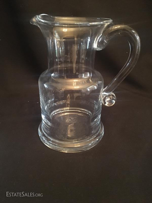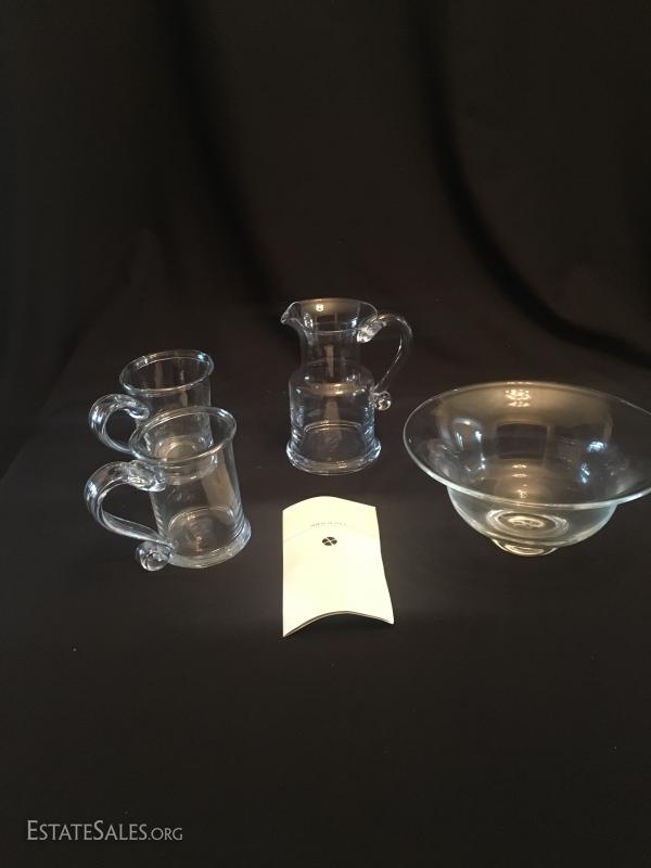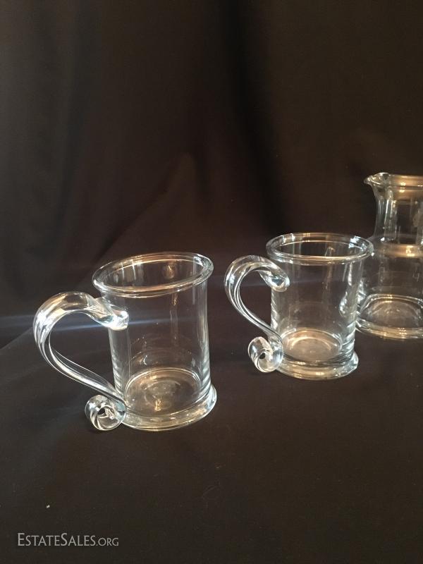 Beautiful hand blown glass by Simon Pierce. Lot includes two mugs, small pitcher and a bowl.