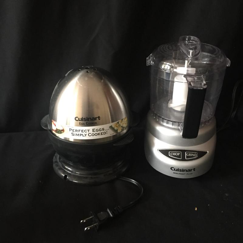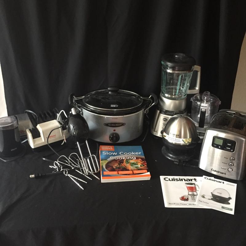 Cuisinart Toaster, Blender, Egg cooker and Mini Prep plus. Also includes a Hamilton Beach slow cooker, Krups coffee grinder, Pair of knife sharpeners and a Oster mixer. Upgrade your kitchen tools!