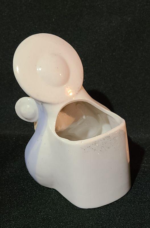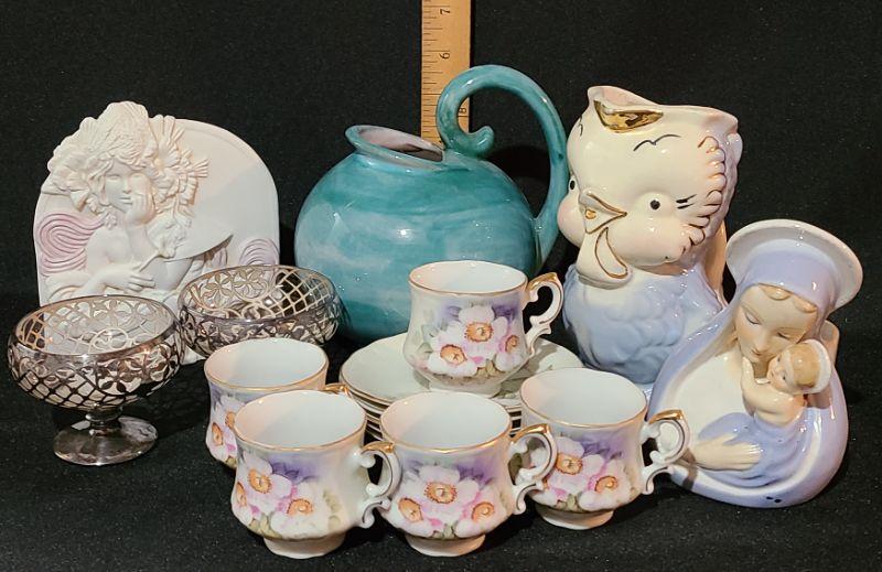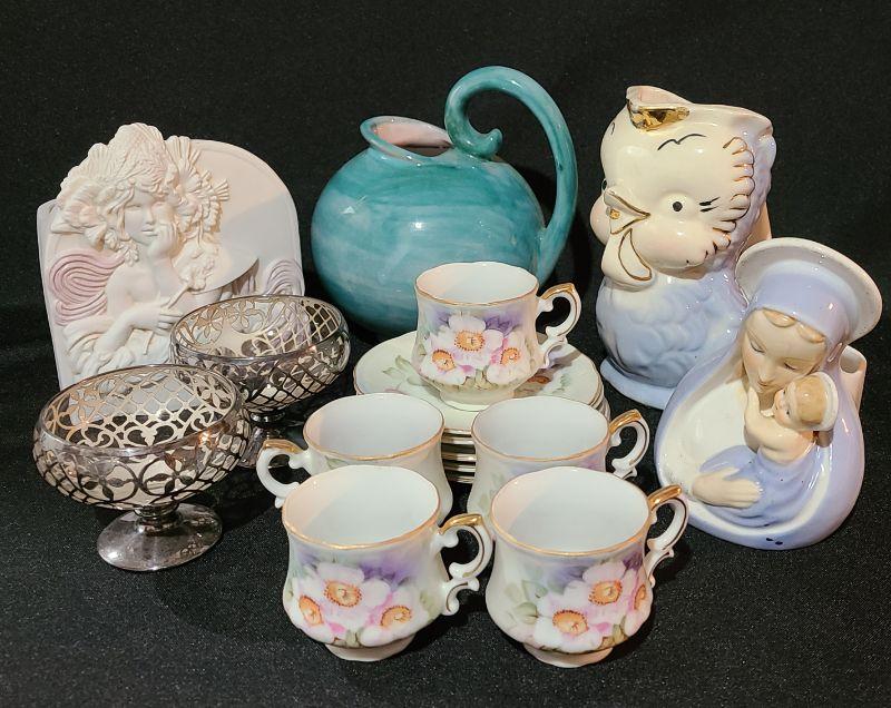 This is a beautiful lot that includes: Stangl 6 inch ball pitcher teal in color, a porcelain tealight/vase that glows though when candle is inside, Victorian silver lace cordial glasses, Lefton Magnolia Demitasse cups and saucers, Chick Creamer, and Madonna with child small planter/ tealight holder.