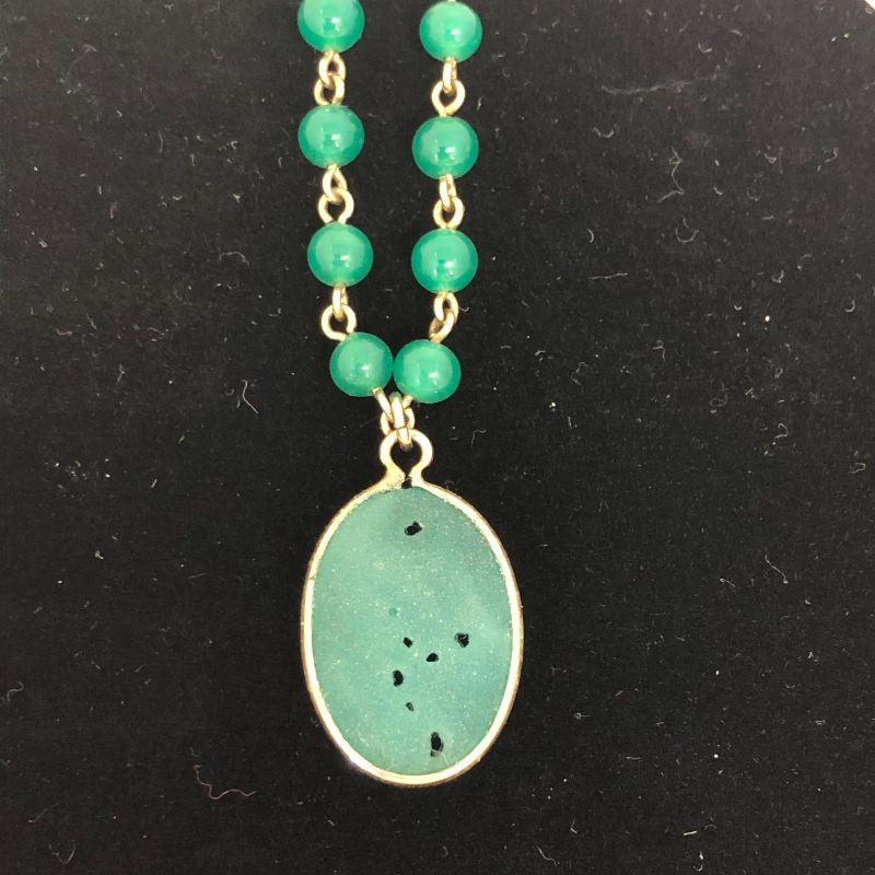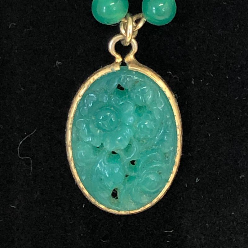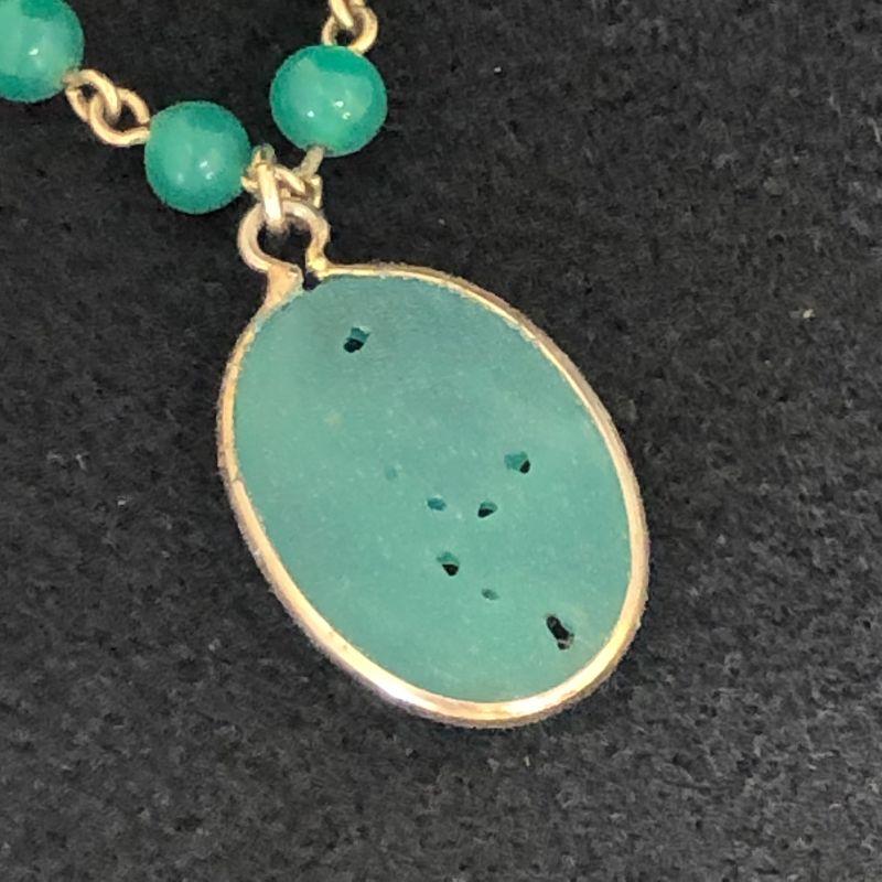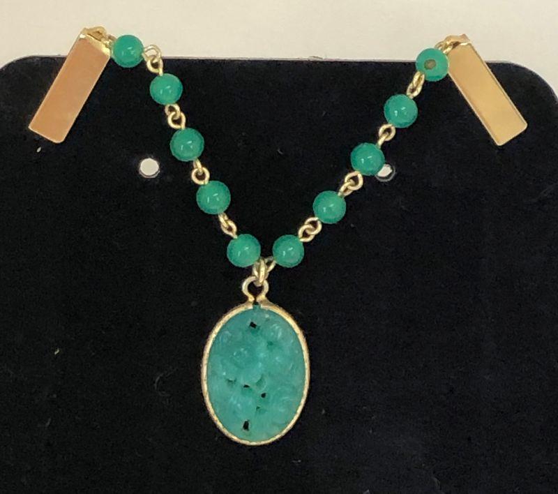 This is a very pretty sweater accessory that has the look of jade. I don't know how to tell the difference between real and faux jade so it's being listed as "the look of". The spot that you see on one of the beads is not damage, it was something that I didn't see at the time of the picture and it has been removed. The chain is 5.5" long and the pendant is 1" long.