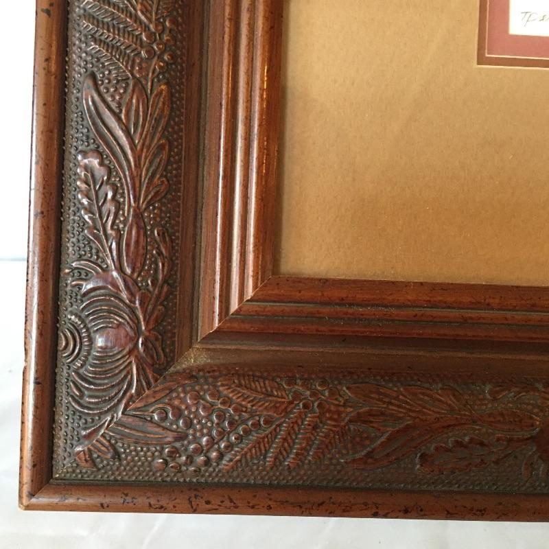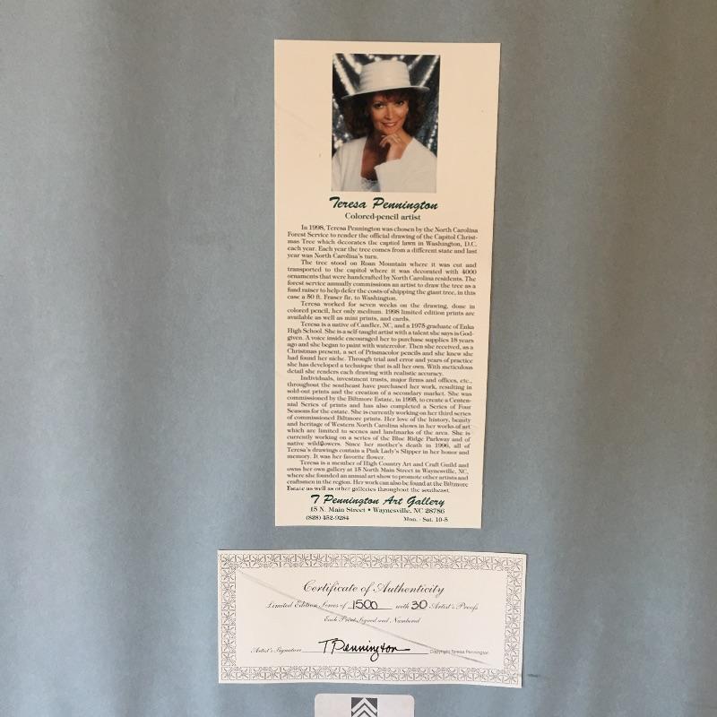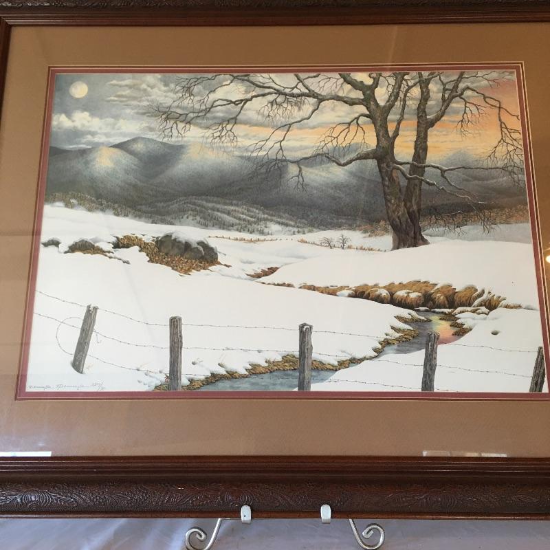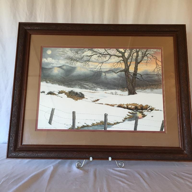 This matted, numbered and signed artists print by Teresa Pennington is framed in a wooden frame with a intricate design. Print is Artist Proof number 7 of 30. It is a fabulous snow scene with moody mountains and a peak of a sunset.