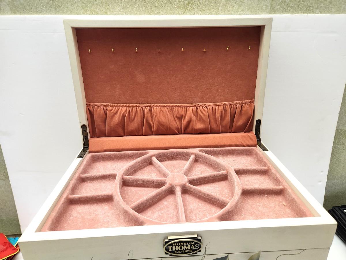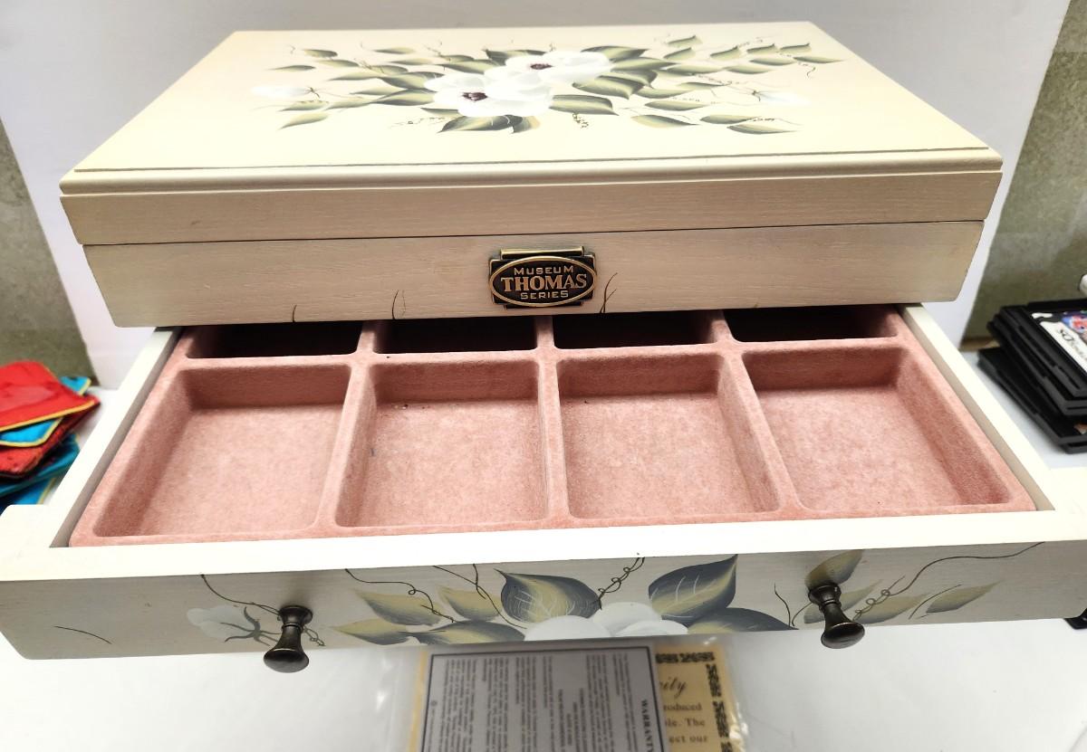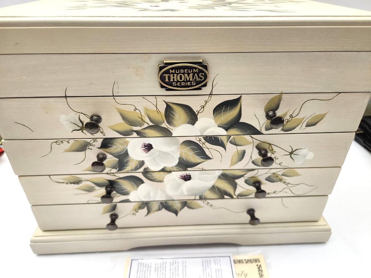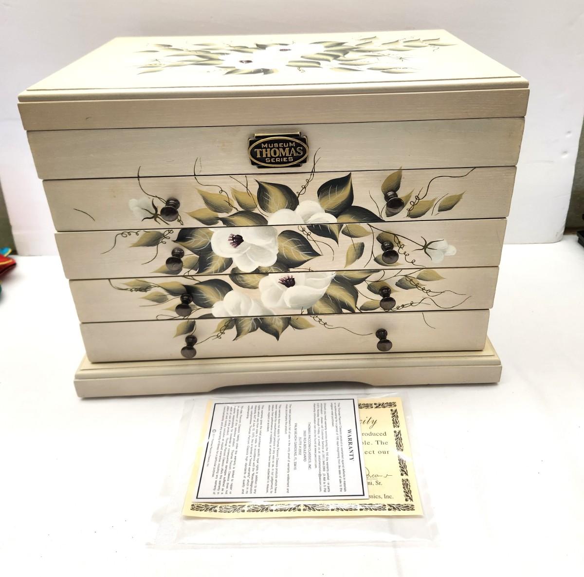 Lovely Thomas Pacconi Jewelry Box - 4 drawers/top compartment - Pink velveteen interior, brass handles - painted magnolia motif on front. Very pretty. 15" across, 11.25" tall, 9.25" deep. Good gently used condition.