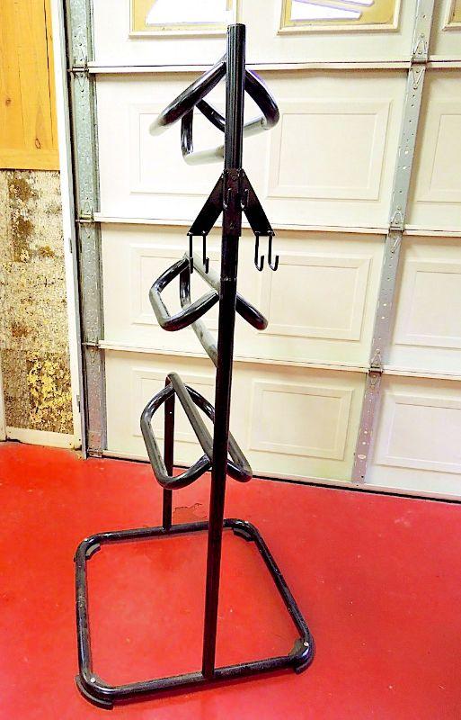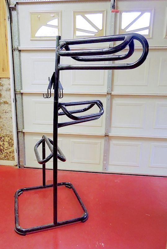 70" h. Base is 29" x 30". Heavy duty 1-1/2" tubular frame that comes coated with a black glossy finish. has three hooks for hanging tack. Each tier rotates for easy access. Padded feet. In very good condition with little evidence of use.
